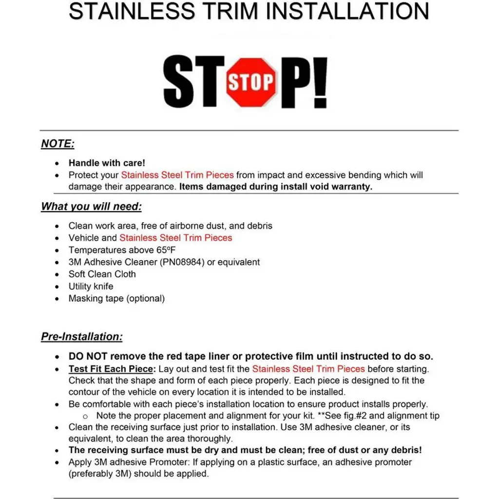 MOLDING INSERT, and BODY ACCENT Accessory Trim is pre-formed for each vehicle model from a Highly Polished Stainless Steel, with a full 3M acrylic foam adhesive backing to enhance the look of your vehicle. All of QAA's stainless steel products are created from inception to packaging by our team of professionals, on location in Westford, Mass. Body Molding Insert and Accent Accessory Trim is polished to a mirror shine, giving it a CHROME look. The polished surfaces are protected by a plastic film to be removed after installation. All of QAA's Stainless Steel Trim products are easy to install with a "peel and stick" application of the pre-applied 3M tape on every piece; no drilling, cutting or alterations are required. The bond is water tight and will last a lifetime.