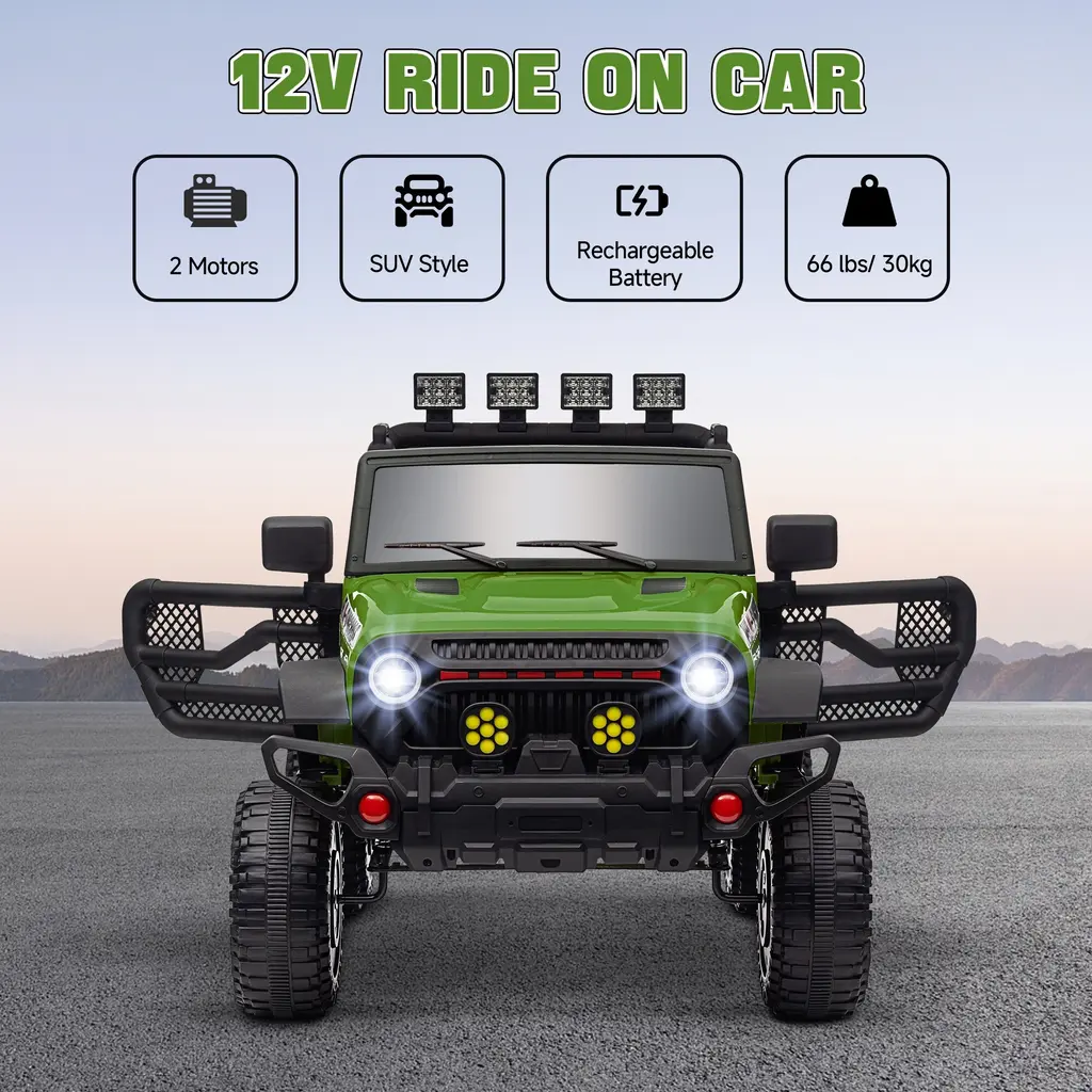 Descriptions:Unleash the fun with the Qaba 12V kids UTV, a sleek ride-on car featuring 2 motors and a cool SUV design. Equipped with a shock-absorbing system and a smooth, slow start for safe driving, this kid's electric car offers three adjustable speeds via remote control. Plus, it includes Bluetooth and music capabilities for a ride they can really rock out to.● 12V kids UTV with 2 motors for powerful performance;● SUV-inspired design ensures a stylish, adventurous ride;● Shock-absorbing wheels enable a smoother, steadier drive;● Slow start mechanism enhances safety by reducing jerkiness;● Three adjustable speeds with remote control for varied fun;● Kids can drive independently, fostering a sense of independence;● It includes Bluetooth, music, and horn for interactive fun;● Assembly is needed.● Color: Green;● Materials: Polypropylene, Steel;● Overall Dimensions: 39.4" L x 24.8" W x 25.6" H;● Seat Size: 13.8" W x 7.3" D;● Seat Height: 11.8" H (to floor);● Wheels Size: Dia. 9.4";● Remote Distance: 65.6' L;● Battery: 12V 4.5AH;● Motor: 2 x 12V;● Charging Time: 8-12 hours (First). 6-8 hours (Regular);● Run Time: 45 min;● Speed: 1.6-2.2 mph;● Weight Capacity: 66 lbs.;● Qualified Age: 37-95 months;● Recommended Age: 37-60 months;● Item Label: 370-329V80GN;● Note 1: Always monitor your children while they are riding;● Note 2: Require 2 x AAA batteries for remote (not included);