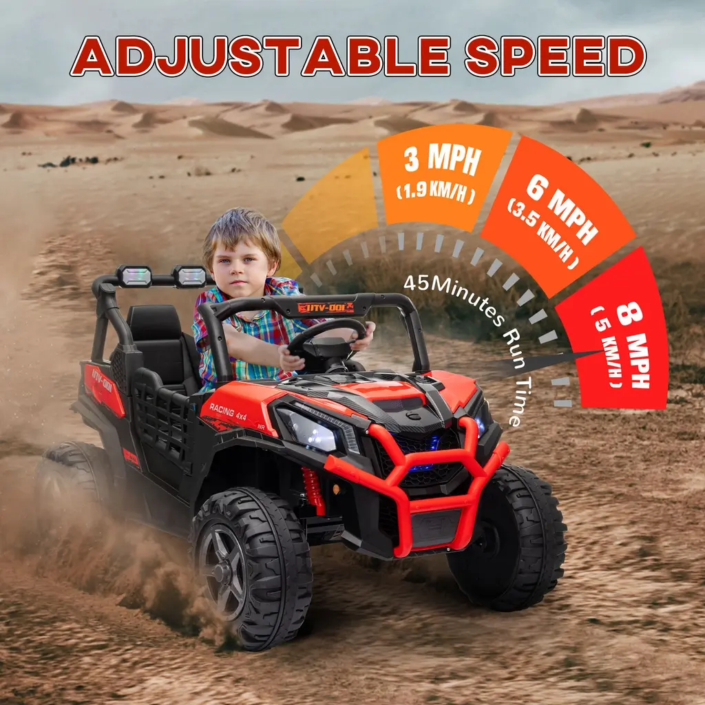 Descriptions:Bring home thrilling adventures with the Qaba 24V 2-seater ride-on car for kids. This electric car features two motors and a two-seater design with safety belts, ensuring a thrilling yet secure ride. Thanks to the spring suspension on the rear wheels, kids can enjoy up to 45 minutes of runtime and easily tackle any terrain. Little explorers eager to take the wheel can be guided by their parent via remote control.Features:● Dual motors provide powerful 24V performance for thrilling rides● Two seats with safety belts ensure secure fun for siblings● Spring suspension in rear wheels smooths out rides on various terrains● It offers three adjustable speeds, enhancing safety with a slow start function● Integrated music, horn, and lights for an entertaining driving experience● The power indicator shows the remaining battery, preventing unexpected stops● Assembly requiredSpecification:● Color: Blue● Materials: Polypropylene, Steel● Overall Dimensions: 47.2" L x 31.5" W x 29.5" H● Seat Size: 18.9" W x 8.1" D● Seat Height: 6.1" H (to floor)● Wheels Size: Dia. 12.2"● Remote Distance: ≥ 82' L● Battery: 24V 7AH● Motor: 2 x 24V● Charging Time: 8-12 hours● Run Time: 45 min● Speed: 1.9-5 mph● Weight Capacity: 132 lbs.● Standard Age: Over 3 years old● Recommended Age: 3-8 years old● Item Label: 370-342V80BU● Note 1: Always monitor your children while they are riding● Note 2: Require 2 x 1.5V AAA batteries for remote(not included)