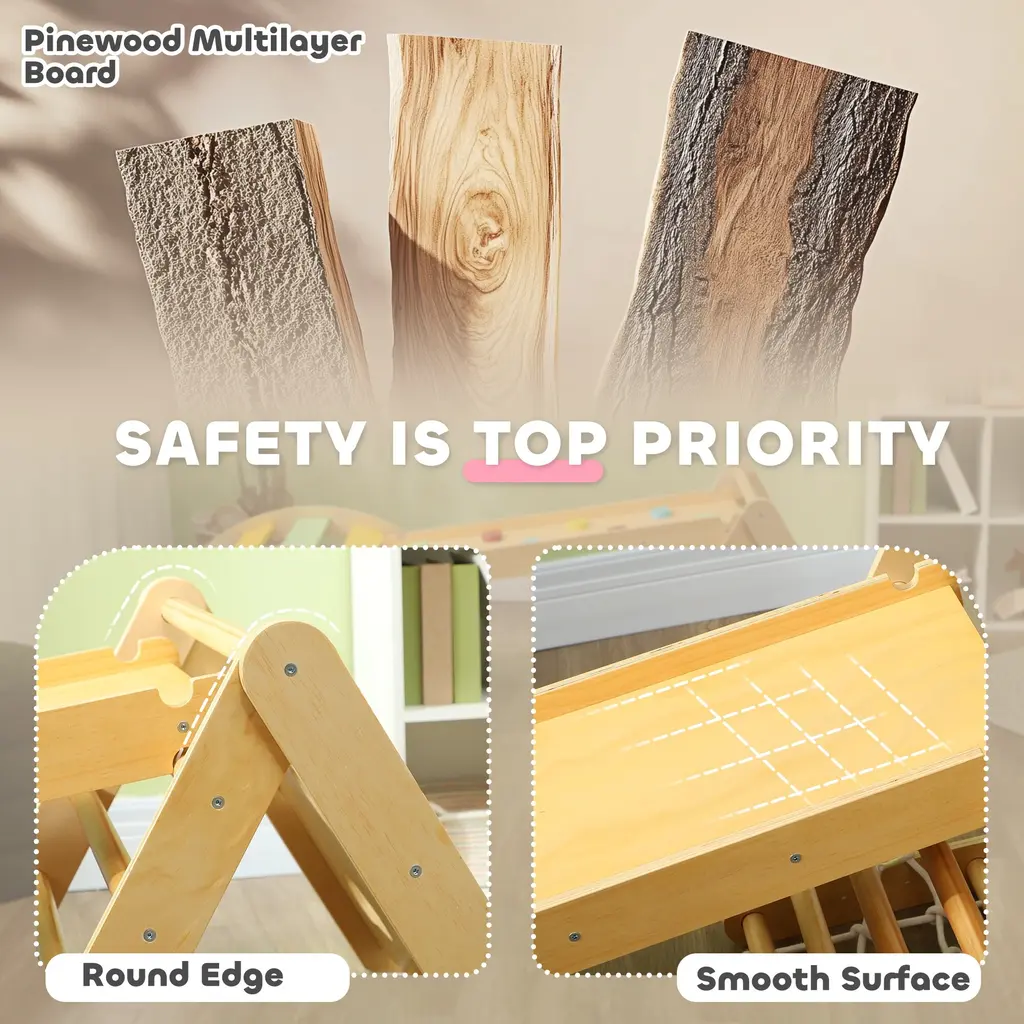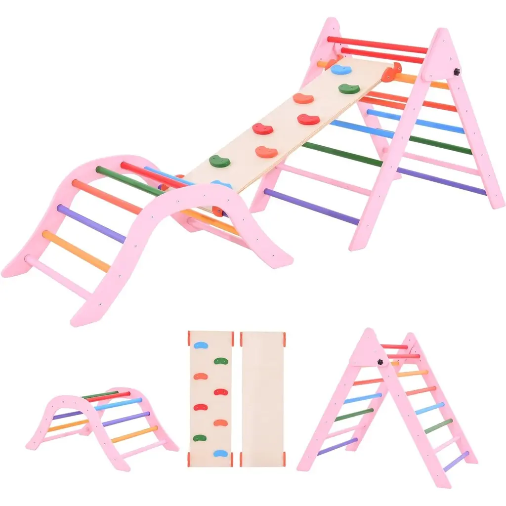 Descriptions:Unleash your toddler's adventurous spirit with the Qaba pikler set. This 7-in-1 montessori play gym includes a triangle climber with multiple sides for varied fun, an arch that doubles as a rocking chair, and a reversible ramp. Crafted from smooth pinewood, it ensures safe play indoors. Also, it adapts to your space, making it a must-have for any play room, day care or child's bedroom.Features:● This 4 in 1 design offers versatile play options● Includes a triangle climber, an arch and a reversible ramp● Safety-focused design with smooth, multilayer pinewood board● Maximum weight limit of 110 lbs., suitable for 18-48 months● The adjustable ramp angle caters to different ages● Designed for safe indoor use● Assembly requiredSpecification:● Color: Multicolored● Materials: Pinewood multilayer board● Overall Dimensions: 66.1" L x 24.6" W x 22.4" H● Arch: 35.4" L x 20.5" W x 17.7" H● Ramp: 34.6" L x 14.4" W● Triangle Climber: 24.6" L x 25.6" W x 22.4" H● Climbing Stone: 3.1" L x 2" W x 0.6" H● Sandbag: 2" L x 2" W● Maximum Load: 110 lbs.● Standard Age: 18+ Months● Recommended Age: 18-48 Months● Item Label: 331-065V00MX