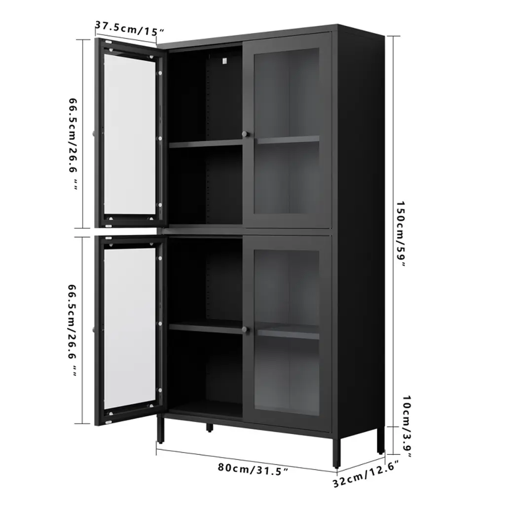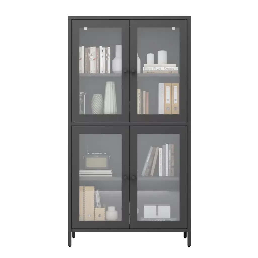 Qingmoon Metal Storage Cabinet, Display Storage Rack, With 4 Glass Doors, Adjustable Shelves And Raised Legs For Office, Living Room, Flat