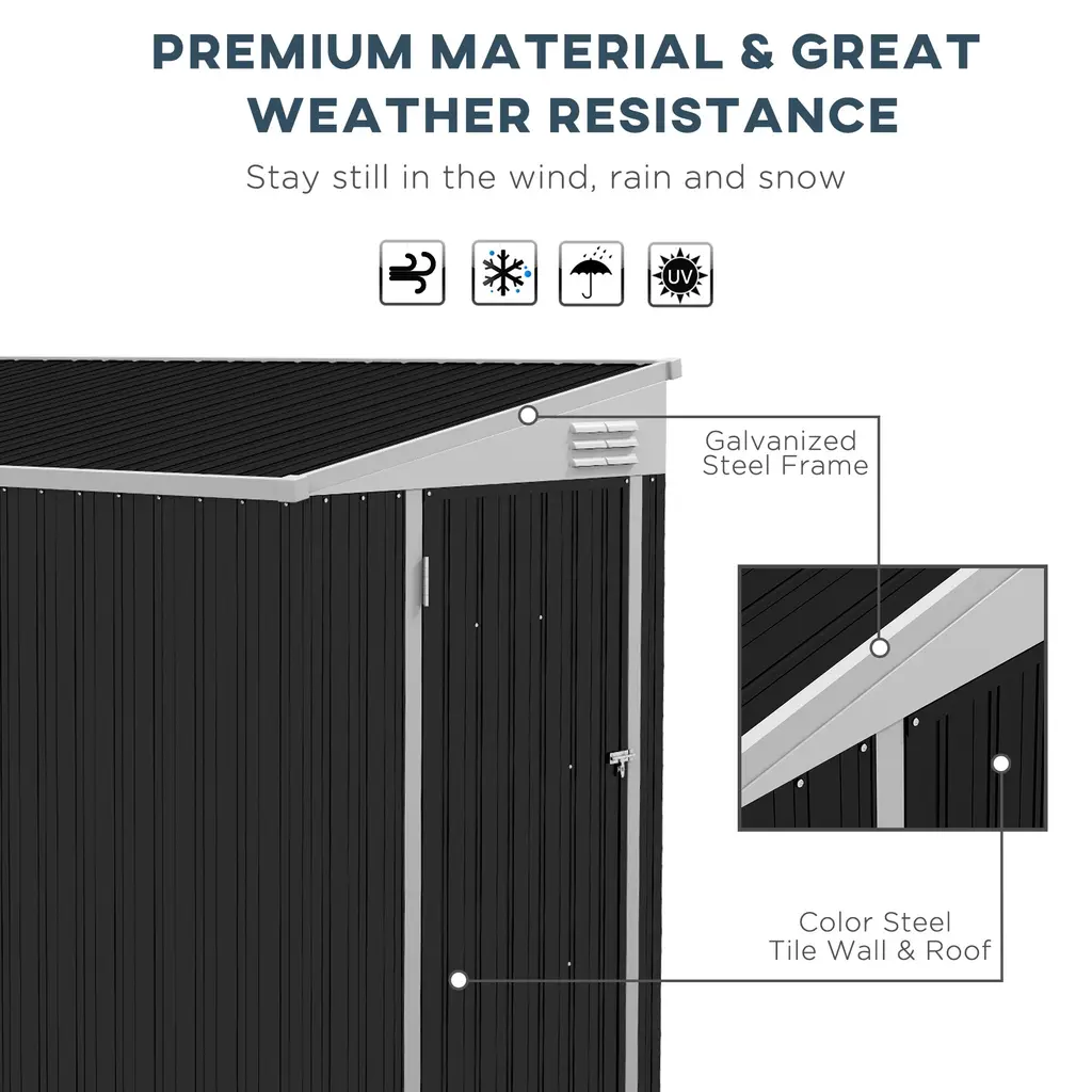 Features:Outdoor Shed Kit: Our outdoor storage shed means plenty of space for your mower, motorcycle, ladders, bikes, garden tools, and other lawn care equipment.Small, Space Saving, Lockable: A lock on the door keeps dangerous and expensive tools away from would-be thieves. Due to its lean-to design, our garden shed can use other structures as additional support.Vents Included: Our garden tool shed features two air vents on the front and rear, which keep the interior cool and mitigate musty smells.Metal Shed: This metal shed was crafted from strong galvanized steel to create a surface capable of withstanding sun, wind, rain, and snow. A low-maintenance solution: set it up and watch it go.Metal Outdoor Storage Shed Kit: Overall Dimensions: 51.25" W x 92.5" D x 64.5" - 72.75" H. Inside Dimensions: 45.25" W x 85.75" D. Include installation gloves to protect your hands.