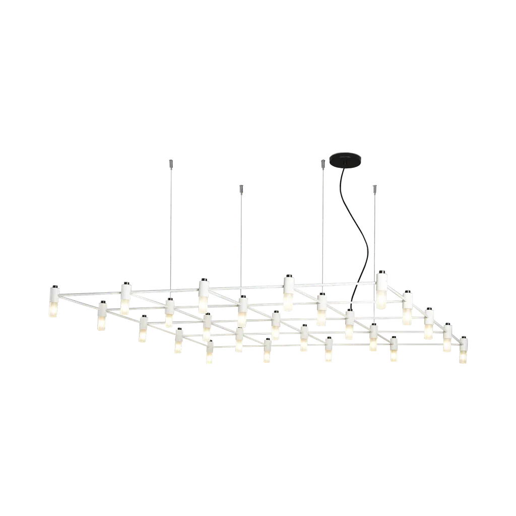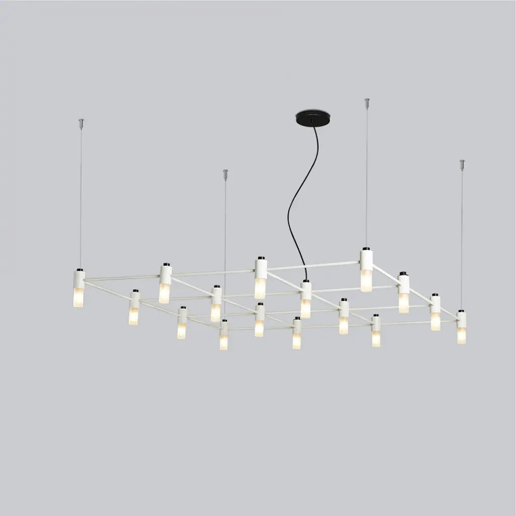 Modular suspension made of welded and powder coated steel pipes. The possible configurations are numerous and create a system of bright grids.