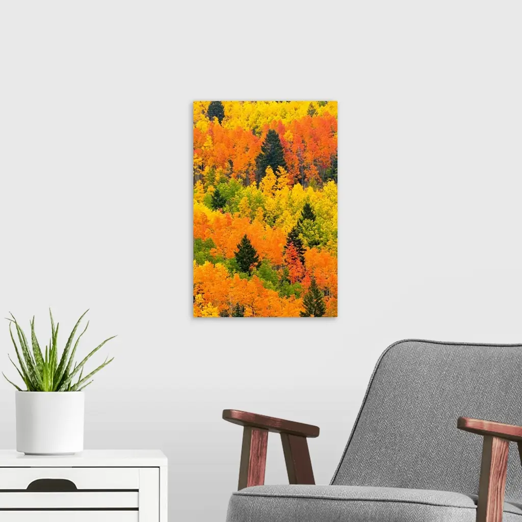 Vertical photograph from the National Geographic Collection of a vibrant, dense forest of quaking Aspen trees (Populus tremuloides), in fall colors near Santa Fe, in the Santa Fe National Forest, New Mexico.