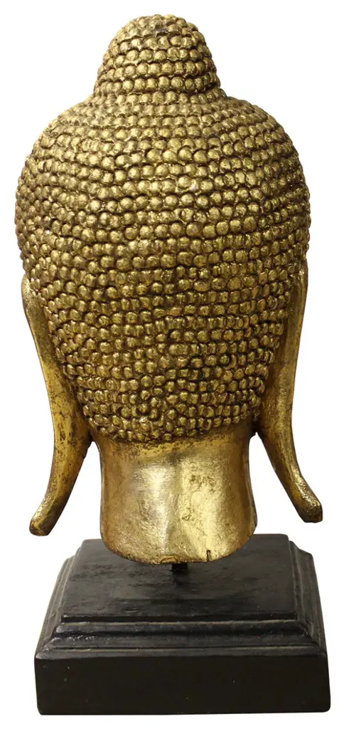 Master handcrafted Buddha head on stand, this statue is carved with solid wood painted with gold color, decorate with color stone. Buddha is in deep meditation with full wisdom. It is a great table top display statue for any room, good for Feng Shui and reminder for our daily life. Dimension: w6.5" x 6.5" x h11.5" (on stand 14.25")Origin: ChinaMaterial: Wood