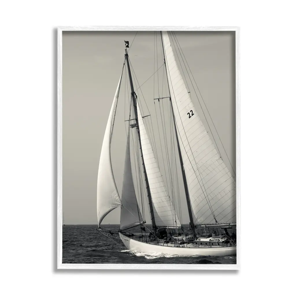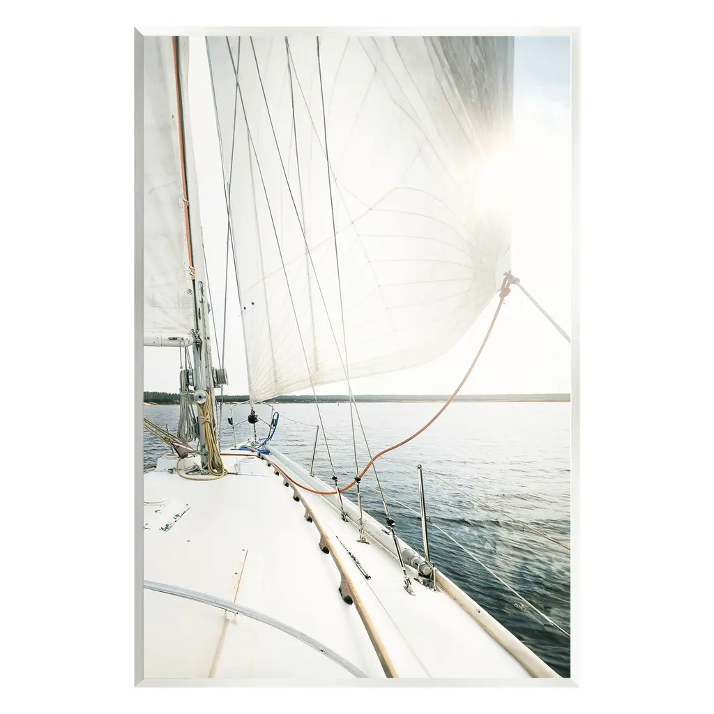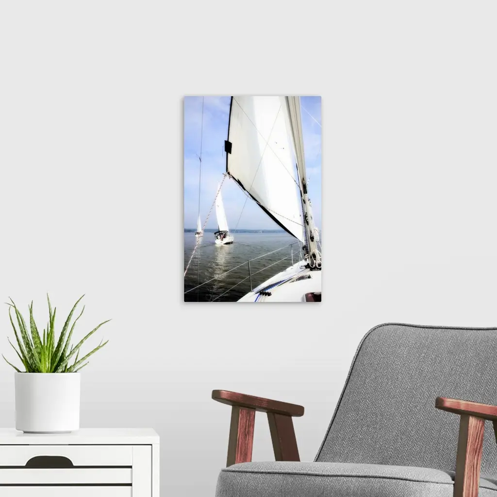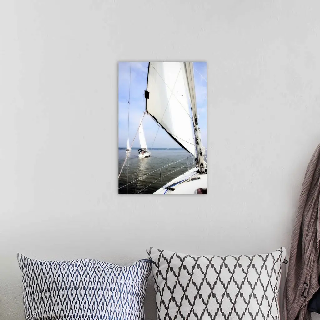 Big vertical photograph of a sail and the front of a sailboat, looking out toward the water where two other sailboats are ahead, beneath a partly cloudy blue sky.