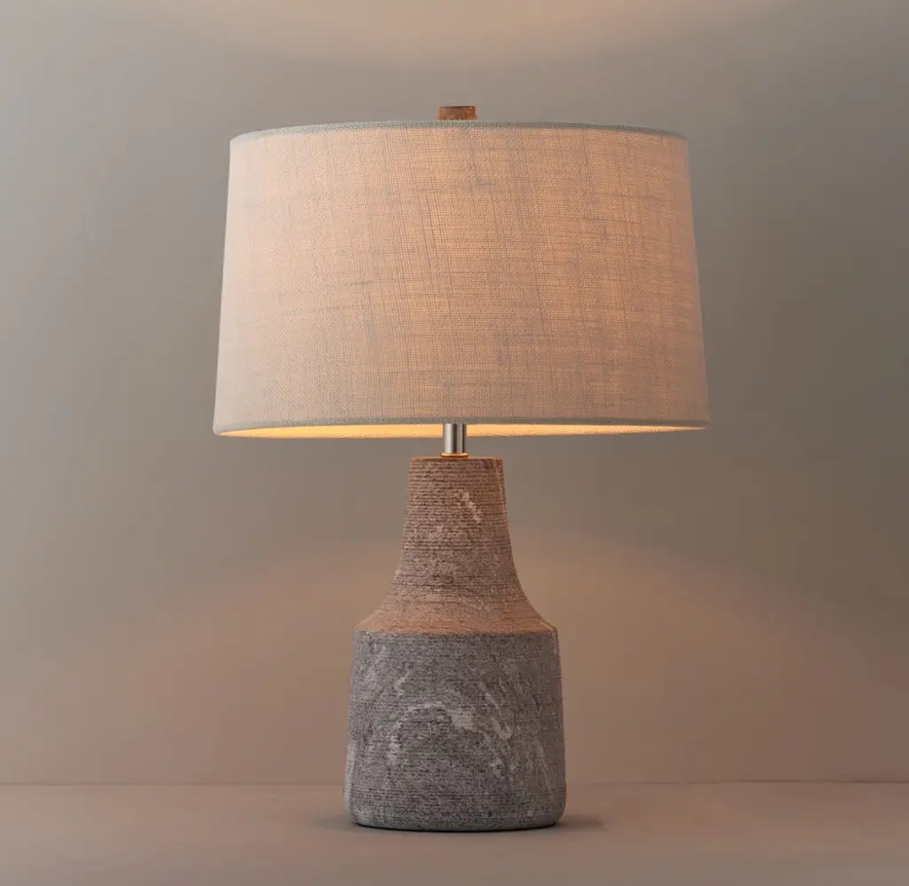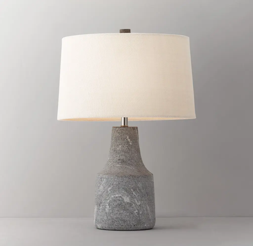 A modern interpretation of the ancient art of stone carving. Perfectly honed, our marbled stone lamp showcases the material's natural veining and color while lending weight and stability.