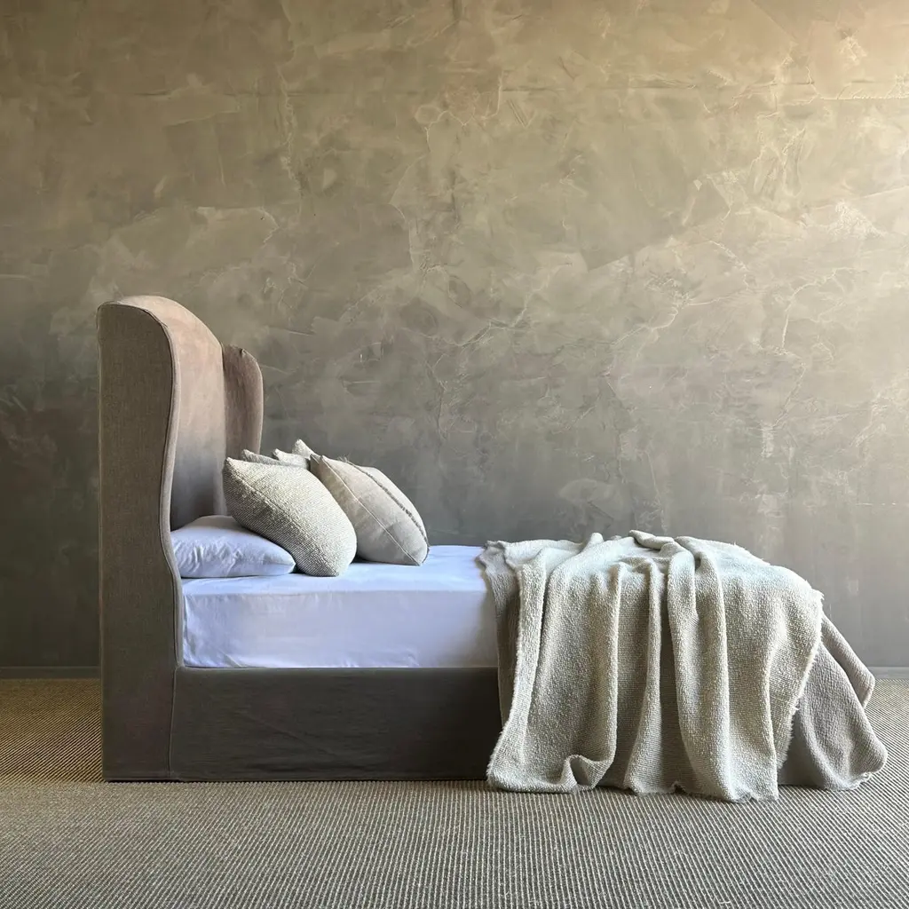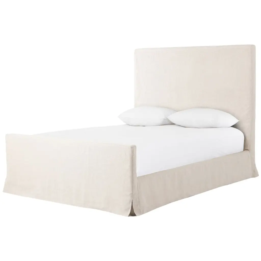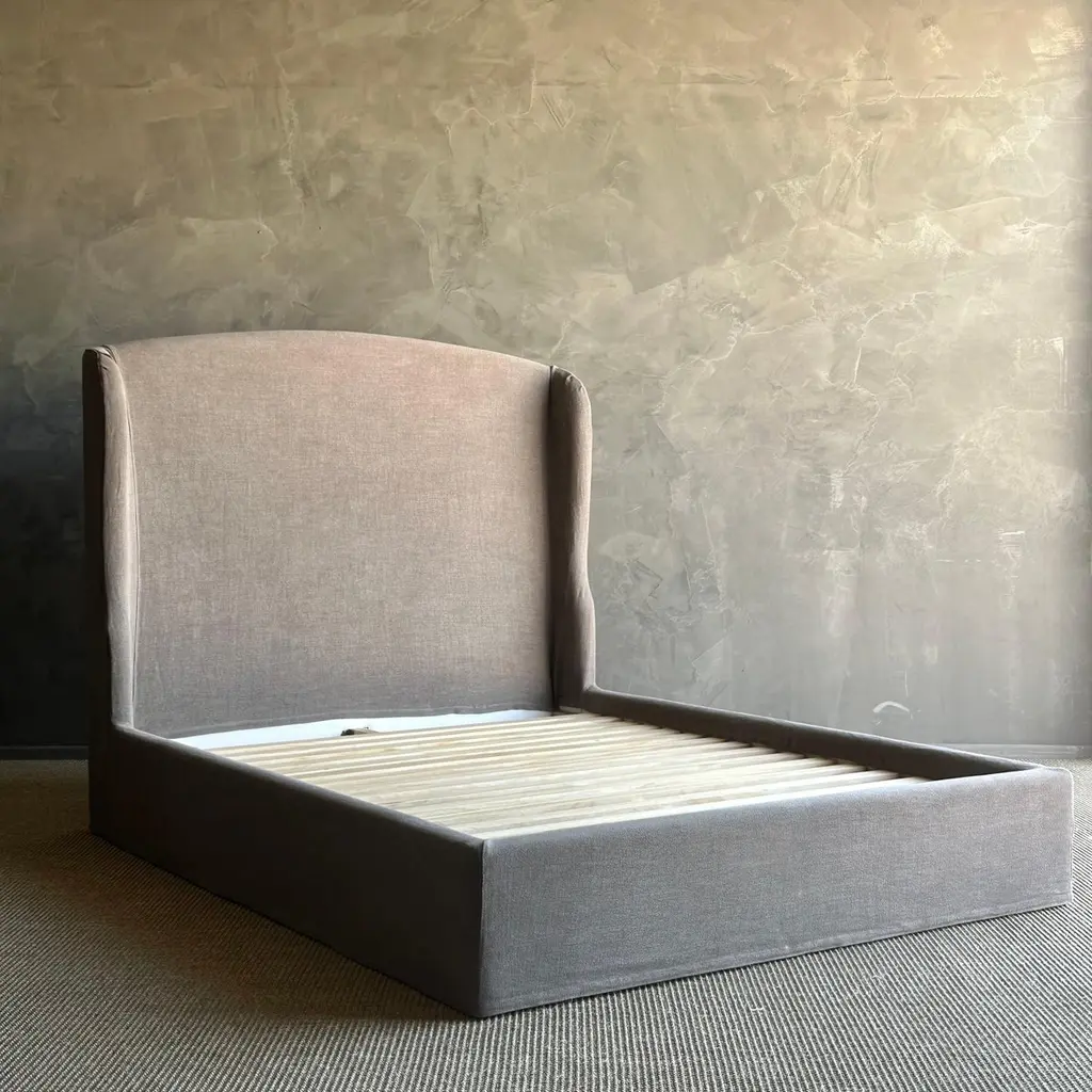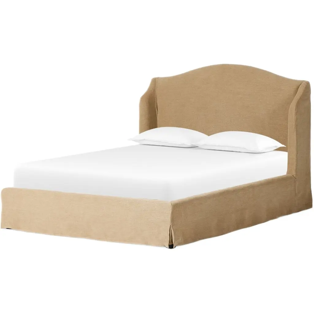 Introducing the Brussels Slip Covered Bed crafted with beautiful 100% linen in a taupe grey shade called Ecorcé. The slip covred linen bed offers a relaxed yet sophisticated allure. The stone wash finish adds a touch of elegance. The slip cover is removable for easy cleaning or to switch up your decor style. Additional slip covers are available for a fresh look anytime. Our beds are designed with a sturdy wood slat foundation and center support, eliminating the need for a box spring or foundation. Experience the comfort and versatility of the Brussels Slip Covered Bed for a blend of style and functionality in your bedroom.87″D x 66″WHeadboard 60″ HFoootboard 13″HRail Height 13″Clearance under rail: NONEInterior 61″ x 81″wood slats rest 3" below the rail height3600