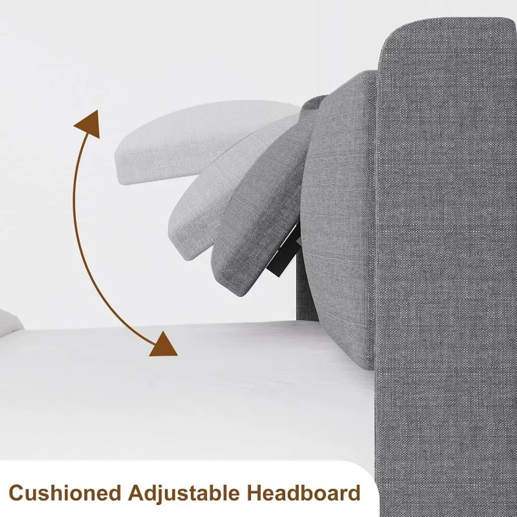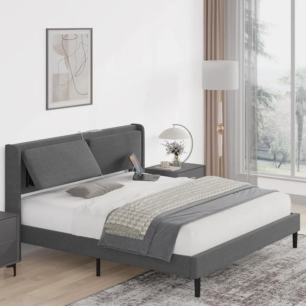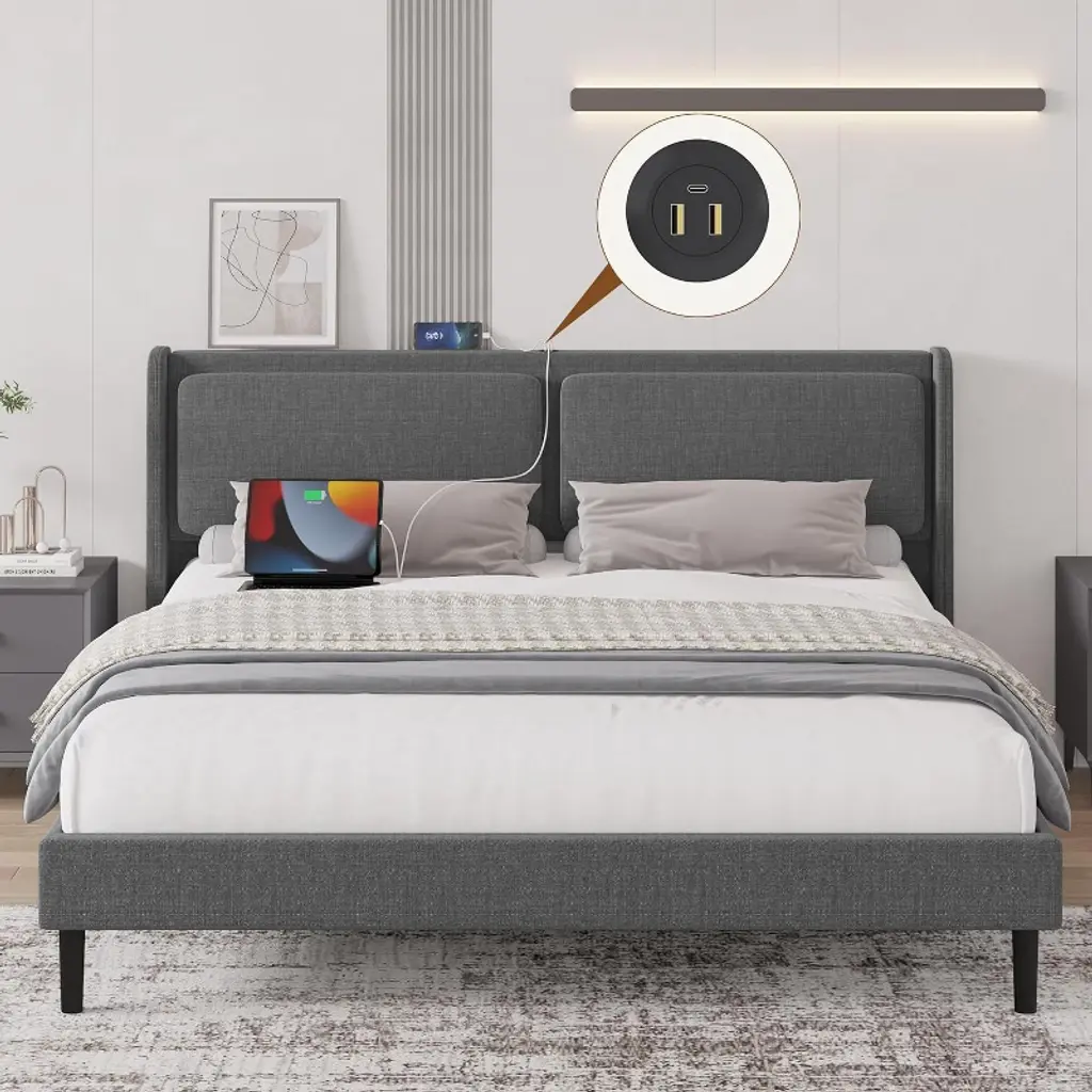 Upgrade your bedroom with this modern upholstered queen bed frame featuring 2 built-in USB charging ports for convenient nighttime charging. Designed with a height-adjustable linen headboard, this bed frame brings comfort and functionality together. The solid wood slats and reinforced steel structure provide excellent mattress support—no box spring required. Its sleek gray fabric upholstery complements a variety of bedroom styles, making it a stylish and practical centerpiece.