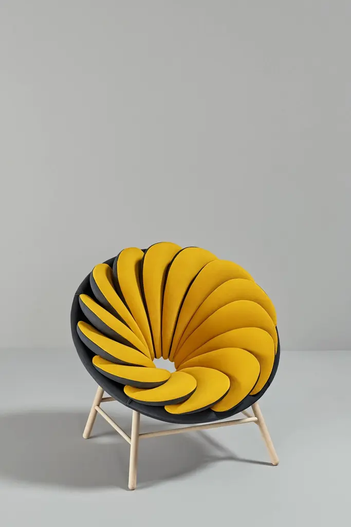 Quetzal surprises, attracts and traps, evoquing on us the same magical feeling and the same admiration with which we watch the Quetzal bird taking off and flying into the sky in its natural habitat.14 overlapped bicolor pillows manage to create an amazing visual impact and provide the product with the unique feature of being able to change the main color of the armchair in the blink of an eye.The color duality makes it an extremely versatile, visual and interactive design.Dimensions: 90 x 100 x 100 cmMaterials: Iron structure.Structure stuffed with polyurethane 25kg.Cushions stuffed with polyurethane TXED40 covered with polyester fibre.Wooden leg.