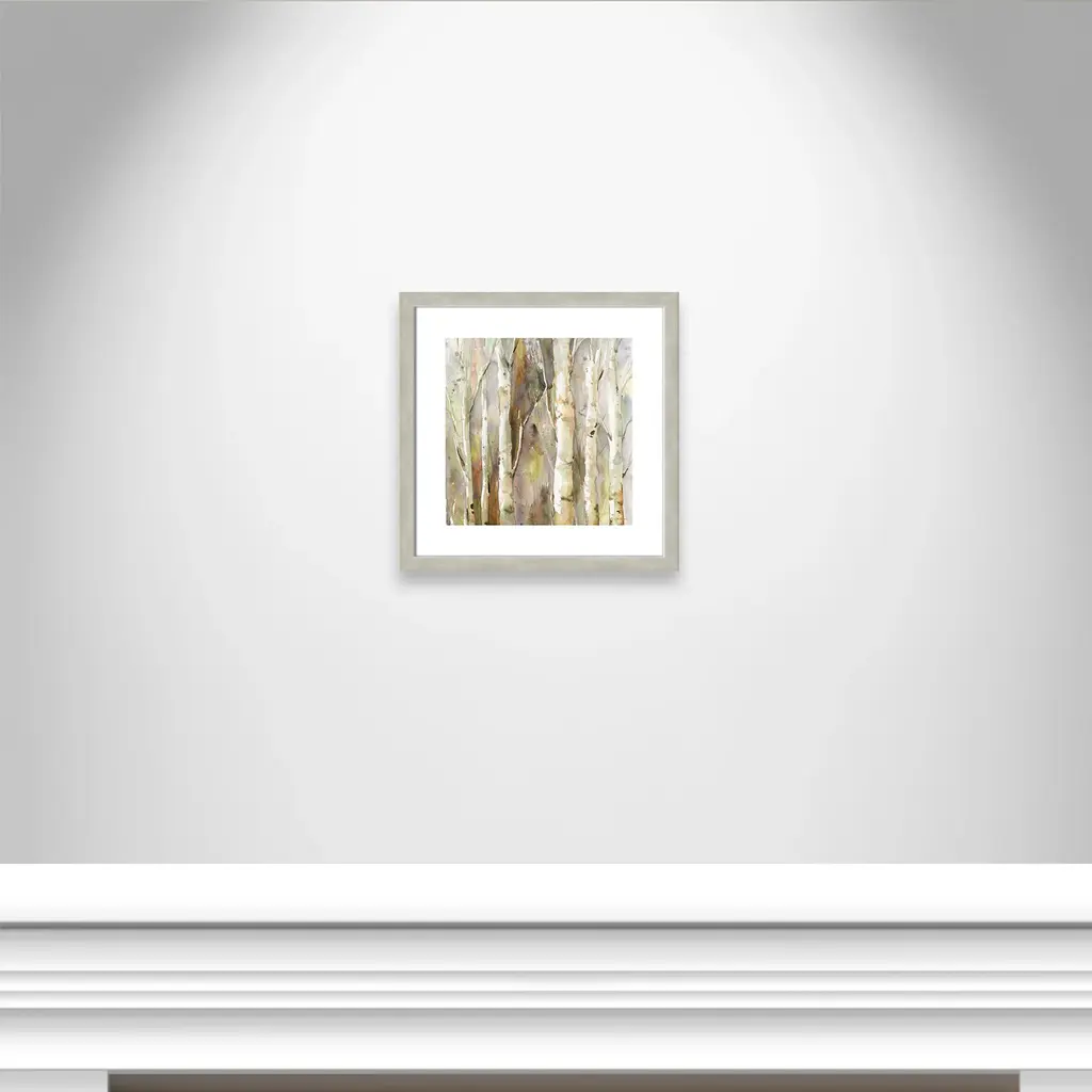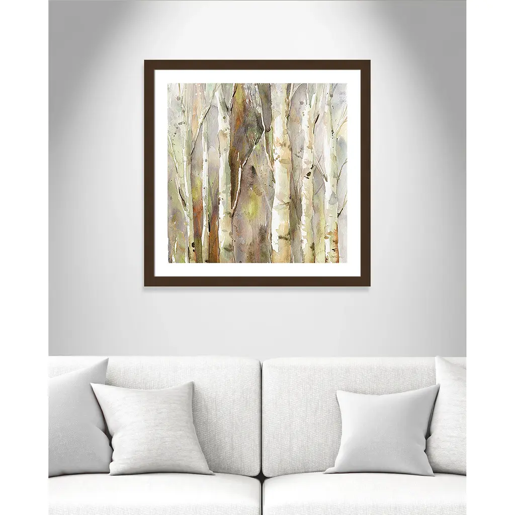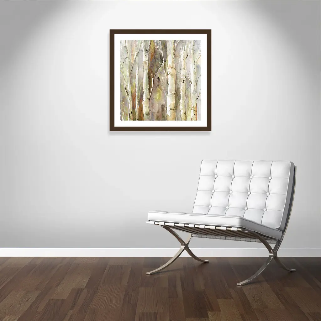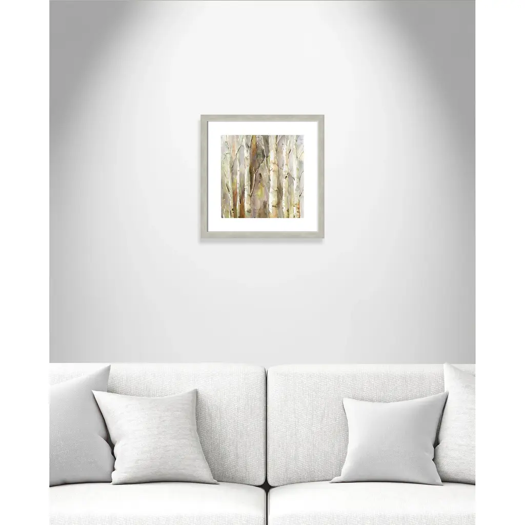 This soothing watercolor landscape image featuring a grove of beautiful birch trees, 'Quiet Morning I', combines a neutral palette with breathtaking simplicity to emulate the beauty and bliss of nature. Finished in a modern frame made of PS materials, this is the perfect addition to your walls. Archival fine art giclée print on acid-free and lignin-free 100% cotton rag paper; image includes a bright white self-matting border Printed with gallery-quality inks using the finest giclée print technology for unsurpassed color gamut and clarity Lightweight and finished under shatter-resistant acrylic; hanging hardware attached for easy and secure installation Handcrafted in the USA and ships with a Certificate of Authenticity Lightweight and finished under shatter-resistant acrylic