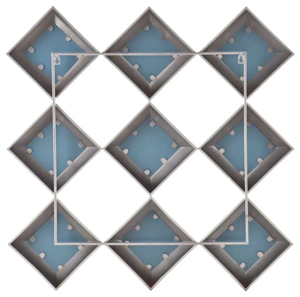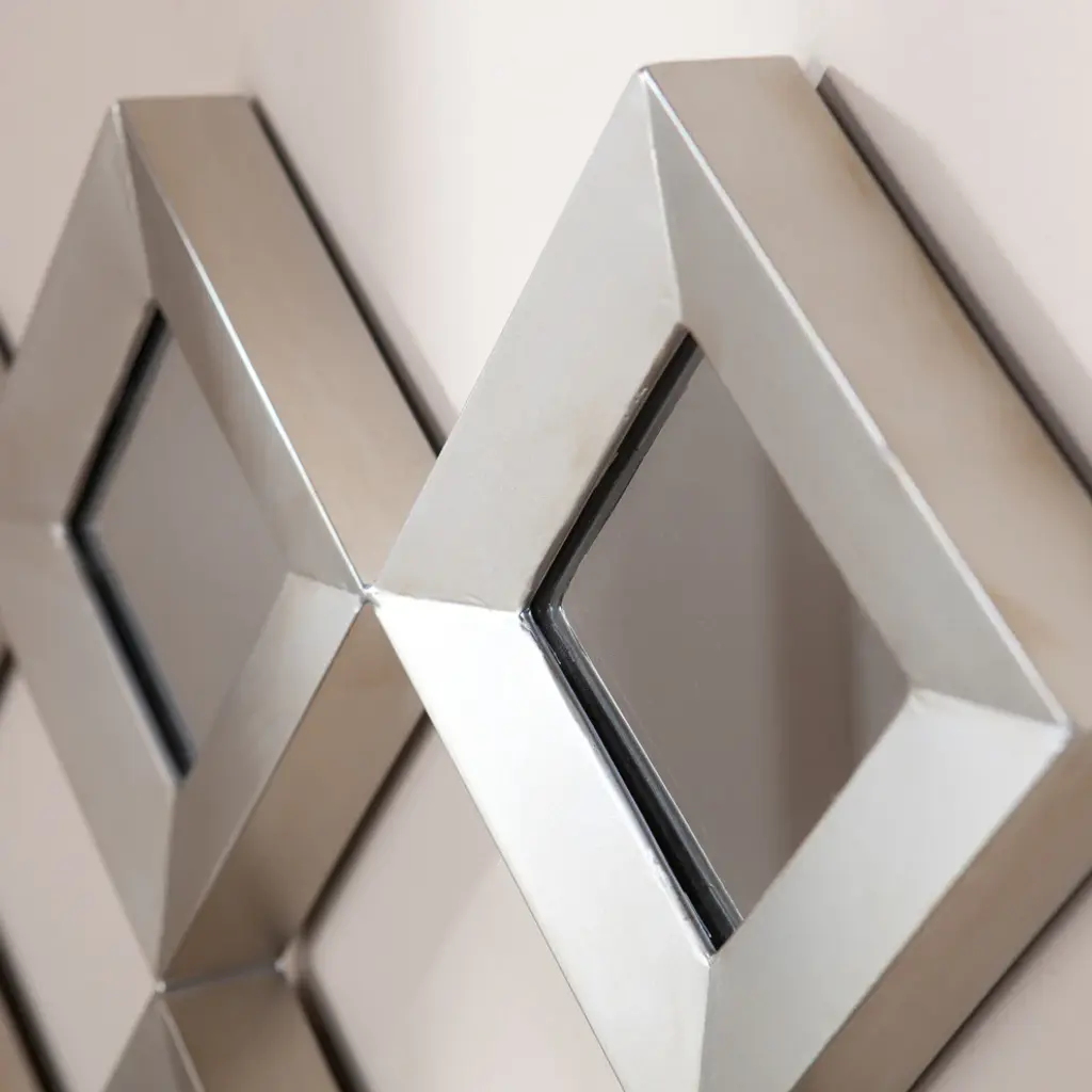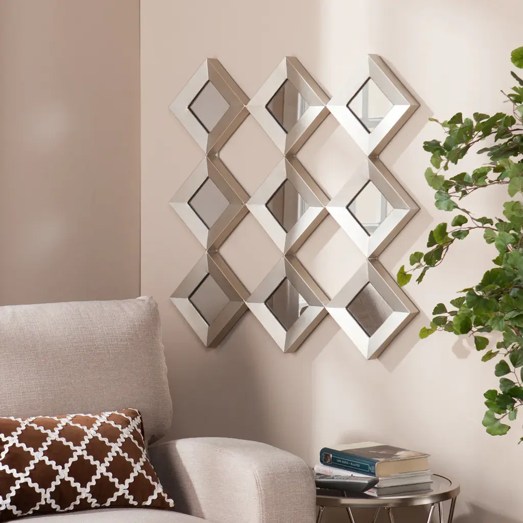 Make any room shine with this eye-catching, mirrored wall sculpture. Nine individual, diamond-shaped mirrors framed by sleek metal are linked together to form a modern, geometric pattern. The metal frames are beveled in toward the mirrors, adding detail and depth to the piece. This glamorous wall sculpture looks beautiful in sunlit rooms and is perfect for homes with any style of decor. - Features 9 diamond-shaped mirrors- Grid-like silhouette- Sleek, metal and mirror composition- Antiqued finish will vary piece to piece- Glam style with geometric touch- Warm, antiqued silver finish- Overall: 29.5" W x 1.75" D x 29.5" H- Assembly: No assembly required; ready to hang - Frames: 7" W x 7" H x 1.5" THK (beveled)- Mirrors: 3.75" W x 3.75" H- Approx. weight: 12 lb.- Materials: metal, mirror- Includes 2 attached keyhole hangers for easy installation