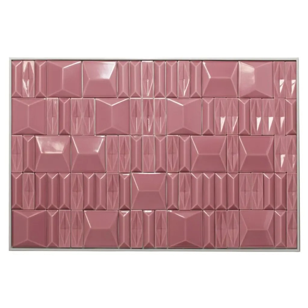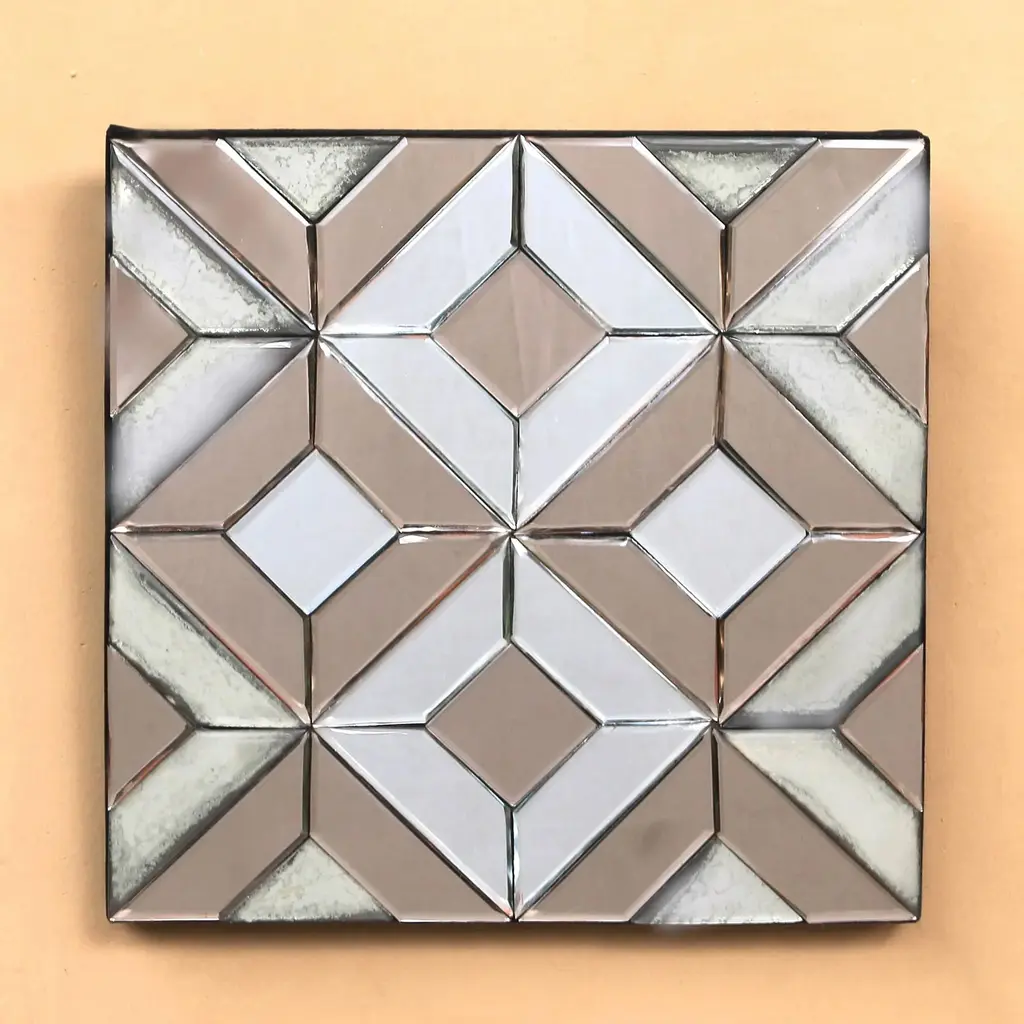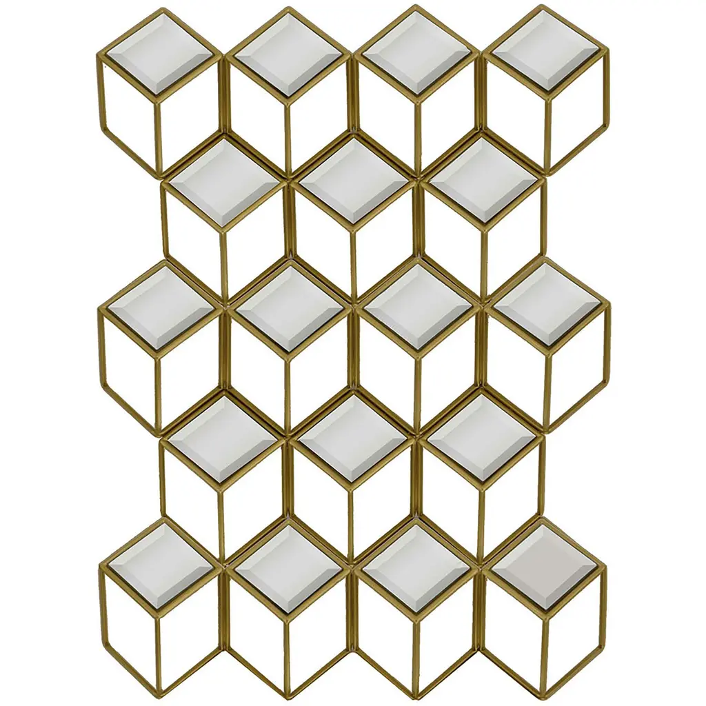 Make any room shine with this eye-catching, mirrored wall sculpture. Nine individual, diamond-shaped mirrors framed by sleek metal are linked together to form a modern, geometric pattern. The metal frames are beveled in toward the mirrors, adding detail and depth to the piece. This glamorous wall sculpture looks beautiful in sunlit rooms and is perfect for homes with any style of decor. - Features 9 diamond-shaped mirrors- Grid-like silhouette- Sleek, metal and mirror composition- Antiqued finish will vary piece to piece- Glam style with geometric touch- Warm, antiqued silver finish- Overall: 29.5" W x 1.75" D x 29.5" H- Assembly: No assembly required; ready to hang - Frames: 7" W x 7" H x 1.5" THK (beveled)- Mirrors: 3.75" W x 3.75" H- Approx. weight: 12 lb.- Materials: metal, mirror- Includes 2 attached keyhole hangers for easy installation