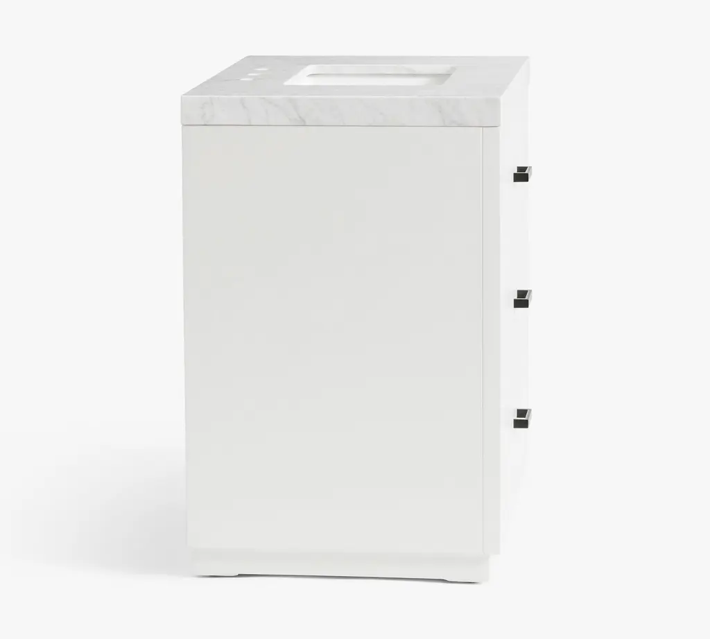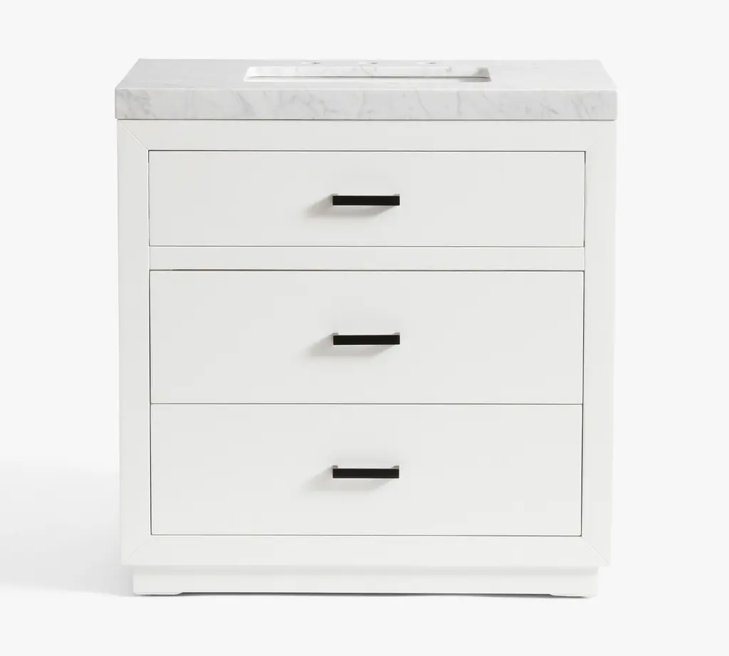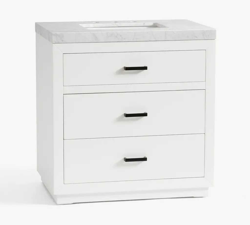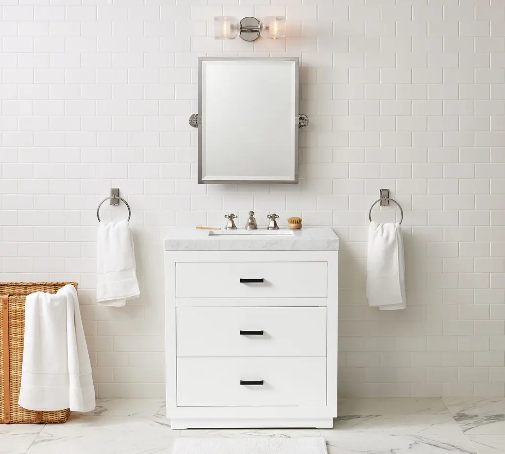 Whether you’re doing a quick remodel or a full-on reno, our Quinn Collection gives you a timeless custom built-in look. The crisp white vanity is accented with industrial metal finishes and pops of black for a modern edge.