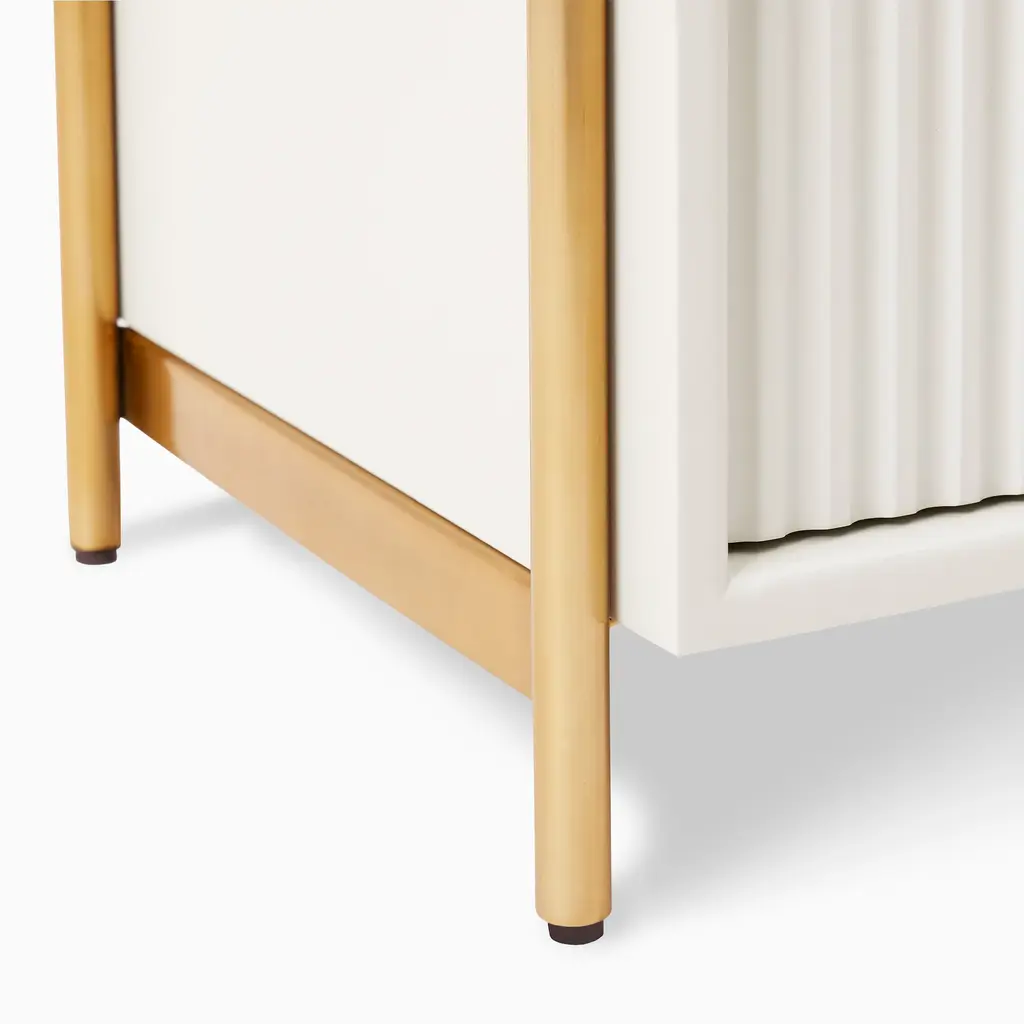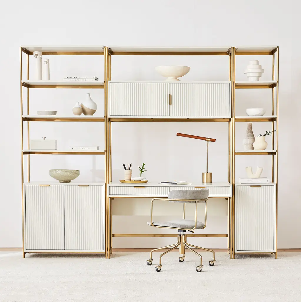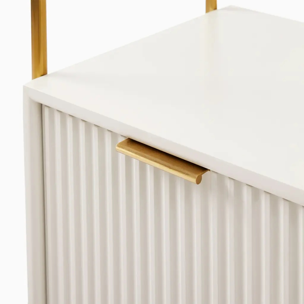 Streamlined shape with mixed materials. Glam contrast of fluted wood and sleek metal. A storage dream with ample shelving and cabinets. Contract Grade, so you know it's built to last.