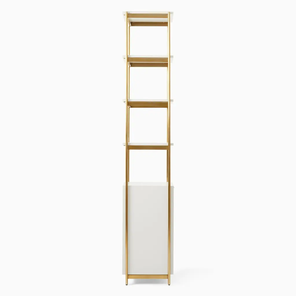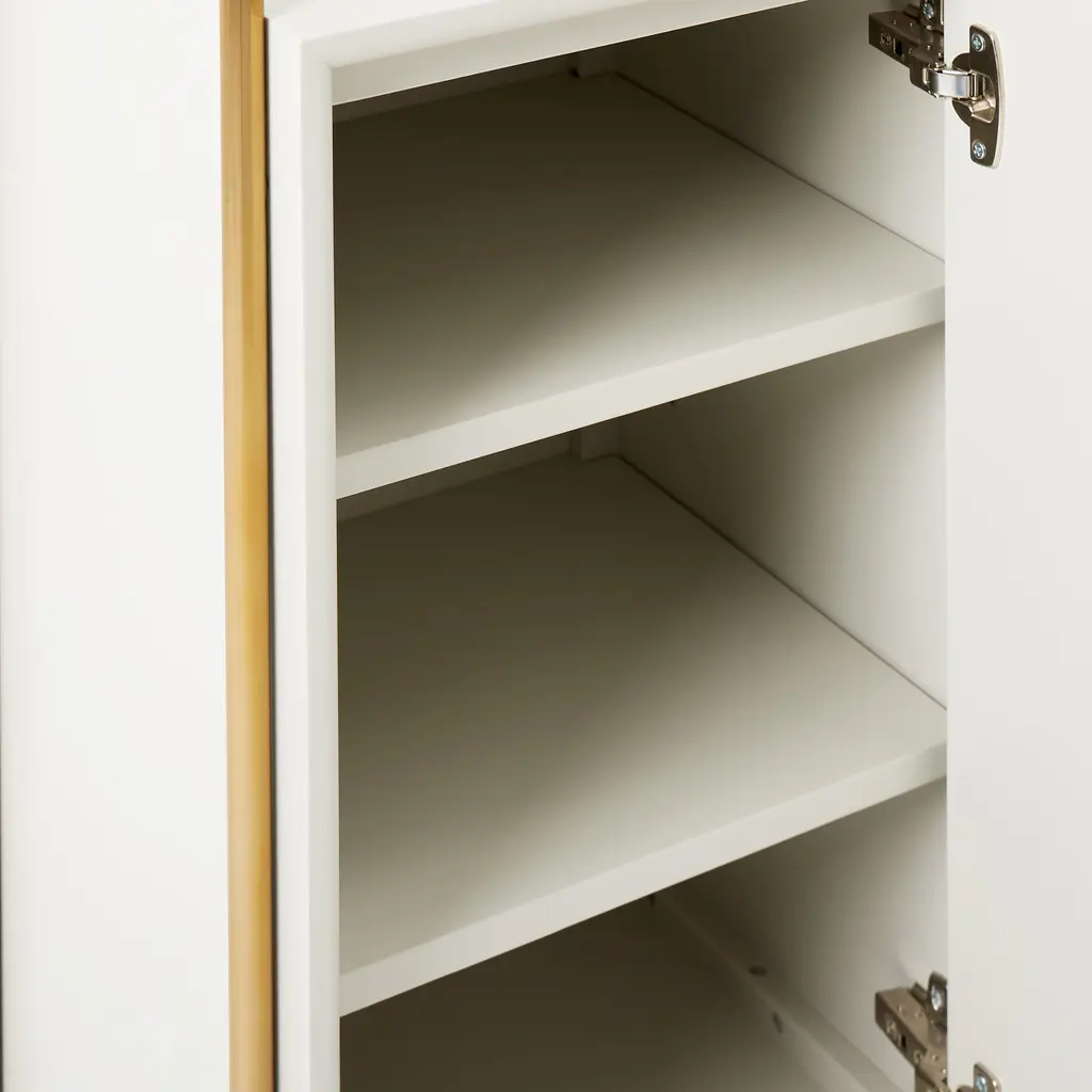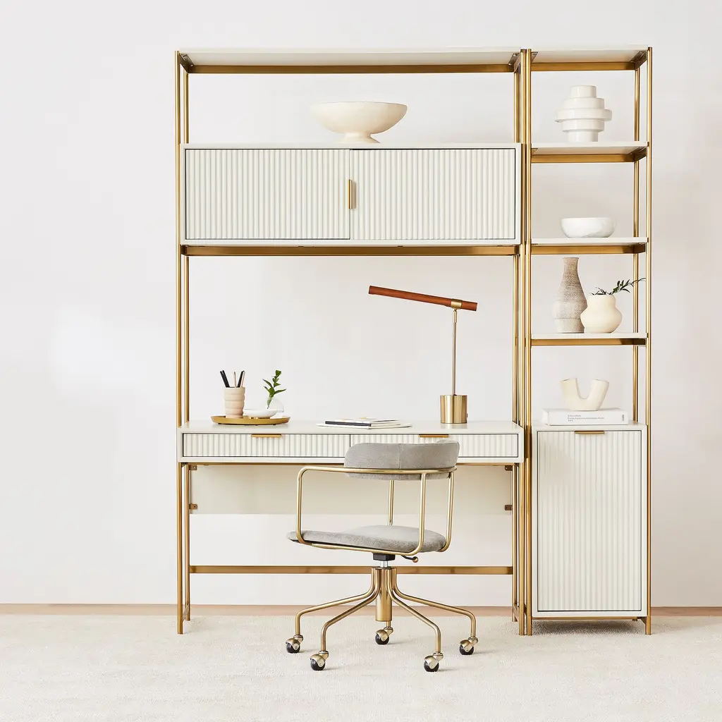 Streamlined shape with mixed materials. Glam contrast of fluted wood and sleek metal. A storage dream with ample shelving and cabinets. Contract Grade, so you know it's built to last.