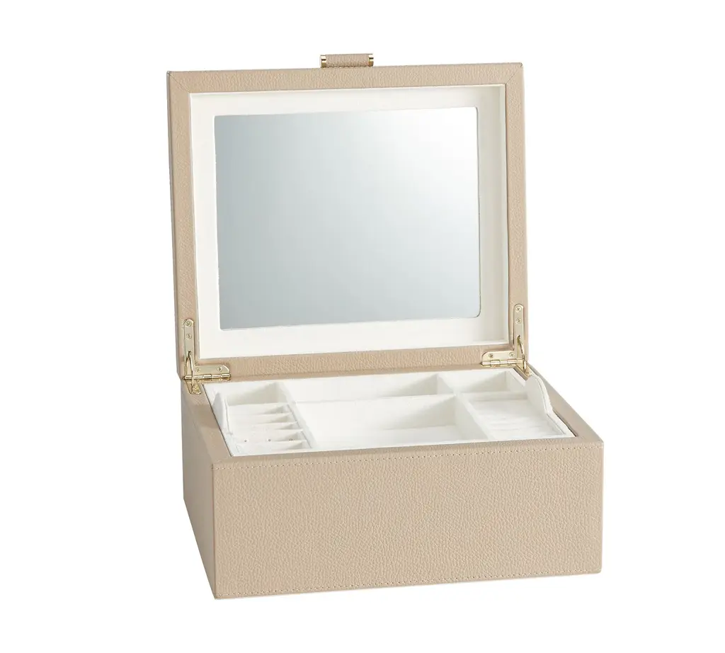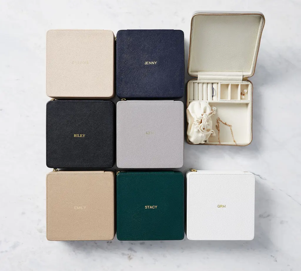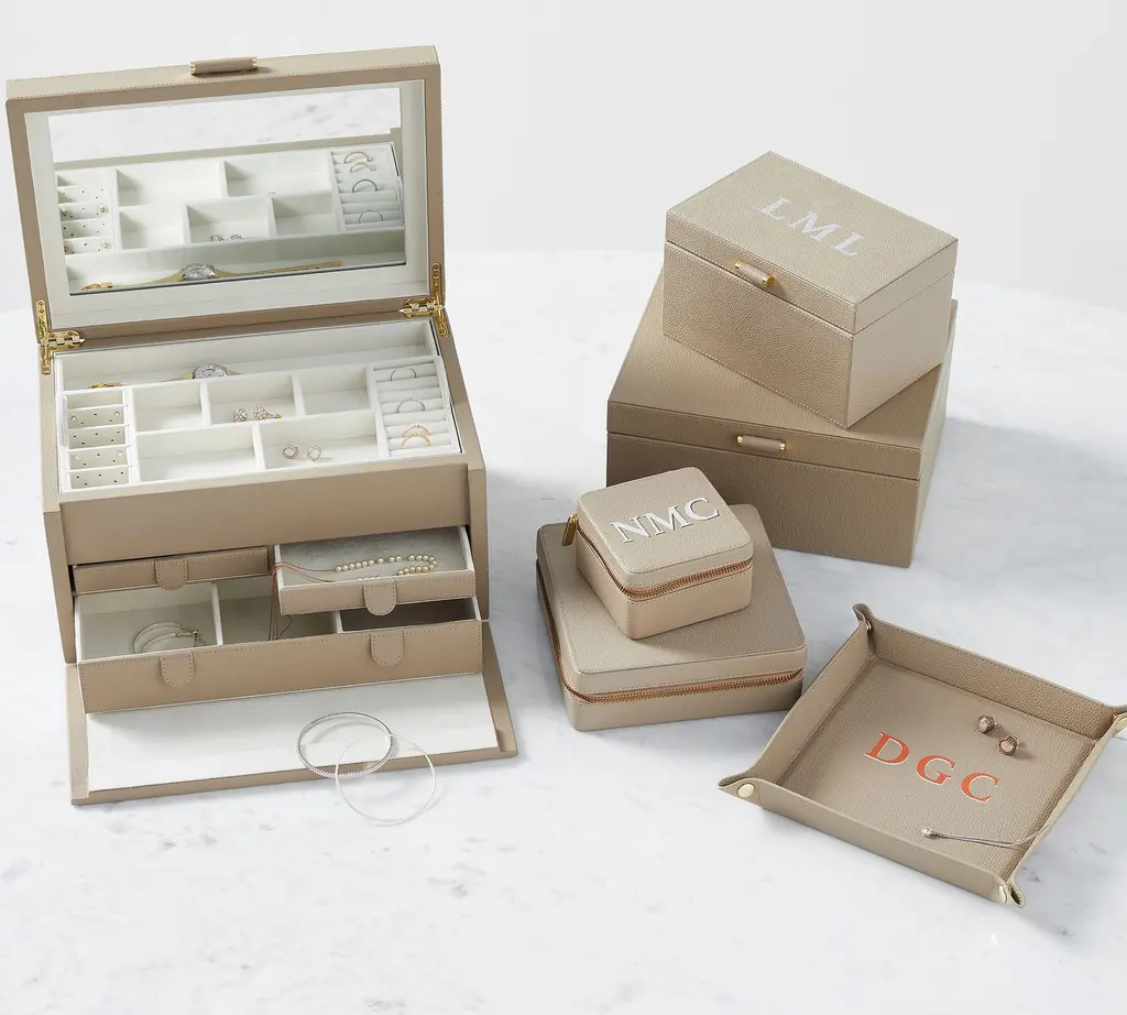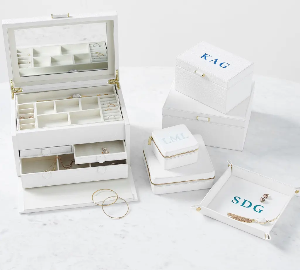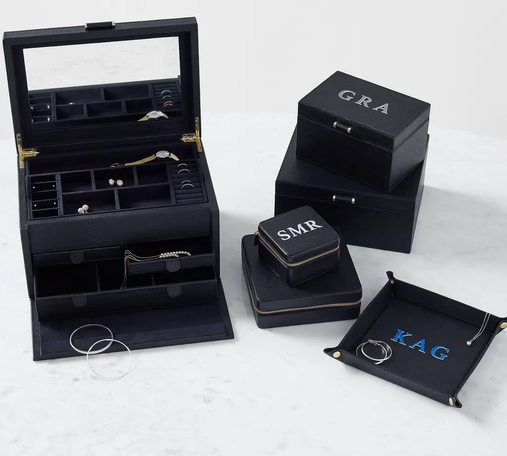 Our team set out to create the finest in jewelry storage, and the result was the innovative, exacting design of our Quinn Collection. Covered in soft pebbled leather and fitted with elegant brass-plated hardware, it makes daily accessorizing feel like special, thoughtful moments. The interior features an ultra soft suede-like fabric to prevent tarnishing. For a personal touch, add a dimensional drop-shadow printed monogram.