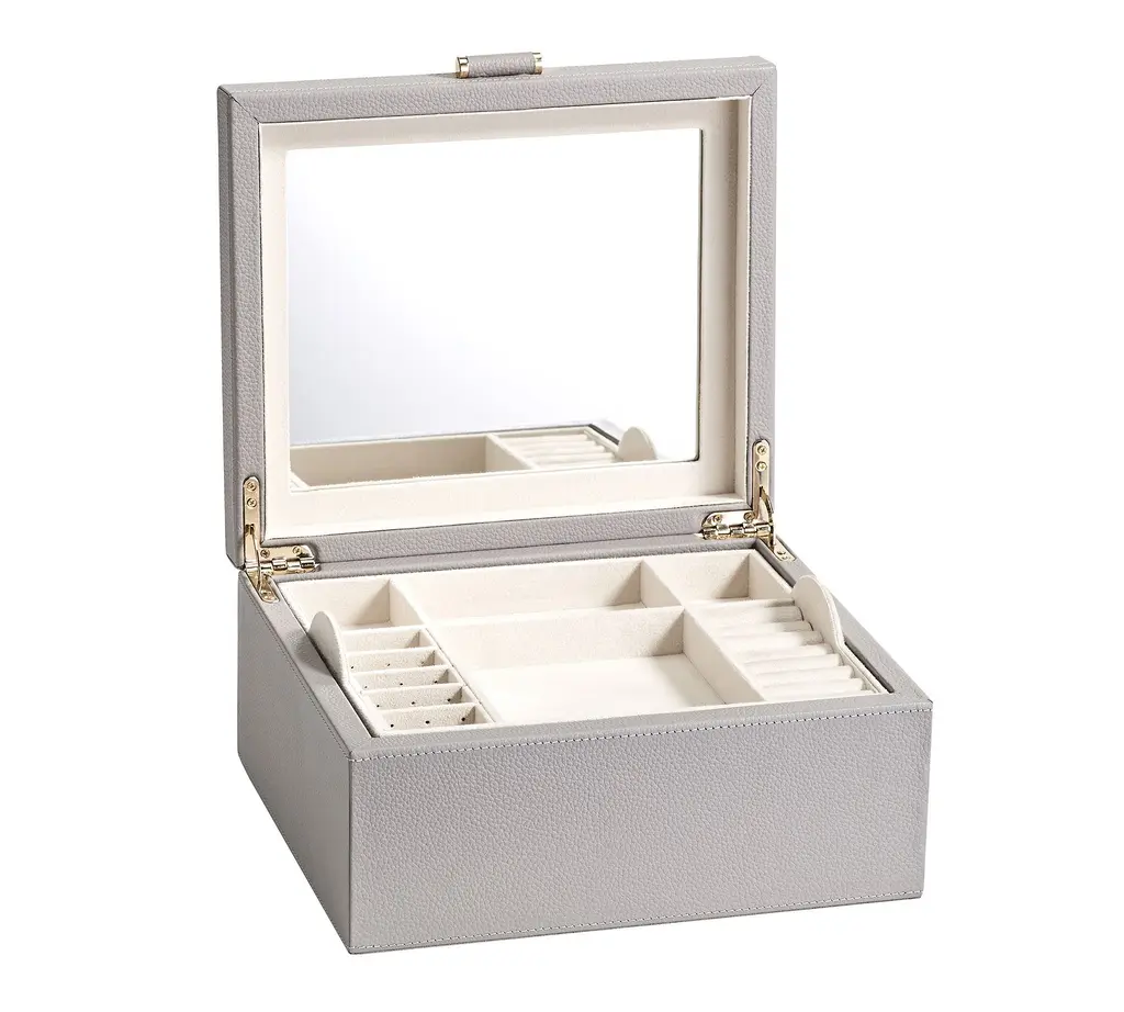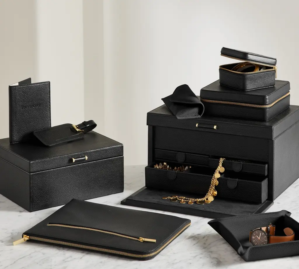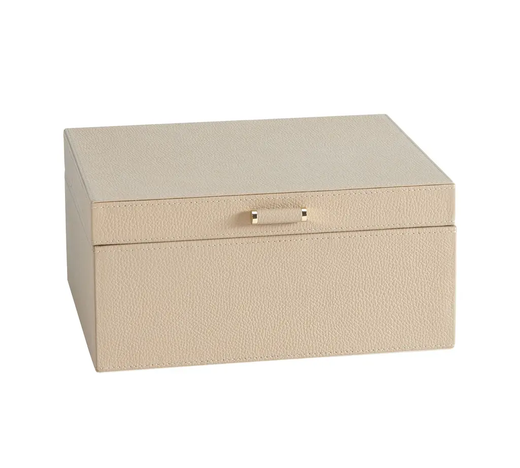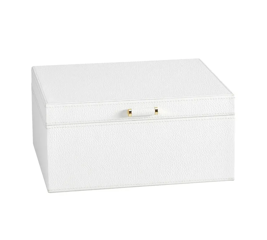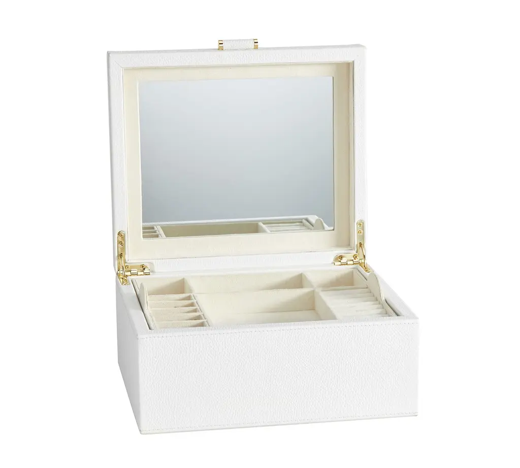 Our team set out to create the finest in jewelry storage, and the result was the innovative, exacting design of our Quinn Collection. Covered in soft pebbled leather and fitted with elegant brass-plated hardware, it makes daily accessorizing feel like special, thoughtful moments. The interior features an ultra soft suede-like fabric to prevent tarnishing. For a personal touch, add a dimensional drop-shadow printed monogram.