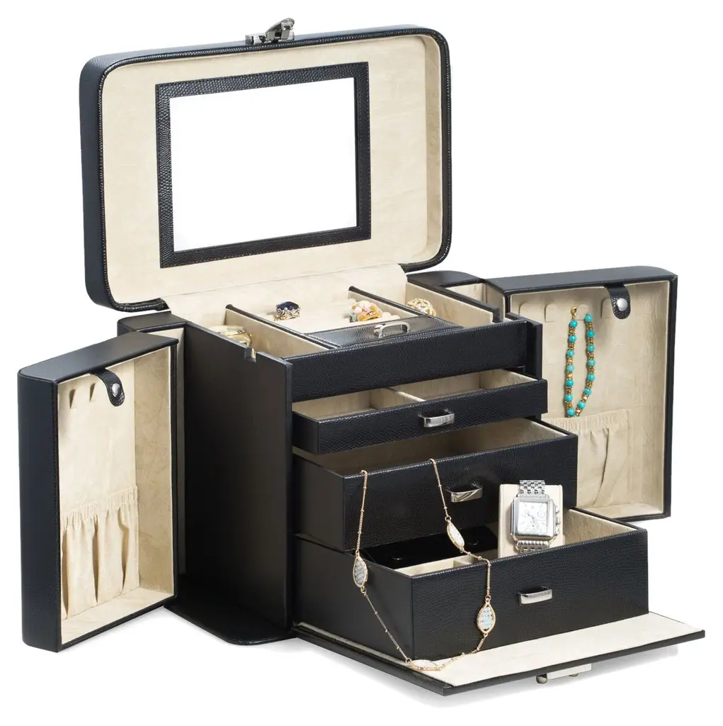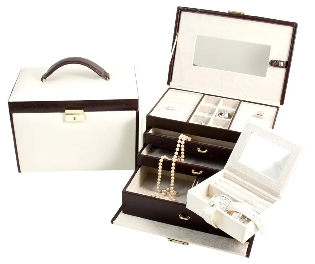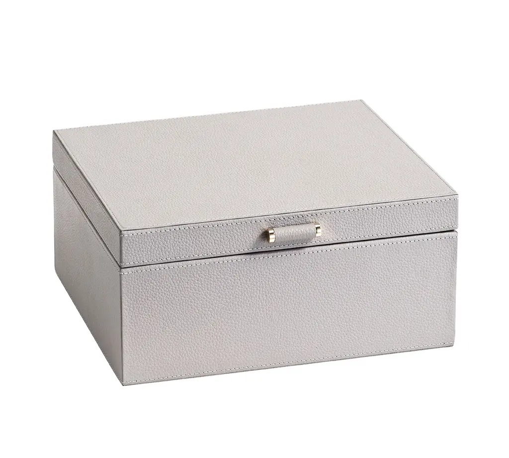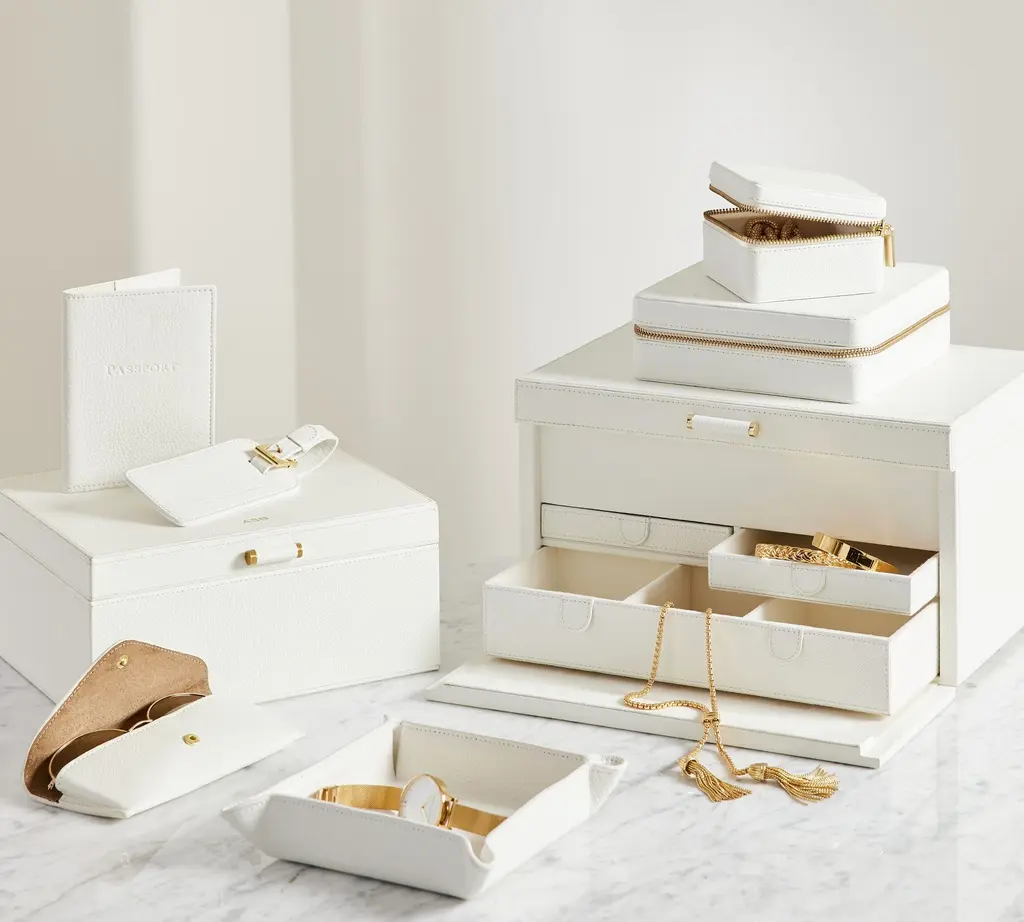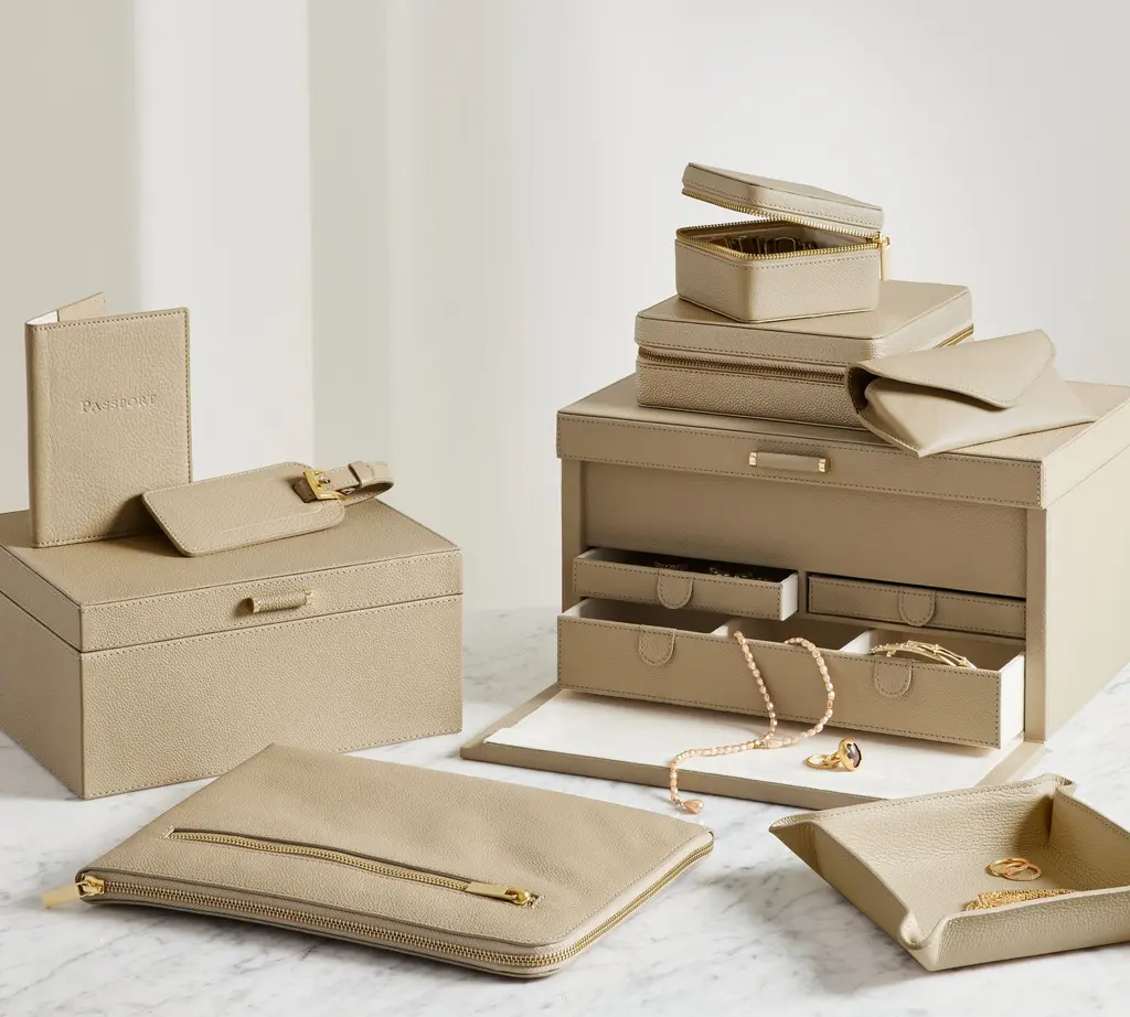 Our team set out to create the finest in jewelry storage, and the result was the innovative, exacting design of our Quinn Collection. Covered in soft pebbled leather and fitted with elegant brass-plated hardware, it makes daily accessorizing feel like special, thoughtful moments. The interior features an ultra soft suede-like fabric to prevent tarnishing. For a personal touch, add a dimensional drop-shadow printed monogram.