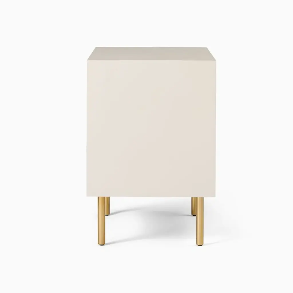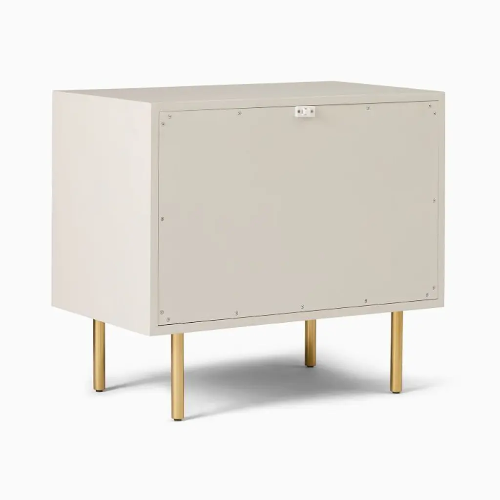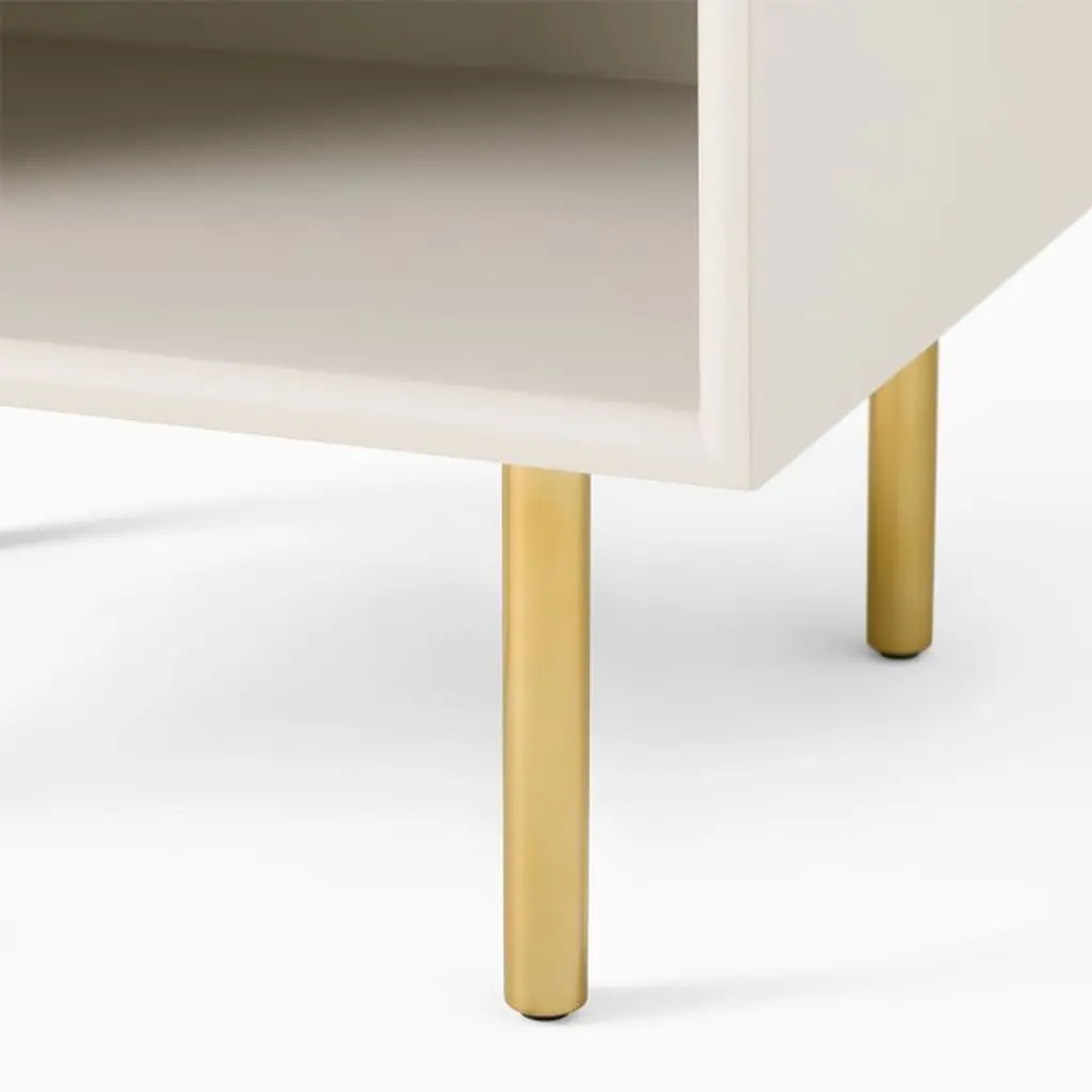 Frame: Solid mahogany wood. Sides and drawer front: Engineered wood. Covered in a Haze finish. Metal hardware and legs in an Antique Brass finish. 1 drawer opens on metal glides and features English dovetail joinery. 1 open shelf. Legs have built-in levelers to adapt to varying floor levels. This contract-grade item is manufactured to meet the demands of commercial use in addition to residential. See more. Made in Indonesia.