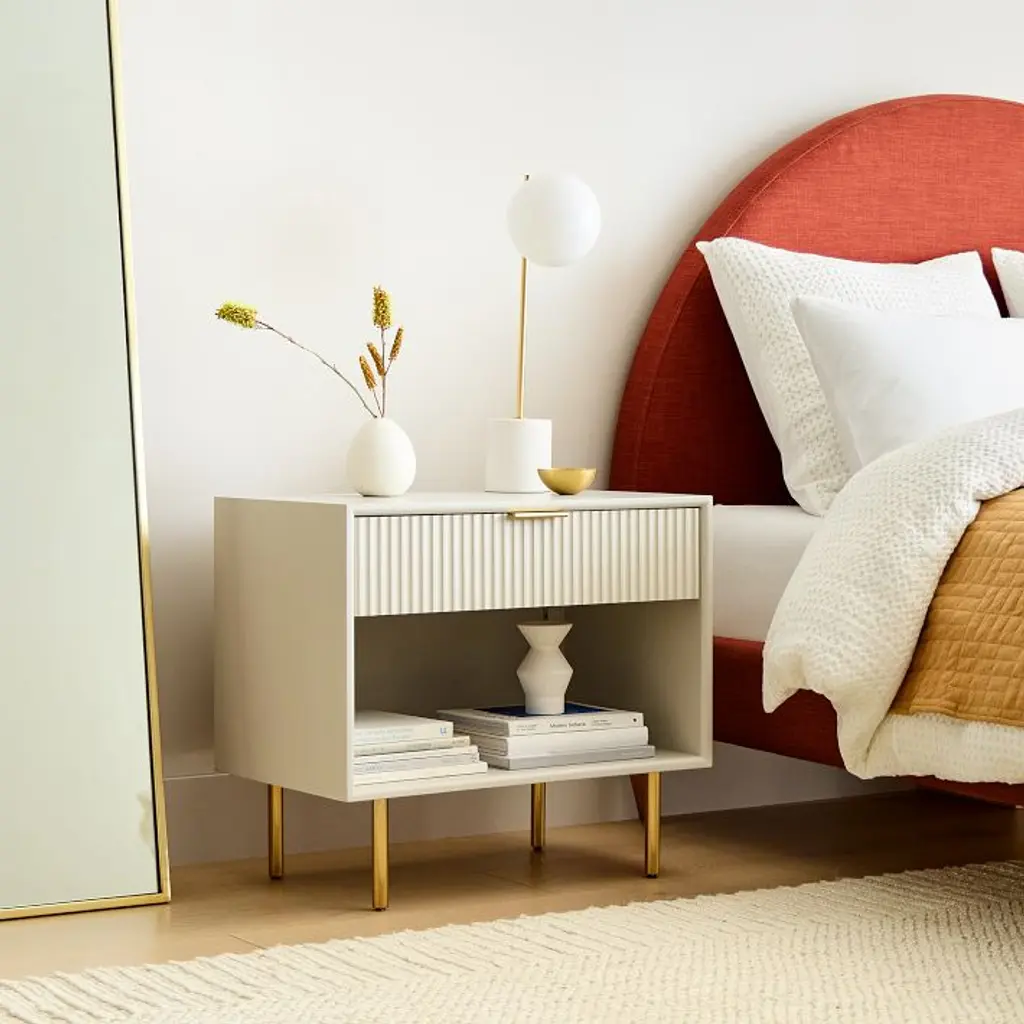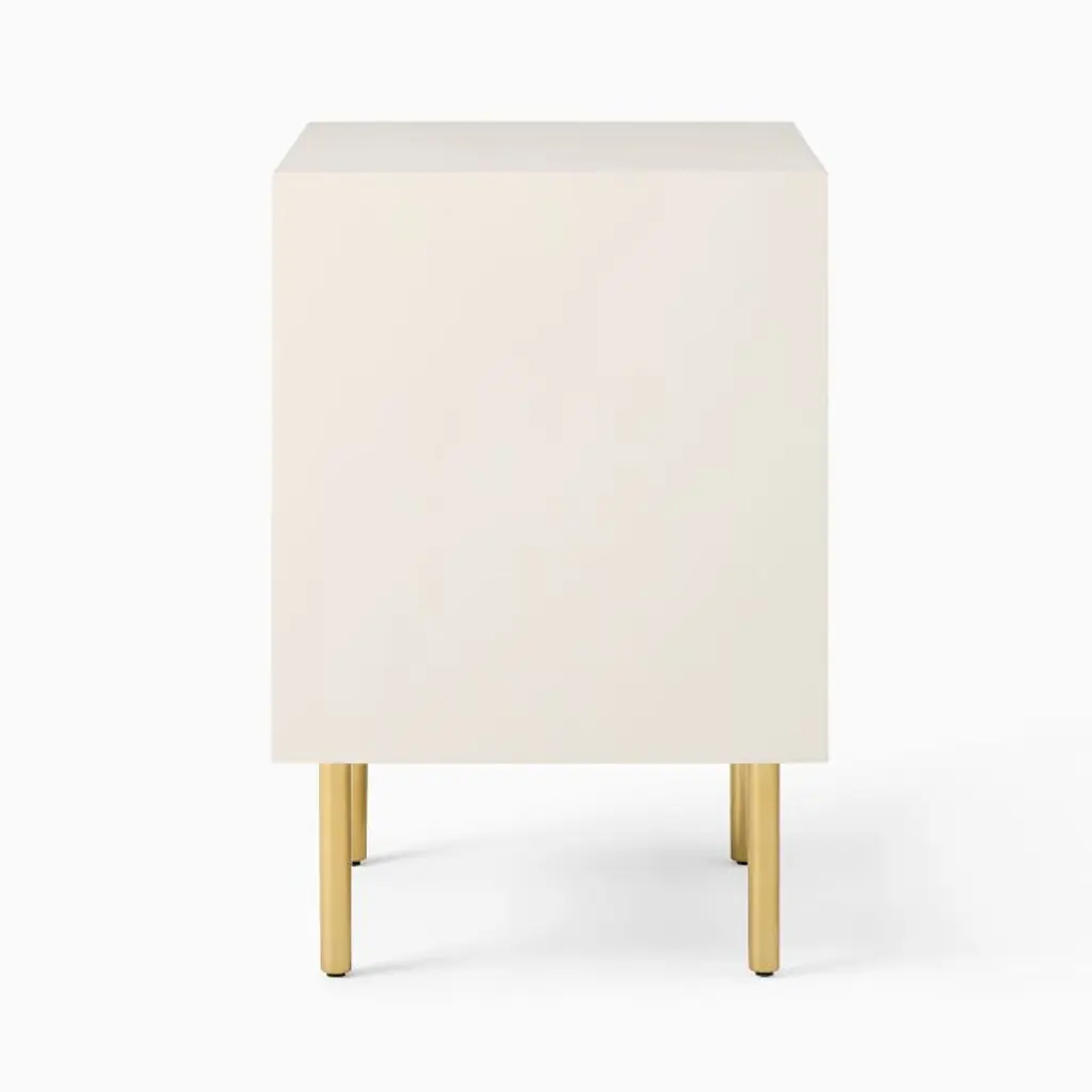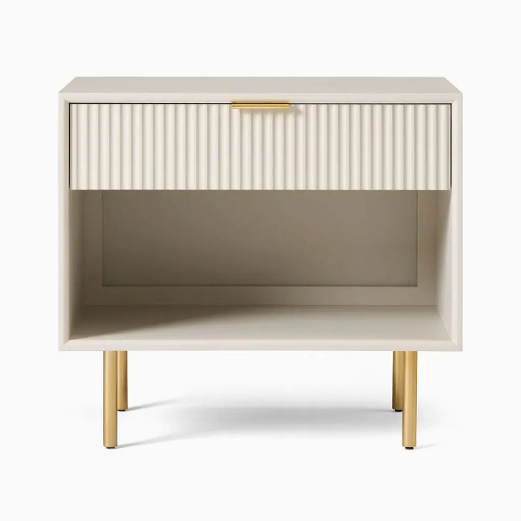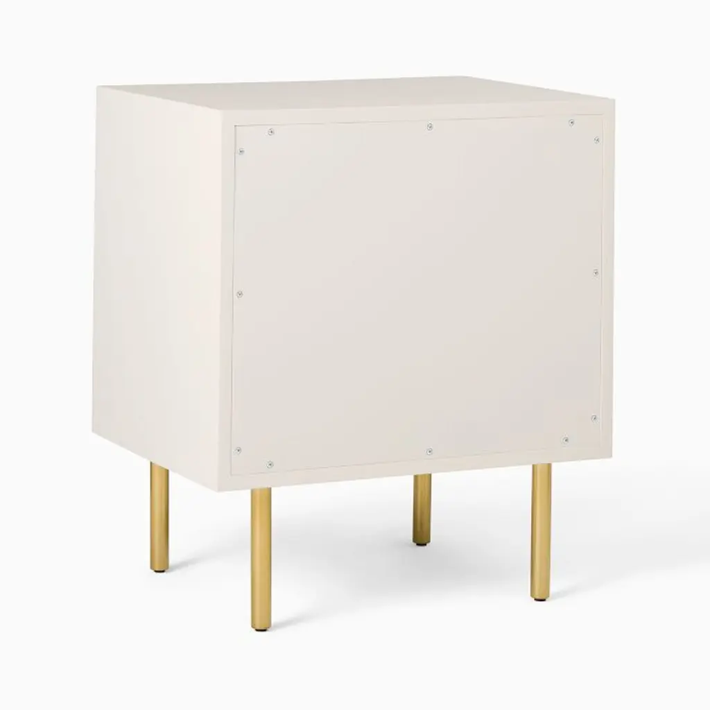 Frame: Solid mahogany wood. Sides and drawer front: Engineered wood. Covered in a Haze finish. Metal hardware and legs in an Antique Brass finish. 1 drawer opens on metal glides and features English dovetail joinery. 1 open shelf. Legs have built-in levelers to adapt to varying floor levels. This contract-grade item is manufactured to meet the demands of commercial use in addition to residential. See more. Made in Indonesia.