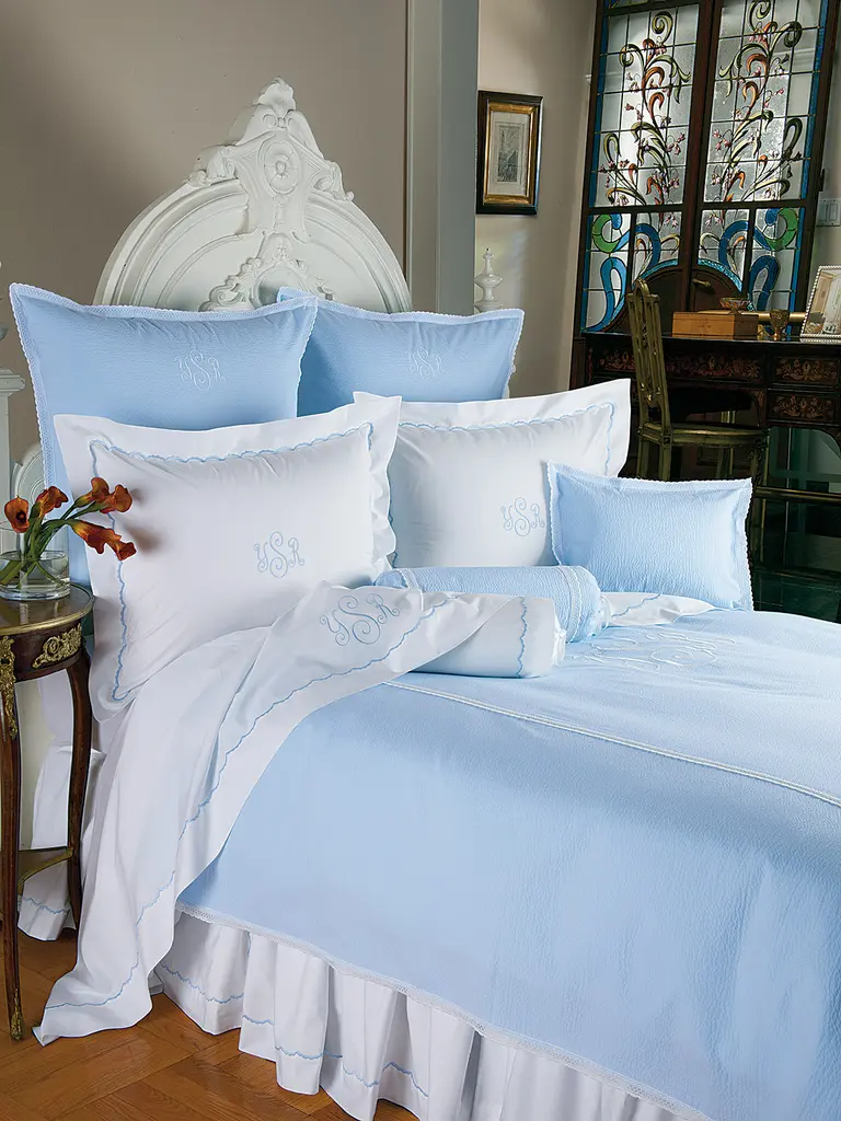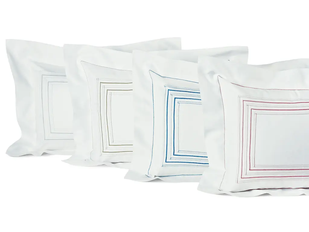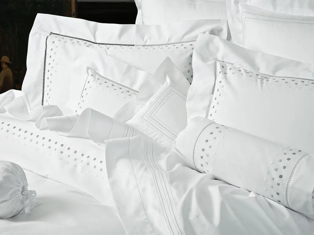 The true elegance of simplicity is superbly expressed in the polished-to-perfection texture of silky 300 thread count, White Egyptian cotton sateen, with finely delineated rows of White, Blue, Beige, Gray or Rose pin tucks and cords, and a frame of ultra-fine zigzag stitching. Made in Italy with all the tailoring refinements of knife-edged flanges, mitered corners and button enclosures on the shams and duvet covers. Truly exceptional.