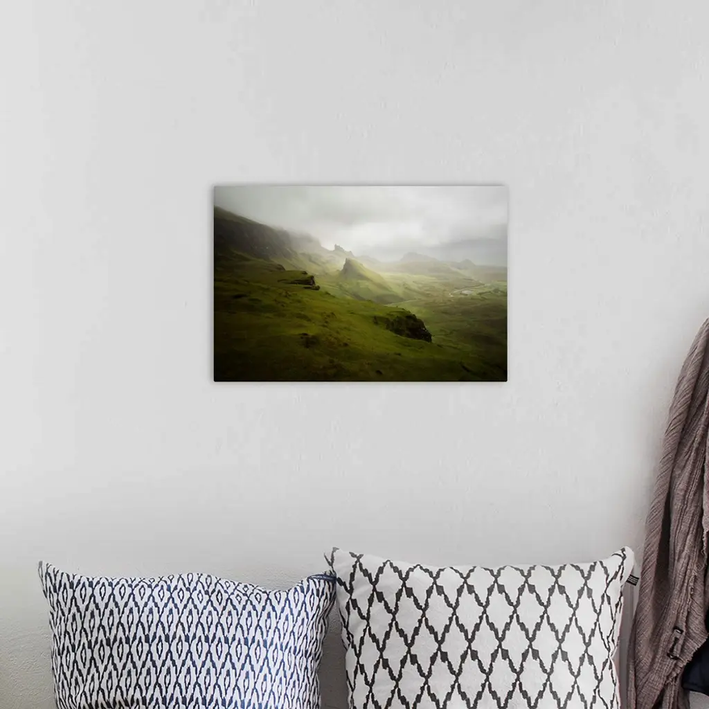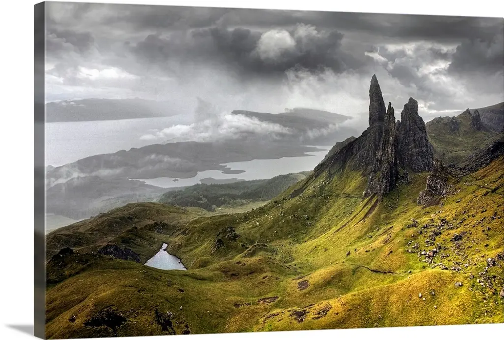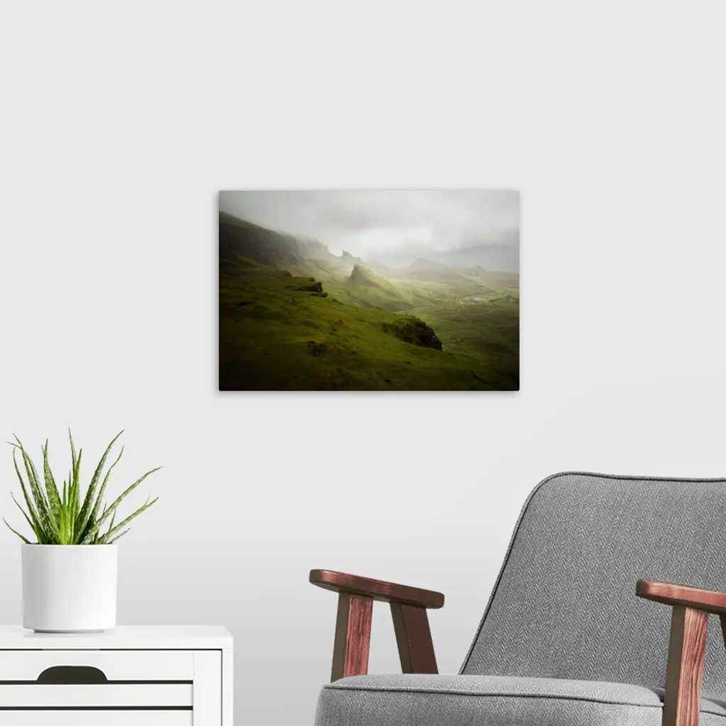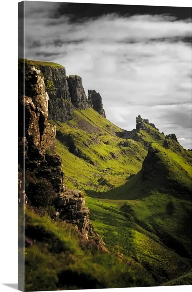 The green Quiraing moutains on a rainy day in skye island in northern Scotland, UK