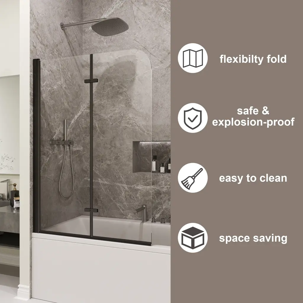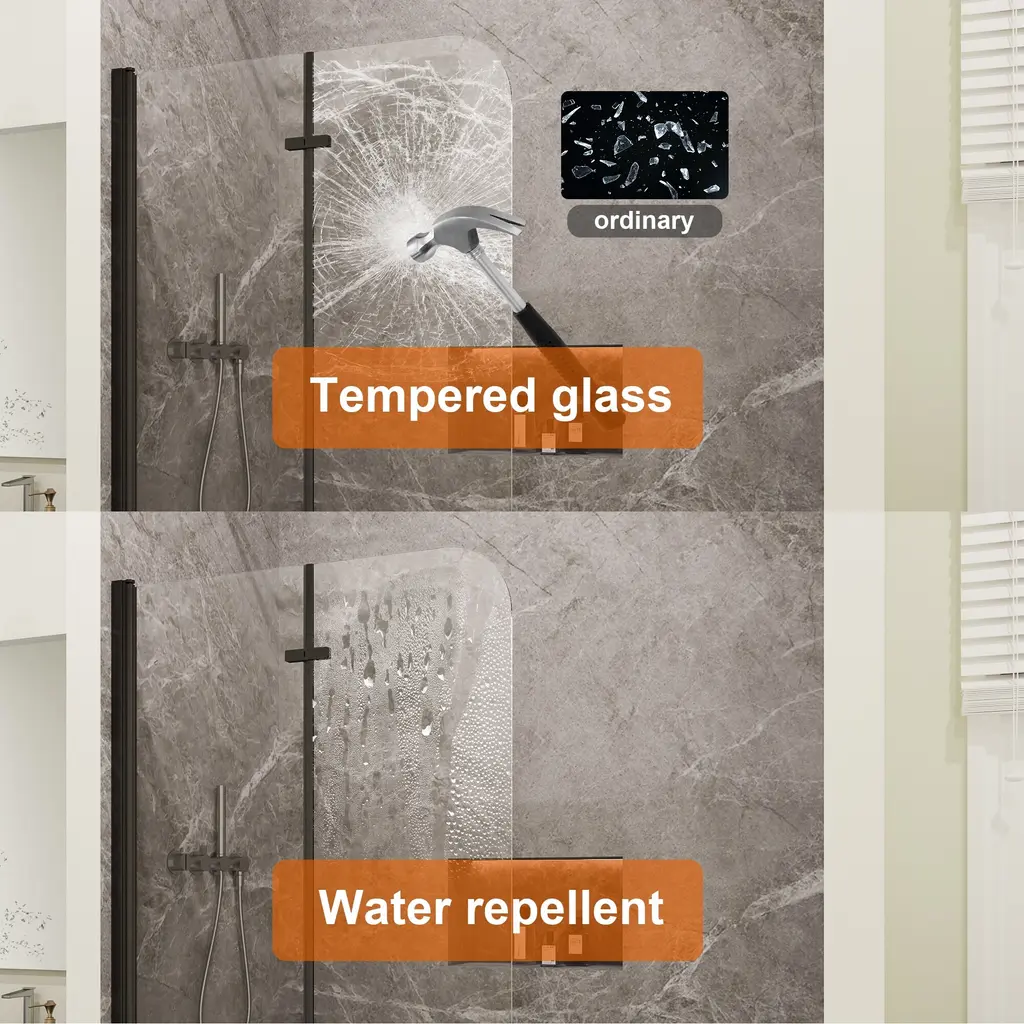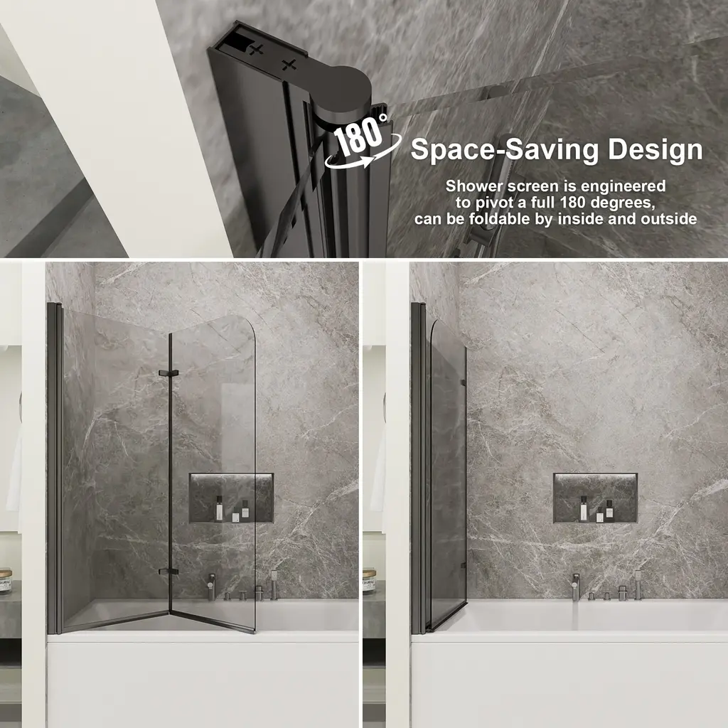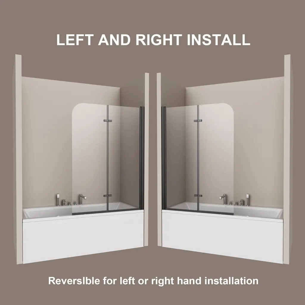 Transform your bathing experience with our Frameless Bi-Fold Bathtub Screen, where functionality meets chic design. With multiple sizing guarantees a flawless fit, adding a touch of modern elegance to your home. This sleek and contemporary shower screen is engineered to pivot a full 180 degrees, making it incredibly versatile for any bathroom layout. Crafted with premium materials, the minimalist design seamlessly integrates into your bathroom, providing a clean and sophisticated look. Our Foldable Elegance Shower Screen offers a refined approach to functionality and style, ensuring an enhanced bathing experience that fits your lifestyle.Features:· Safety and Durability · Premium Material· Easy cleaning · Space Saving Design· Water Proof· Reversible installationDetails:Safety and Durability:Crafted with high-hardness materials, this screen provides safe and explosion-proof protection, guaranteeing long-term reliability.Premium Glass Screen Panels: With ANSI-certified tempered glass, it is designed to seamlessly integrate with your bathtub, these panels provide the perfect balance of style and practicality. Easy Cleaning:The minimalist design ensures easy cleaning, maintaining a pristine look with minimal effort.The dual-panel system ensures that your bathroom stays dry and tidy on the outside, while the inside remains an oasis of calm for your bathing experience. Enjoying a hassle-free cleaning experience with our easy-to-install glass screen panels.Space-Saving Design: Its compact structure maximizes your bathroom’s available space, making it ideal for both small and large bathrooms.Waterproof Design: It is a durable and waterproof design that with technology protective nano Coating and waterproof strip to prevent water from leaking through the gap.Reversible installation: According to your space need,reversible for right or left wall installation to fit your specific layout.