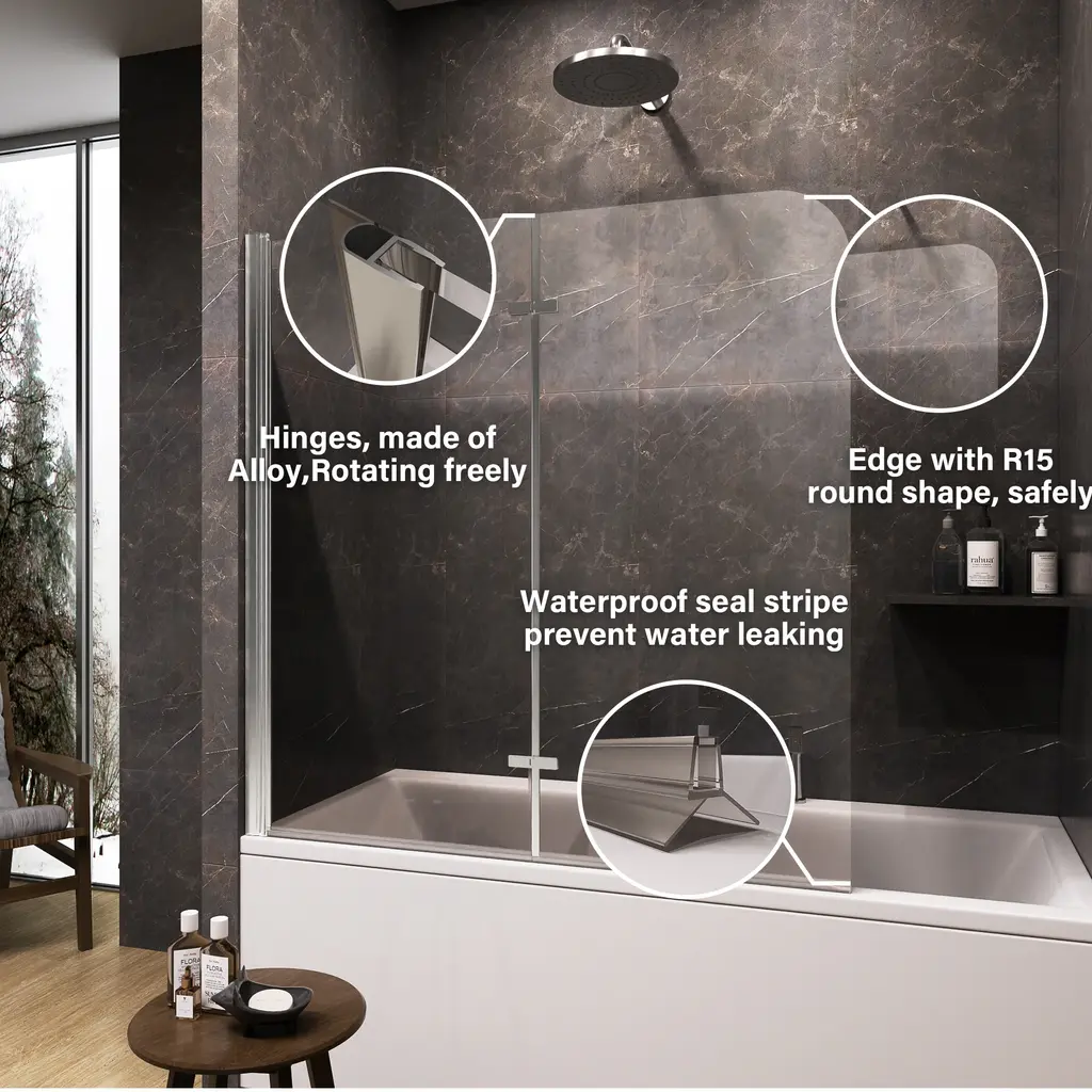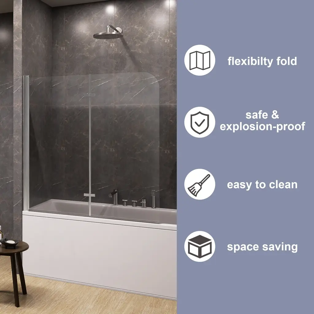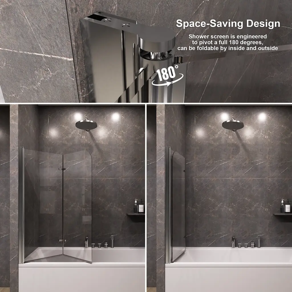 Transform your bathing experience with our Frameless Bi-Fold Bathtub Screen, where functionality meets chic design. With multiple sizing guarantees a flawless fit, adding a touch of modern elegance to your home. This sleek and contemporary shower screen is engineered to pivot a full 180 degrees, making it incredibly versatile for any bathroom layout. Crafted with premium materials, the minimalist design seamlessly integrates into your bathroom, providing a clean and sophisticated look. Our Foldable Elegance Shower Screen offers a refined approach to functionality and style, ensuring an enhanced bathing experience that fits your lifestyle.Features:· Safety and Durability · Premium Material· Easy cleaning · Space Saving Design· Water Proof· Reversible installationDetails:Safety and Durability:Crafted with high-hardness materials, this screen provides safe and explosion-proof protection, guaranteeing long-term reliability.Premium Glass Screen Panels: With ANSI-certified tempered glass, it is designed to seamlessly integrate with your bathtub, these panels provide the perfect balance of style and practicality. Easy Cleaning:The minimalist design ensures easy cleaning, maintaining a pristine look with minimal effort.The dual-panel system ensures that your bathroom stays dry and tidy on the outside, while the inside remains an oasis of calm for your bathing experience. Enjoying a hassle-free cleaning experience with our easy-to-install glass screen panels.Space-Saving Design: Its compact structure maximizes your bathroom’s available space, making it ideal for both small and large bathrooms.Waterproof Design: It is a durable and waterproof design that with technology protective nano Coating and waterproof strip to prevent water from leaking through the gap.Reversible installation: According to your space need,reversible for right or left wall installation to fit your specific layout.