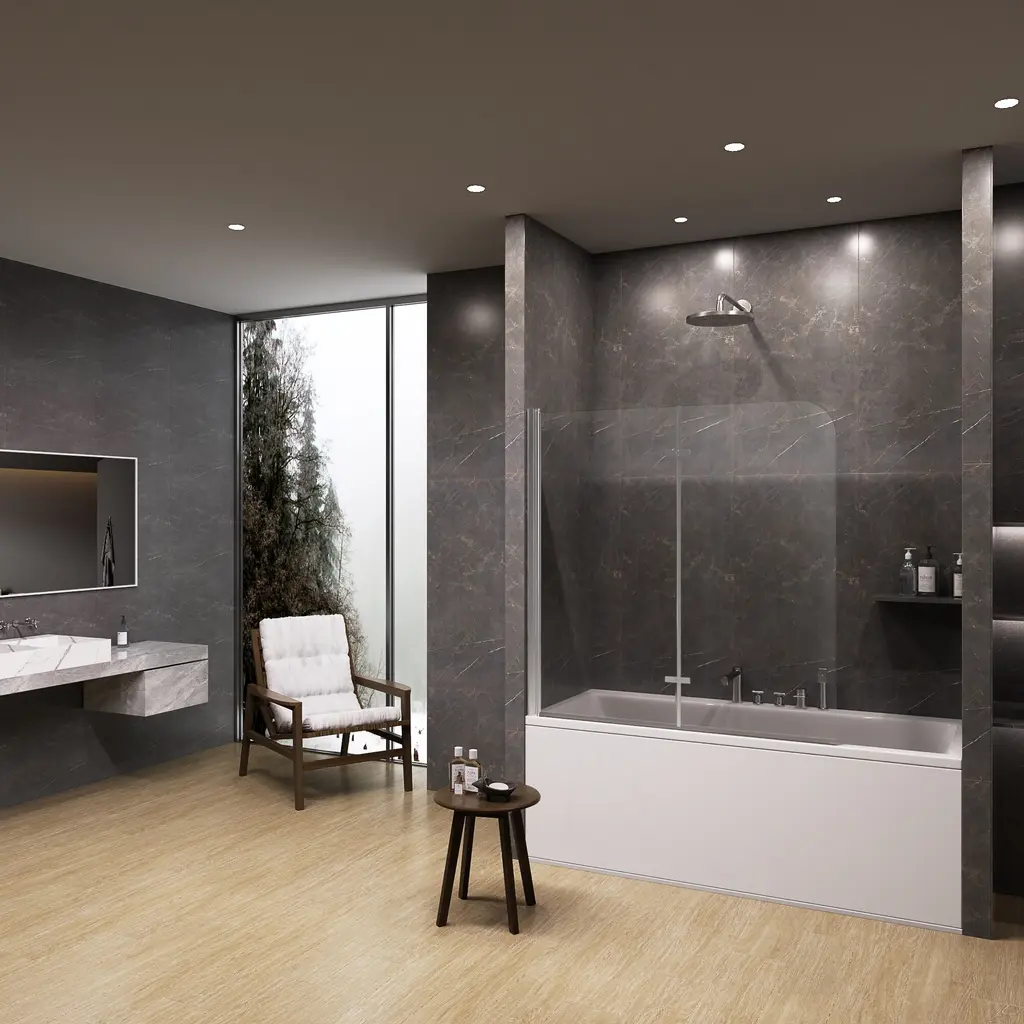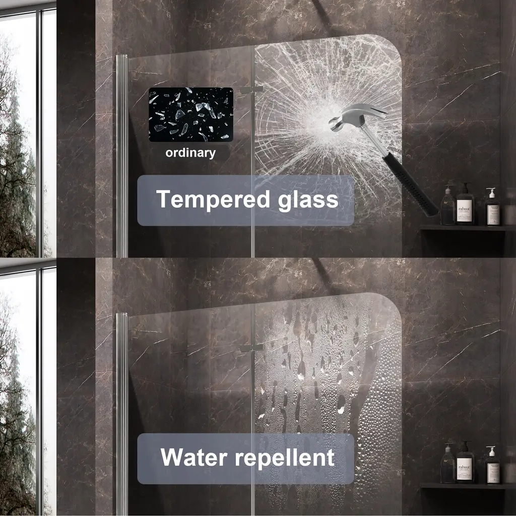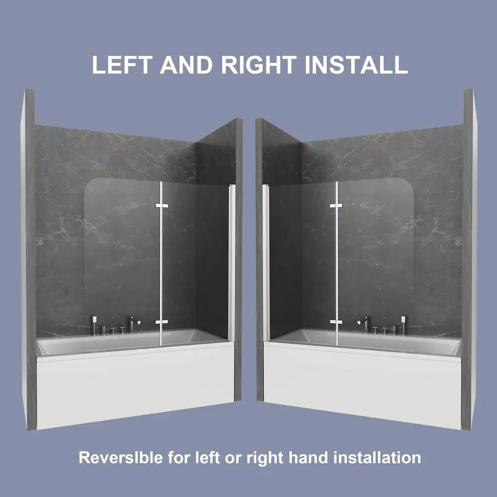 Transform your bathing experience with our Frameless Bi-Fold Bathtub Screen, where functionality meets chic design. With multiple sizing guarantees a flawless fit, adding a touch of modern elegance to your home. This sleek and contemporary shower screen is engineered to pivot a full 180 degrees, making it incredibly versatile for any bathroom layout. Crafted with premium materials, the minimalist design seamlessly integrates into your bathroom, providing a clean and sophisticated look. Our Foldable Elegance Shower Screen offers a refined approach to functionality and style, ensuring an enhanced bathing experience that fits your lifestyle.Features:· Safety and Durability · Premium Material· Easy cleaning · Space Saving Design· Water Proof· Reversible installationDetails:Safety and Durability:Crafted with high-hardness materials, this screen provides safe and explosion-proof protection, guaranteeing long-term reliability.Premium Glass Screen Panels: With ANSI-certified tempered glass, it is designed to seamlessly integrate with your bathtub, these panels provide the perfect balance of style and practicality. Easy Cleaning:The minimalist design ensures easy cleaning, maintaining a pristine look with minimal effort.The dual-panel system ensures that your bathroom stays dry and tidy on the outside, while the inside remains an oasis of calm for your bathing experience. Enjoying a hassle-free cleaning experience with our easy-to-install glass screen panels.Space-Saving Design: Its compact structure maximizes your bathroom’s available space, making it ideal for both small and large bathrooms.Waterproof Design: It is a durable and waterproof design that with technology protective nano Coating and waterproof strip to prevent water from leaking through the gap.Reversible installation: According to your space need,reversible for right or left wall installation to fit your specific layout.