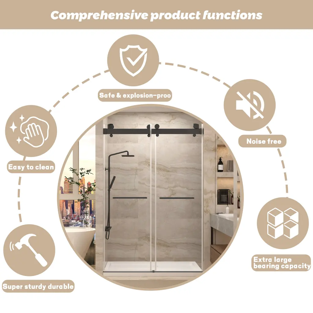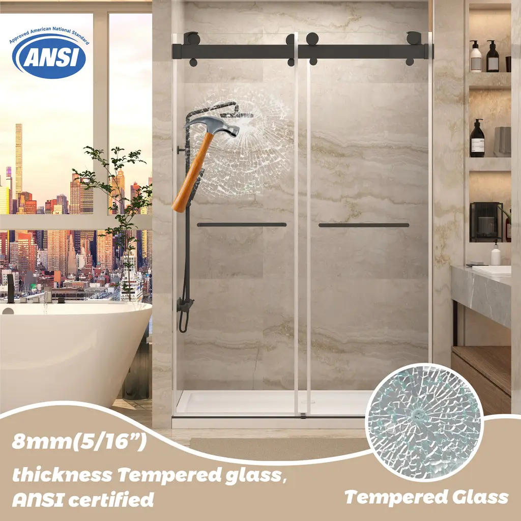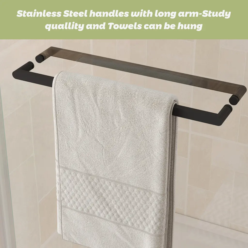 Introducing our state-of-the-art shower enclosure-Double Sliding Frameless Shower Doors, designed with Frameless , without frames blocking the glass makes more light into the shower space. Product make by 5/16” (8mm)thickness Tempered glass, shatter retention glass prevent damage, safe to use. G-Guide rail & Frameless Design provide more smooth and Quite, easy for cleaning, perfect for any model home. Stainless steel towel bar provides the perfect spot to drape your towel.Details:Product make with safe and high quality material: Design with safe, explosion-proof glass that ensures durability and peace of mind. This safety glass construction not only provides robust protection but also maintains a crystal-clear aesthetic, offering a seamless, unobstructed view. Double sliding and super high: 2 Way Opening & Double Sliding design, reversible for left or right-hand installation. Taller standard height of 78". This super high design is suitable for anyone, especially for taller people. Water repellent: The waterproof seal plays its part by meticulously hugging every edge, providing a robust barrier against water leakage. The seal is tough on wet but gentle on style, promising durability without compromising sophistication.Sturdy durable safely :The top support track with extra large bearing capacity offers a stable structure and high safety, can afford maximum 340lbs weight . Rollers and pulls with an anti-jump system create effortless sliding operation. G-Guide rail : This feature is engineered with a bottom guide to ensure anti-jumping, delivering an unprecedented level of stability and safety.Anti-collision mechanism: Guarantees not only controlled motion but also protects the sliding door system from impact damage. This innovative detail enhances its durability while offering a safe glide experience for every user.Easy to Clean:Maintain pristine conditions with minimal effort. Its surface resists water spots and soap scum, making upkeep a breeze.