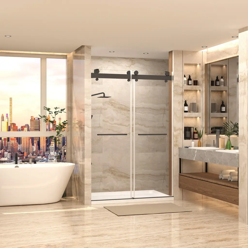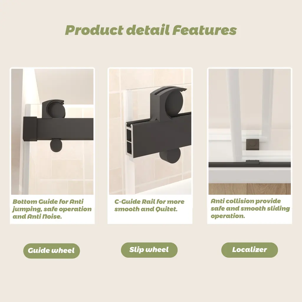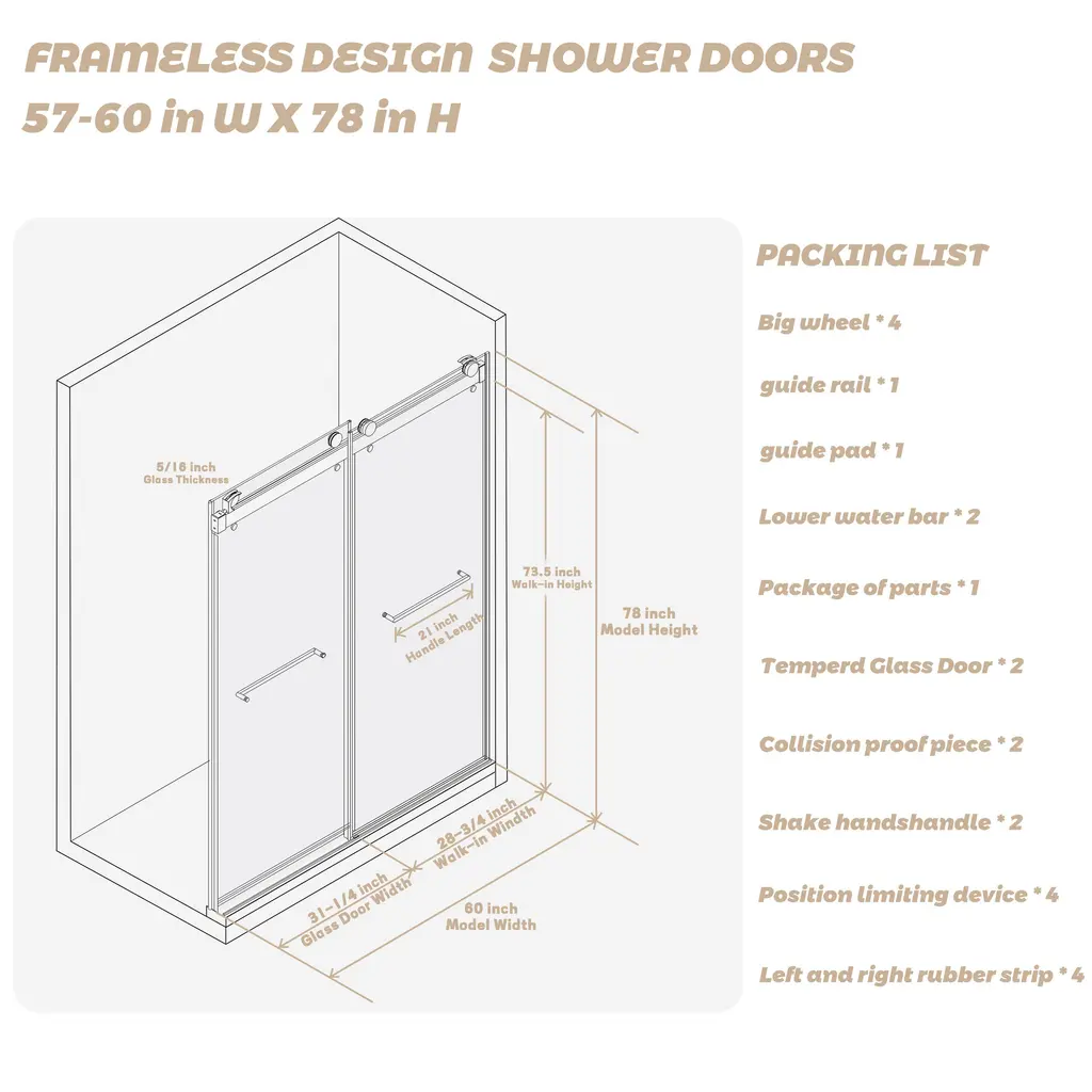 Introducing our state-of-the-art shower enclosure-Double Sliding Frameless Shower Doors, designed with Frameless , without frames blocking the glass makes more light into the shower space. Product make by 5/16” (8mm)thickness Tempered glass, shatter retention glass prevent damage, safe to use. G-Guide rail & Frameless Design provide more smooth and Quite, easy for cleaning, perfect for any model home. Stainless steel towel bar provides the perfect spot to drape your towel.Details:Product make with safe and high quality material: Design with safe, explosion-proof glass that ensures durability and peace of mind. This safety glass construction not only provides robust protection but also maintains a crystal-clear aesthetic, offering a seamless, unobstructed view. Double sliding and super high: 2 Way Opening & Double Sliding design, reversible for left or right-hand installation. Taller standard height of 78". This super high design is suitable for anyone, especially for taller people. Water repellent: The waterproof seal plays its part by meticulously hugging every edge, providing a robust barrier against water leakage. The seal is tough on wet but gentle on style, promising durability without compromising sophistication.Sturdy durable safely :The top support track with extra large bearing capacity offers a stable structure and high safety, can afford maximum 340lbs weight . Rollers and pulls with an anti-jump system create effortless sliding operation. G-Guide rail : This feature is engineered with a bottom guide to ensure anti-jumping, delivering an unprecedented level of stability and safety.Anti-collision mechanism: Guarantees not only controlled motion but also protects the sliding door system from impact damage. This innovative detail enhances its durability while offering a safe glide experience for every user.Easy to Clean:Maintain pristine conditions with minimal effort. Its surface resists water spots and soap scum, making upkeep a breeze.