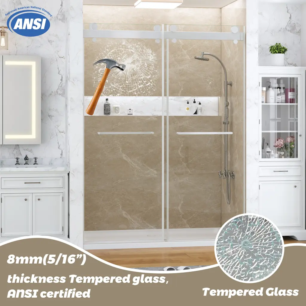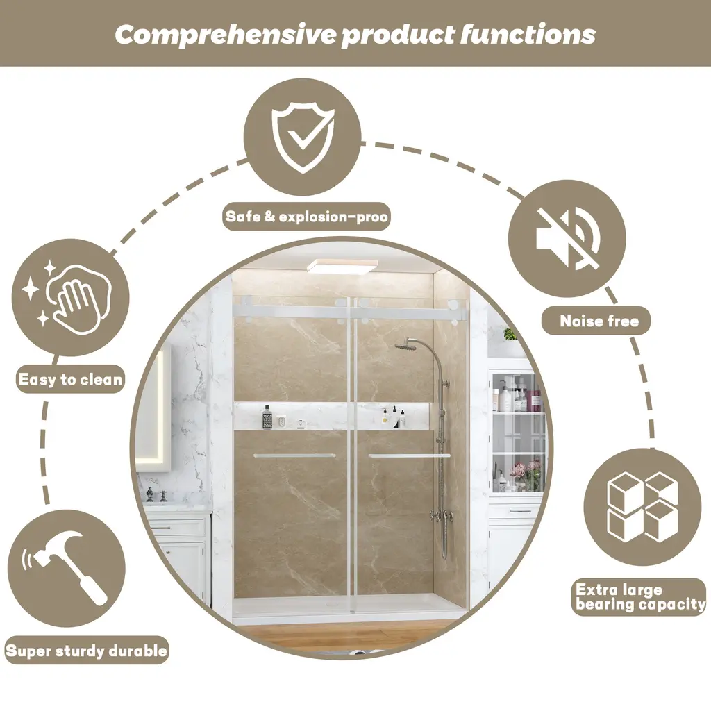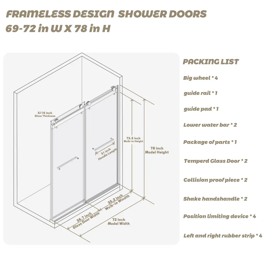 Introducing our state-of-the-art shower enclosure-Double Sliding Frameless Shower Doors, designed with Frameless , without frames blocking the glass makes more light into the shower space. Product make by 5/16” (8mm)thickness Tempered glass, shatter retention glass prevent damage, safe to use. G-Guide rail & Frameless Design provide more smooth and Quite, easy for cleaning, perfect for any model home. Stainless steel towel bar provides the perfect spot to drape your towel.Details:Product make with safe and high quality material: Design with safe, explosion-proof glass that ensures durability and peace of mind. This safety glass construction not only provides robust protection but also maintains a crystal-clear aesthetic, offering a seamless, unobstructed view. Double sliding and super high: 2 Way Opening & Double Sliding design, reversible for left or right-hand installation. Taller standard height of 78". This super high design is suitable for anyone, especially for taller people. Water repellent: The waterproof seal plays its part by meticulously hugging every edge, providing a robust barrier against water leakage. The seal is tough on wet but gentle on style, promising durability without compromising sophistication.Sturdy durable safely :The top support track with extra large bearing capacity offers a stable structure and high safety, can afford maximum 340lbs weight . Rollers and pulls with an anti-jump system create effortless sliding operation. G-Guide rail : This feature is engineered with a bottom guide to ensure anti-jumping, delivering an unprecedented level of stability and safety.Anti-collision mechanism: Guarantees not only controlled motion but also protects the sliding door system from impact damage. This innovative detail enhances its durability while offering a safe glide experience for every user.Easy to Clean:Maintain pristine conditions with minimal effort. Its surface resists water spots and soap scum, making upkeep a breeze.