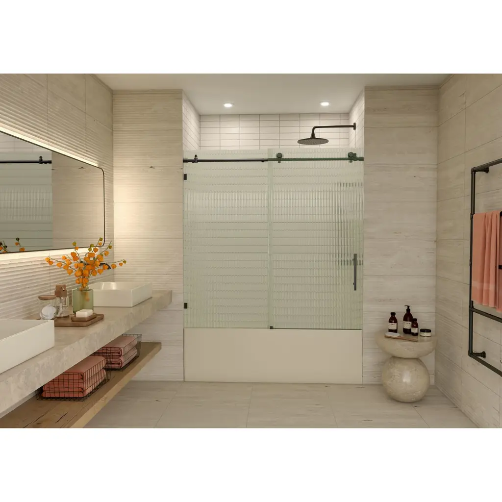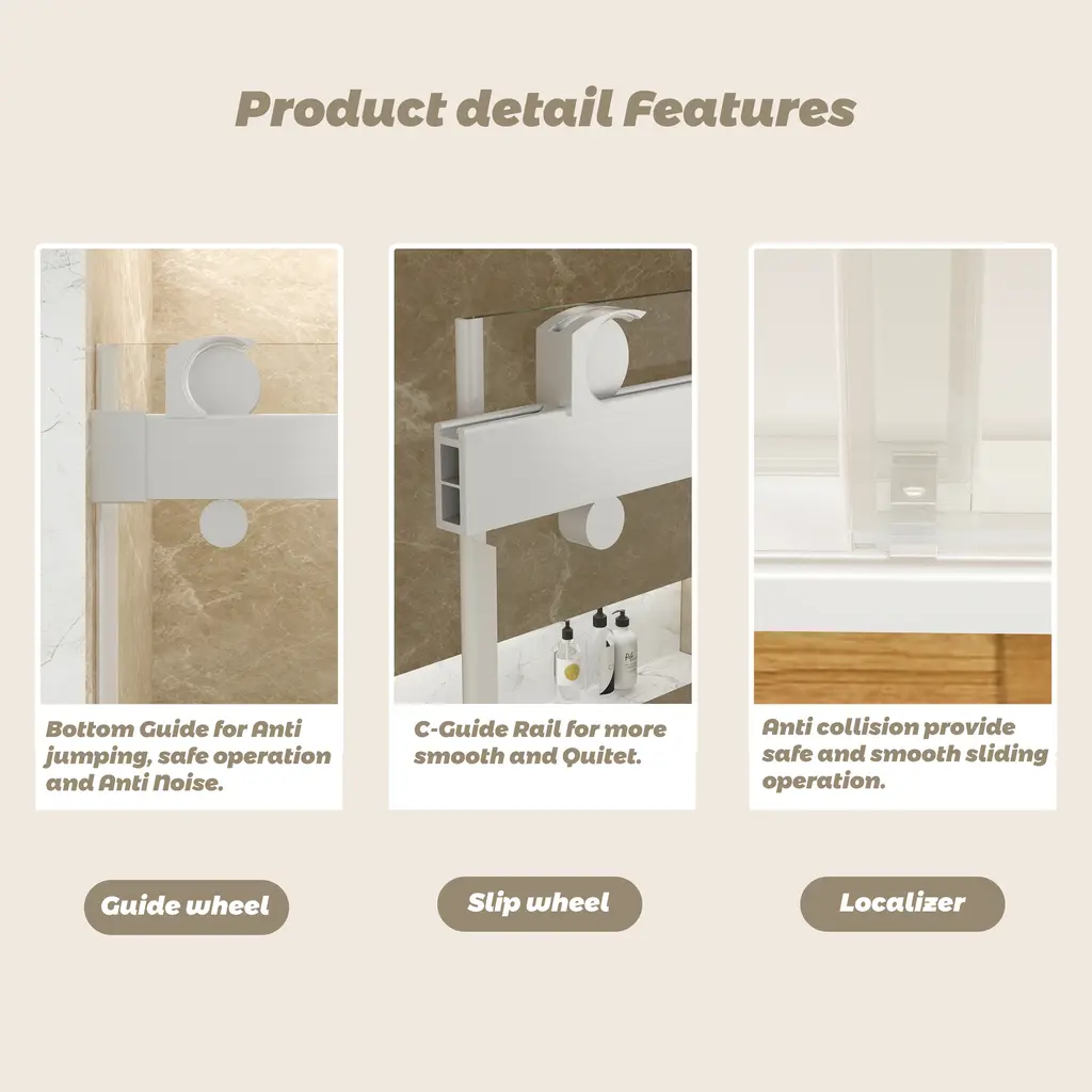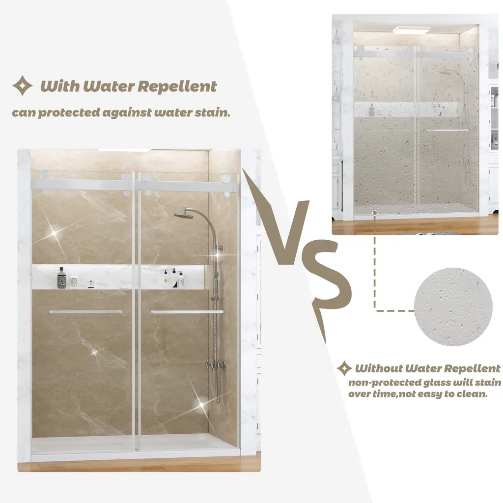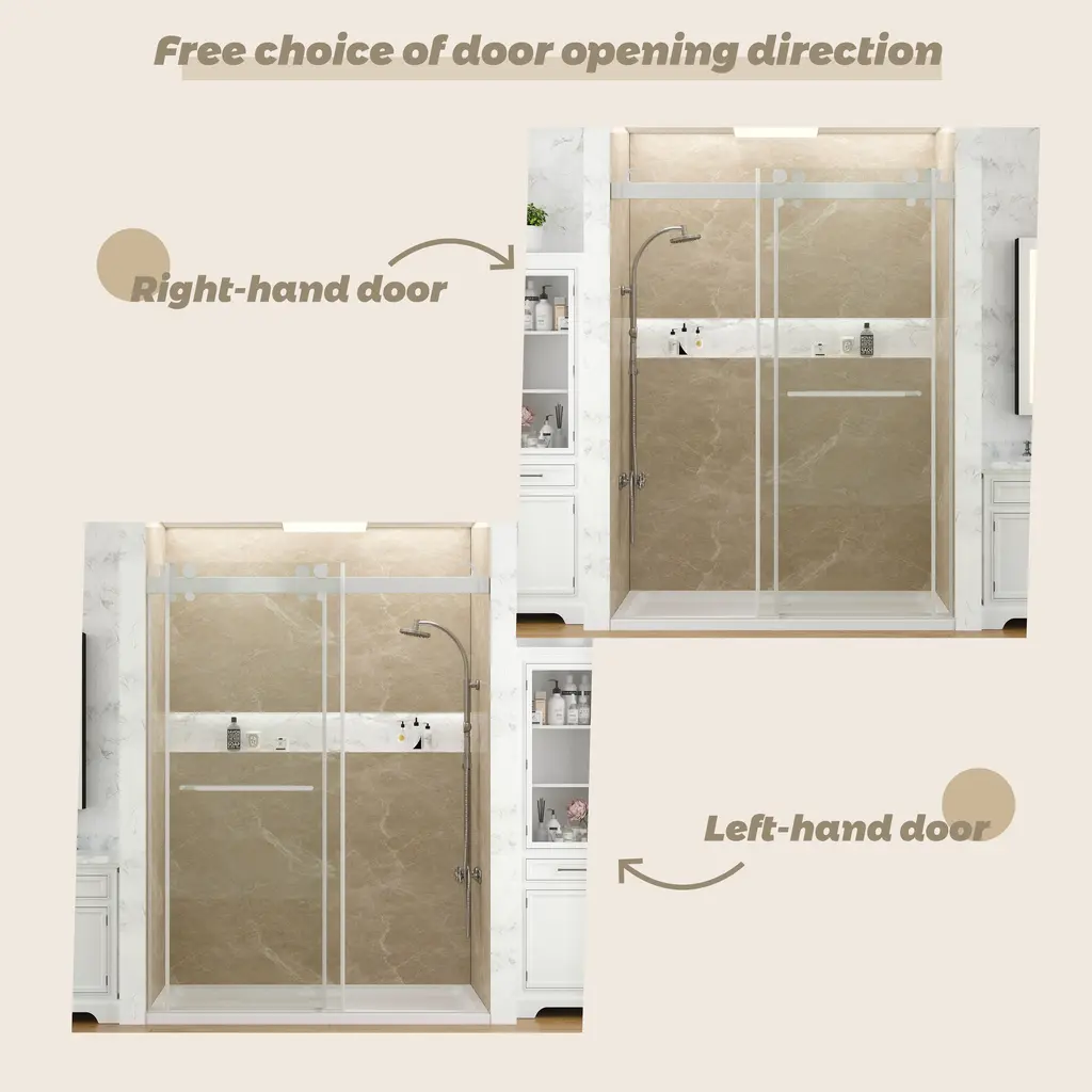Introducing our state-of-the-art shower enclosure-Double Sliding Frameless Shower Doors, designed with Frameless , without frames blocking the glass makes more light into the shower space. Product make by 5/16” (8mm)thickness Tempered glass, shatter retention glass prevent damage, safe to use. G-Guide rail & Frameless Design provide more smooth and Quite, easy for cleaning, perfect for any model home. Stainless steel towel bar provides the perfect spot to drape your towel.Details:Product make with safe and high quality material: Design with safe, explosion-proof glass that ensures durability and peace of mind. This safety glass construction not only provides robust protection but also maintains a crystal-clear aesthetic, offering a seamless, unobstructed view. Double sliding and super high: 2 Way Opening & Double Sliding design, reversible for left or right-hand installation. Taller standard height of 78". This super high design is suitable for anyone, especially for taller people. Water repellent: The waterproof seal plays its part by meticulously hugging every edge, providing a robust barrier against water leakage. The seal is tough on wet but gentle on style, promising durability without compromising sophistication.Sturdy durable safely :The top support track with extra large bearing capacity offers a stable structure and high safety, can afford maximum 340lbs weight . Rollers and pulls with an anti-jump system create effortless sliding operation. G-Guide rail : This feature is engineered with a bottom guide to ensure anti-jumping, delivering an unprecedented level of stability and safety.Anti-collision mechanism: Guarantees not only controlled motion but also protects the sliding door system from impact damage. This innovative detail enhances its durability while offering a safe glide experience for every user.Easy to Clean:Maintain pristine conditions with minimal effort. Its surface resists water spots and soap scum, making upkeep a breeze.