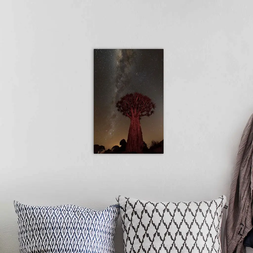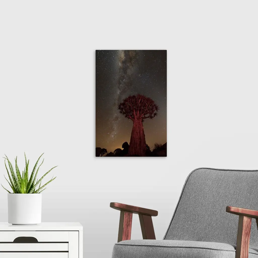 An African Quiver Tree at night, with the Milky Way Galaxy visible in the sky overhead.