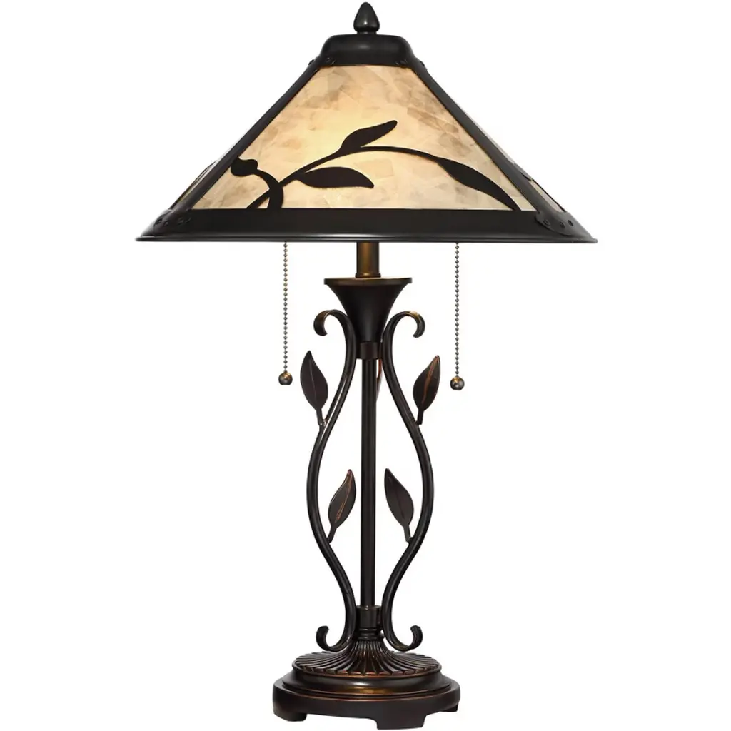This beautifully designed table lamp will grab attention in your home decor. The Americana inspired table lamp features a bronze color base with embossed pine branch motif. A soft green mica shade with a wicker overlay adds a charming style to the lamp. The shade is fashioned from the naturally occurring mica mineral. Slight variations due to the natural tone and pattern of the mineral make each shade unique.