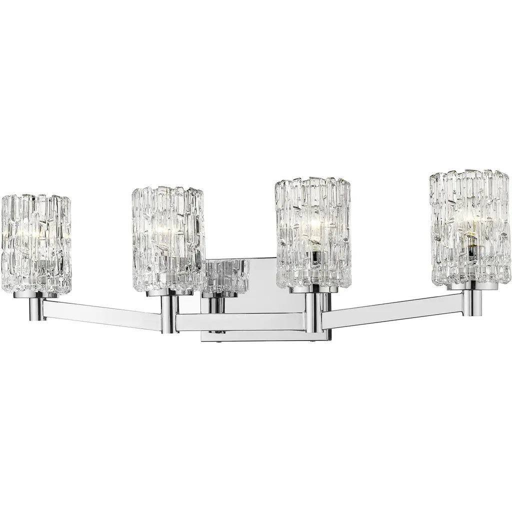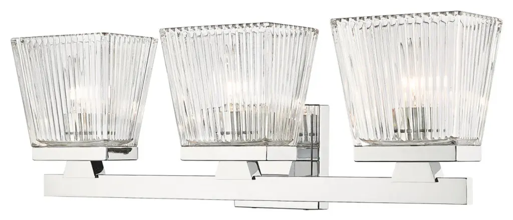 Features: Constructed from steel Includes clear ribbed acrylic shades Requires (3) G9 10 watt bulbs (not included) Capable of being dimmed Can be mounted to provide up or down lighting ETL listed for damp locations Covered by Quoizel's 1 year limited manufacturer warranty Dimensions: Height: 7-3/4" Width: 21-1/2" Extension: 5-1/2" Product Weight: 5.54 lbs Shade Height: 4-1/2" Shade Width: 5" Backplate Height: 5" Backplate Width: 5" Backplate Depth: 3/4" Electrical Specifications: Max Wattage: 30 watts Number of Bulbs: 3 Watts Per Bulb: 10 watts Bulb Base: G9 Voltage: 120 volts Bulbs Included: No