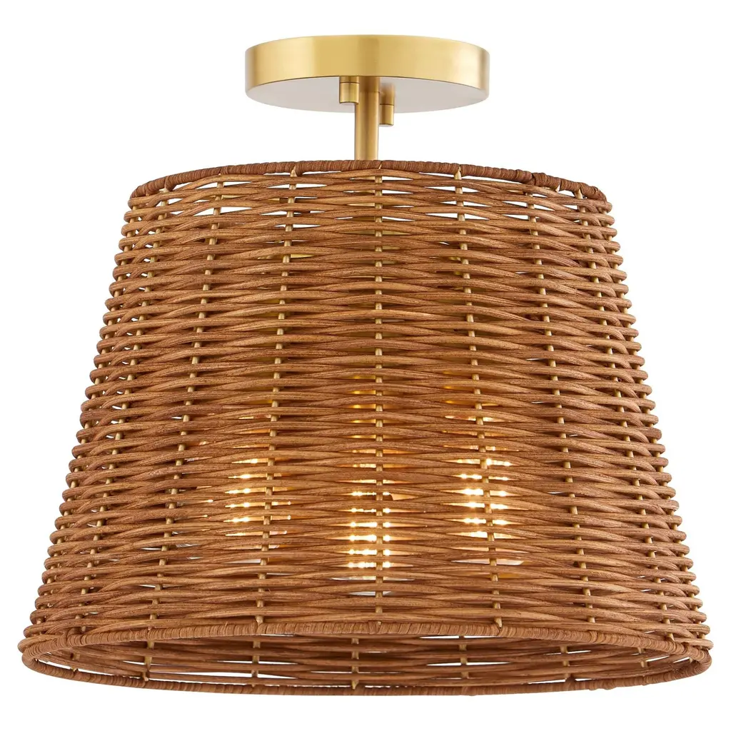 The Wicker series is a premier lighting solution for any boho-chic or modern farmhouse design. A classic cane weave. The espresso-finished 13-inch tapered drum shade houses three 60-watt medium-base sockets.Features:Dimensions:Electrical Specifications: