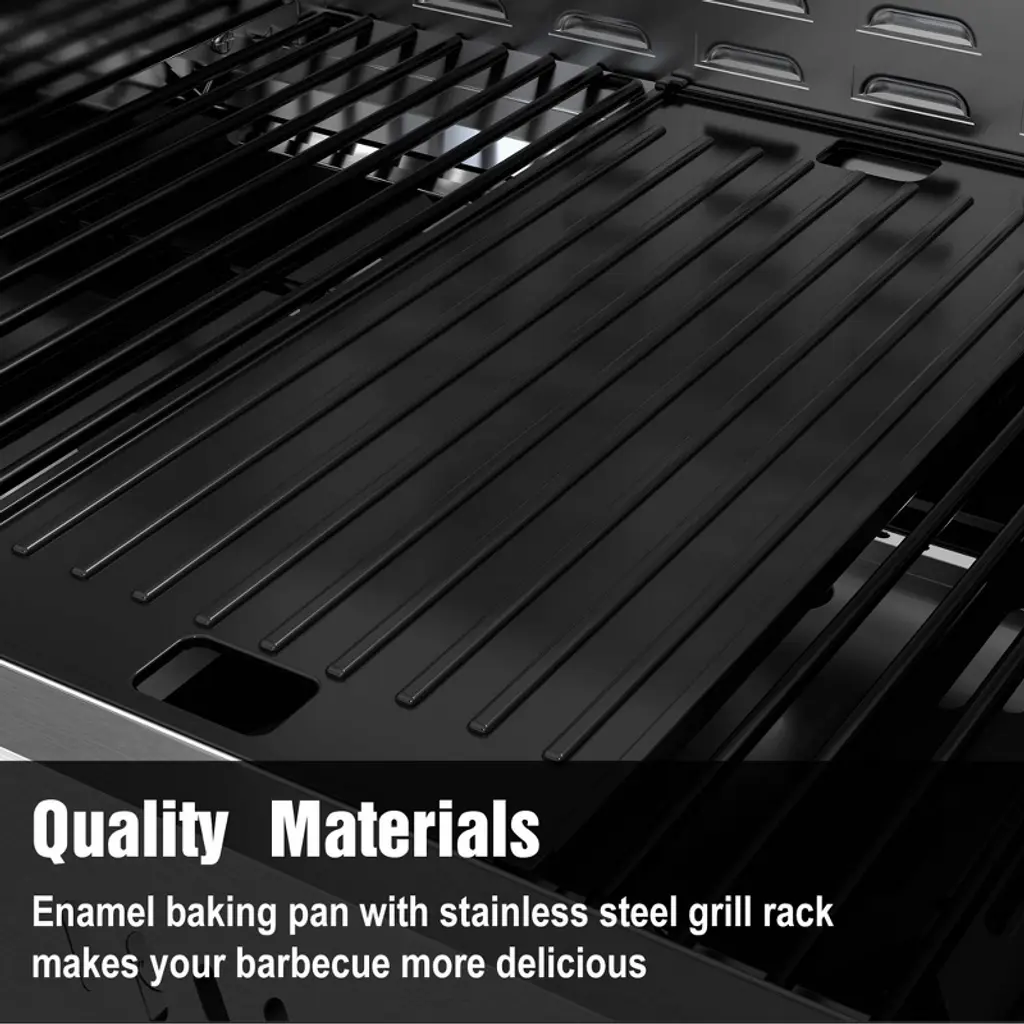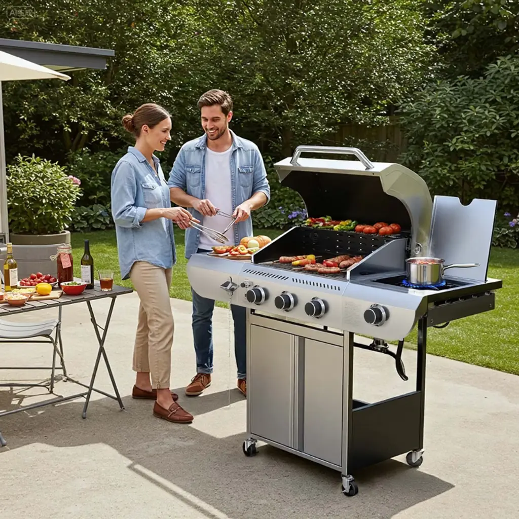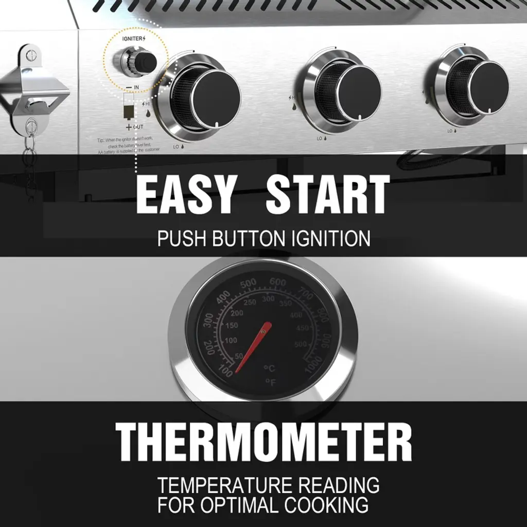 Experience professional grilling with this heavy-duty 34,000 BTU stainless steel BBQ featuring three 8,000 BTU main burners and a 10,000 BTU side burner. The durable 201 stainless steel construction resists rust while the pulse ignition ensures quick starts. Enjoy spacious 565x410mm grilling with included cast iron tray, plus convenient warming rack and tool storage. Moves easily on lockable wheels. Backed by 2-year warranty.
