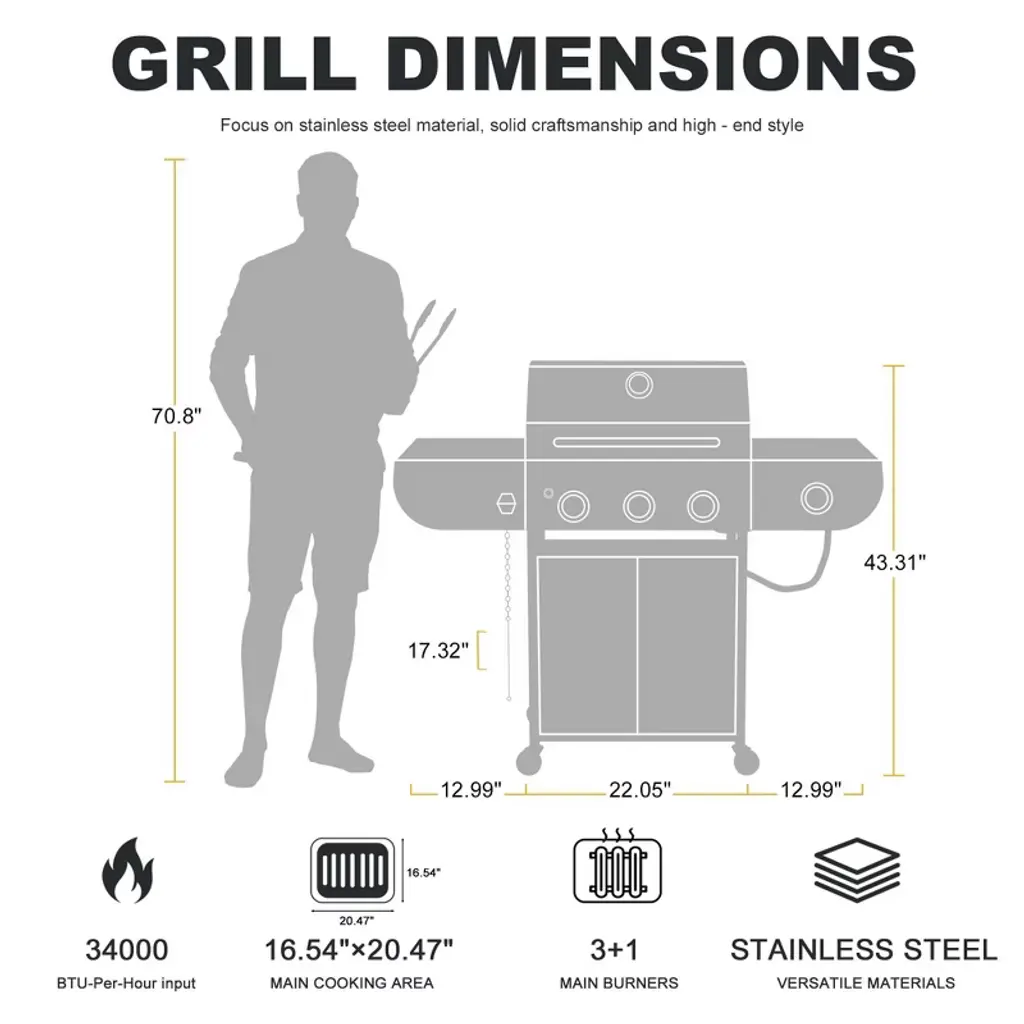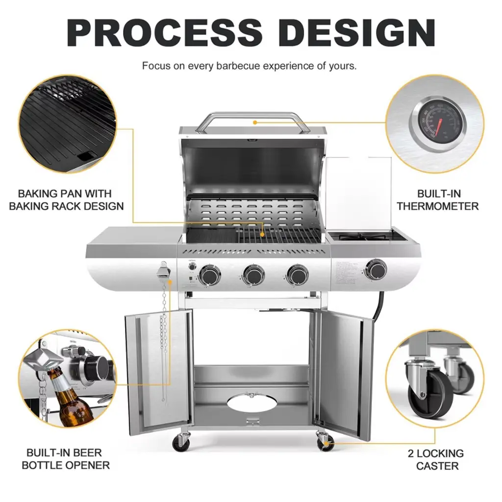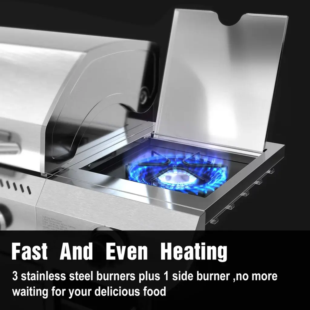 R.w.flame 3 Burner Plus Side Burner Stainless Steel Bbq Grill With 34000 Btu Output Pulse Ignition And Universal Wheels