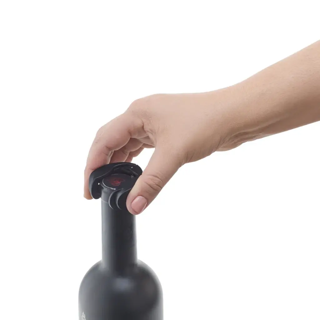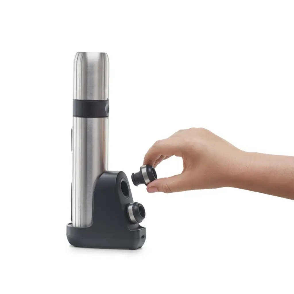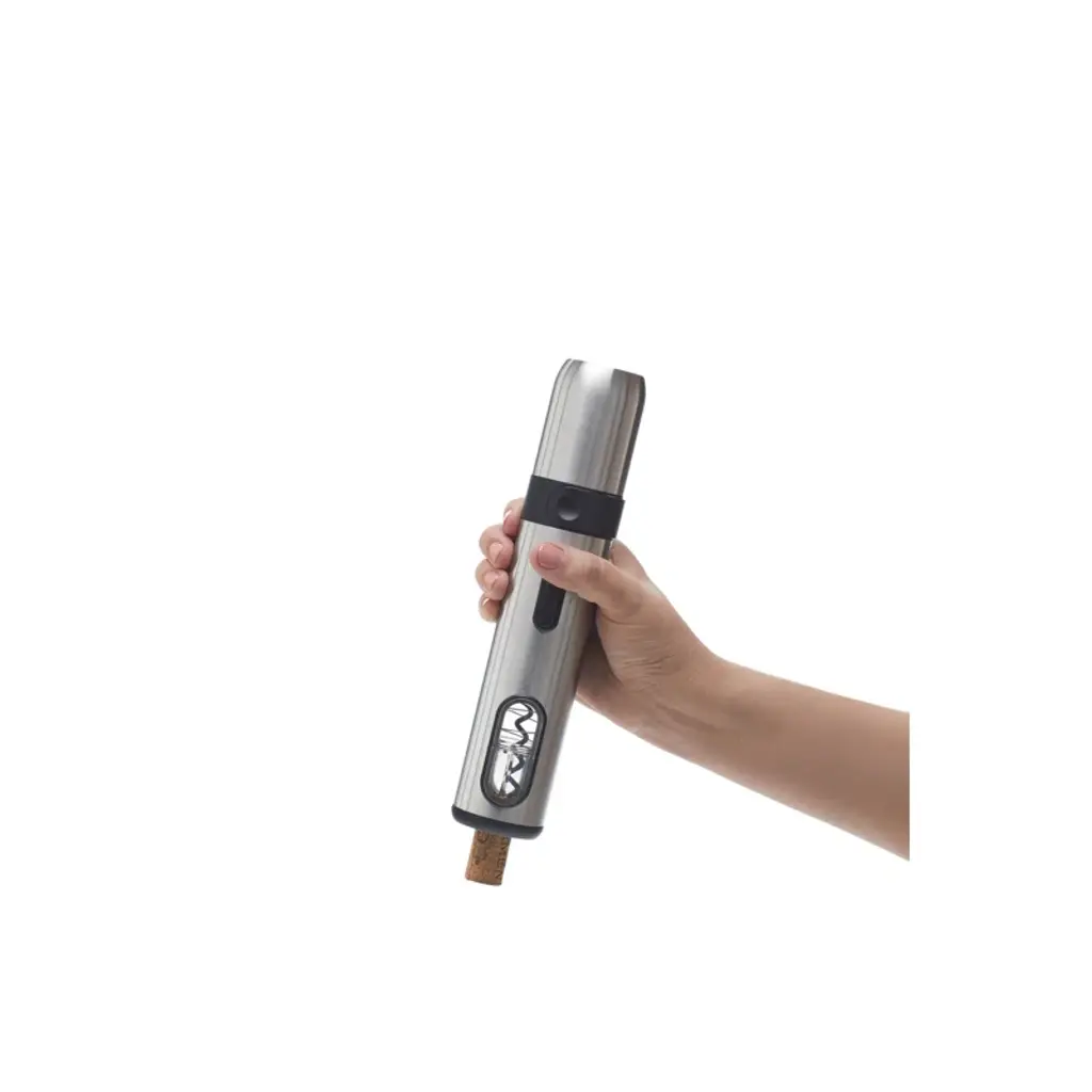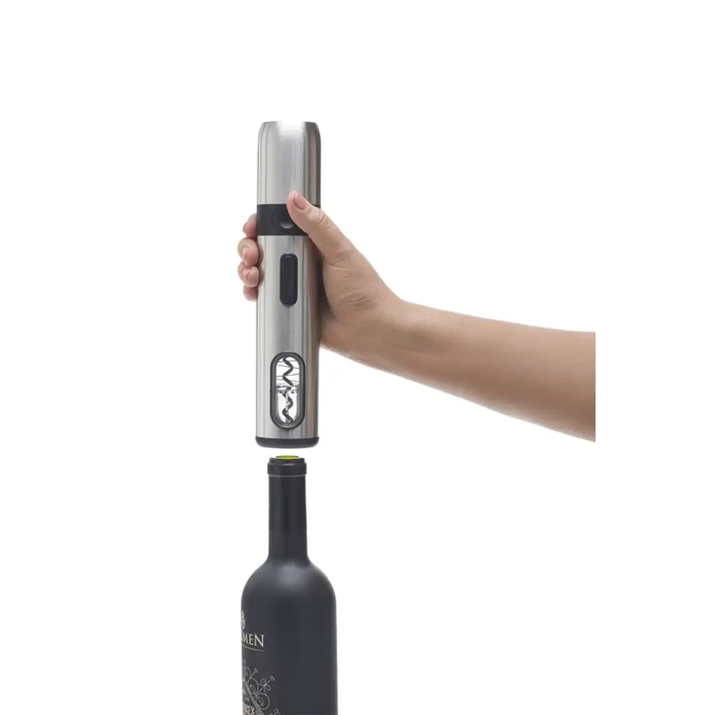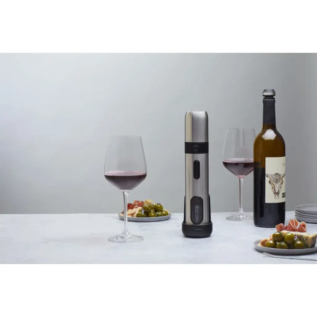 Stainless Steel all-in-one foil cutter electric corkscrew and preserver. Rechargeable base holds two preserver stoppers. Integrated manual foil cutter fits seamlessly into body. Clear window to see cork as it is removed from bottle. Wipe clean.
