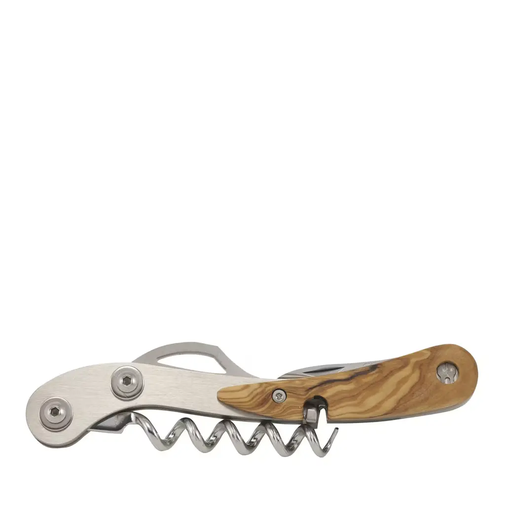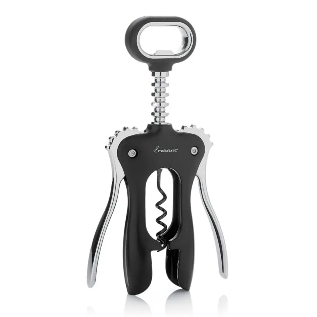 Foolproof and efficient, the winged corkscrew is a bar essential. Simply position the opener over the bottle, twist the handle to insert the auger into the cork and raise the opener's wings. Using both hands, push the wings down. To remove the cork from the spiral, squeeze the sides against the cork and turn the handle counter-clockwise.