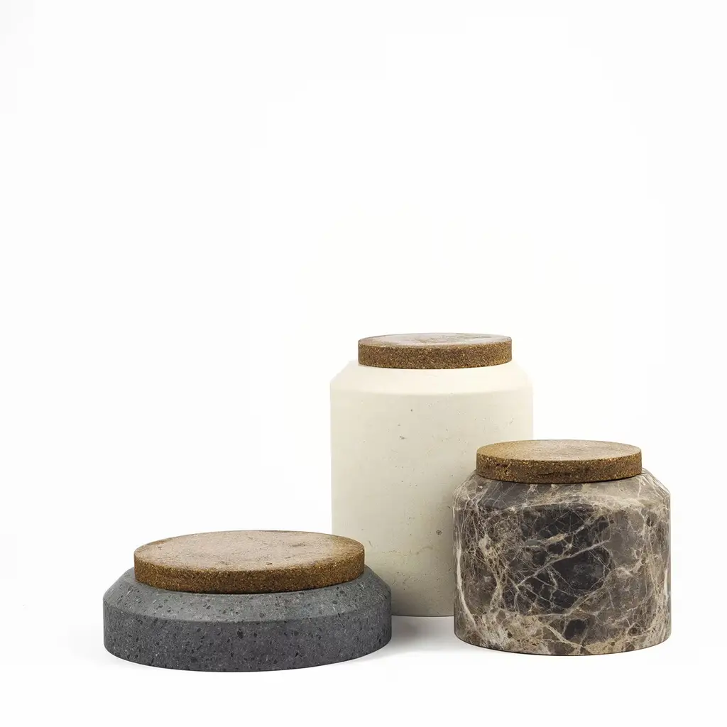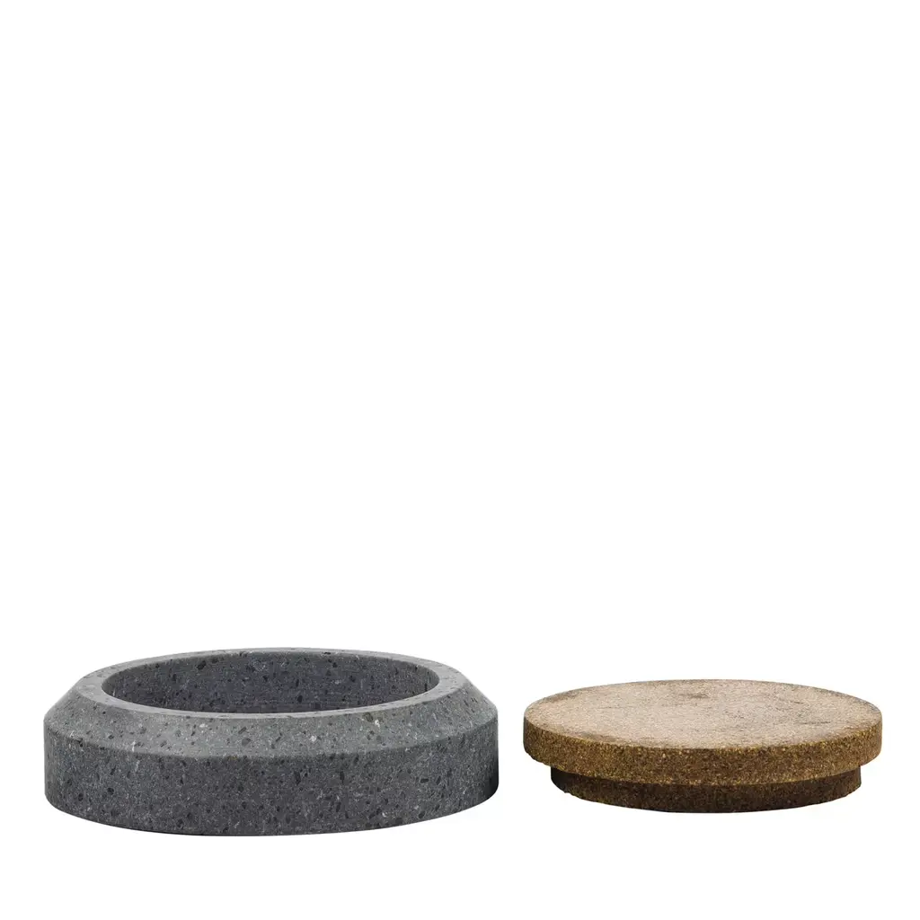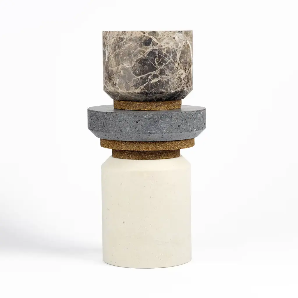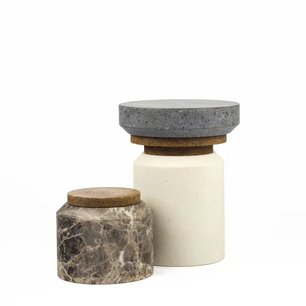 A collection composed of three storage elements in Trani Stone, Lavic Stone and Emperador Light with a lid in Keep Life; a new composite material, ecological and malleable, made from the shells of hazelnuts, chestnuts, walnuts, almonds, pistachios and peanuts etc, free from solvents and formaldehyde. Enclosed in time, the container becomes stone and the contents its seal.