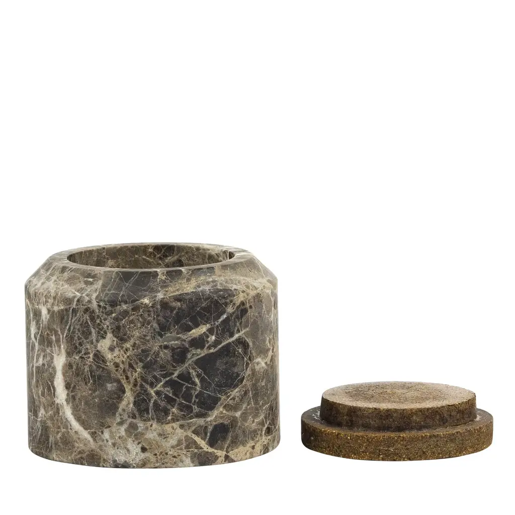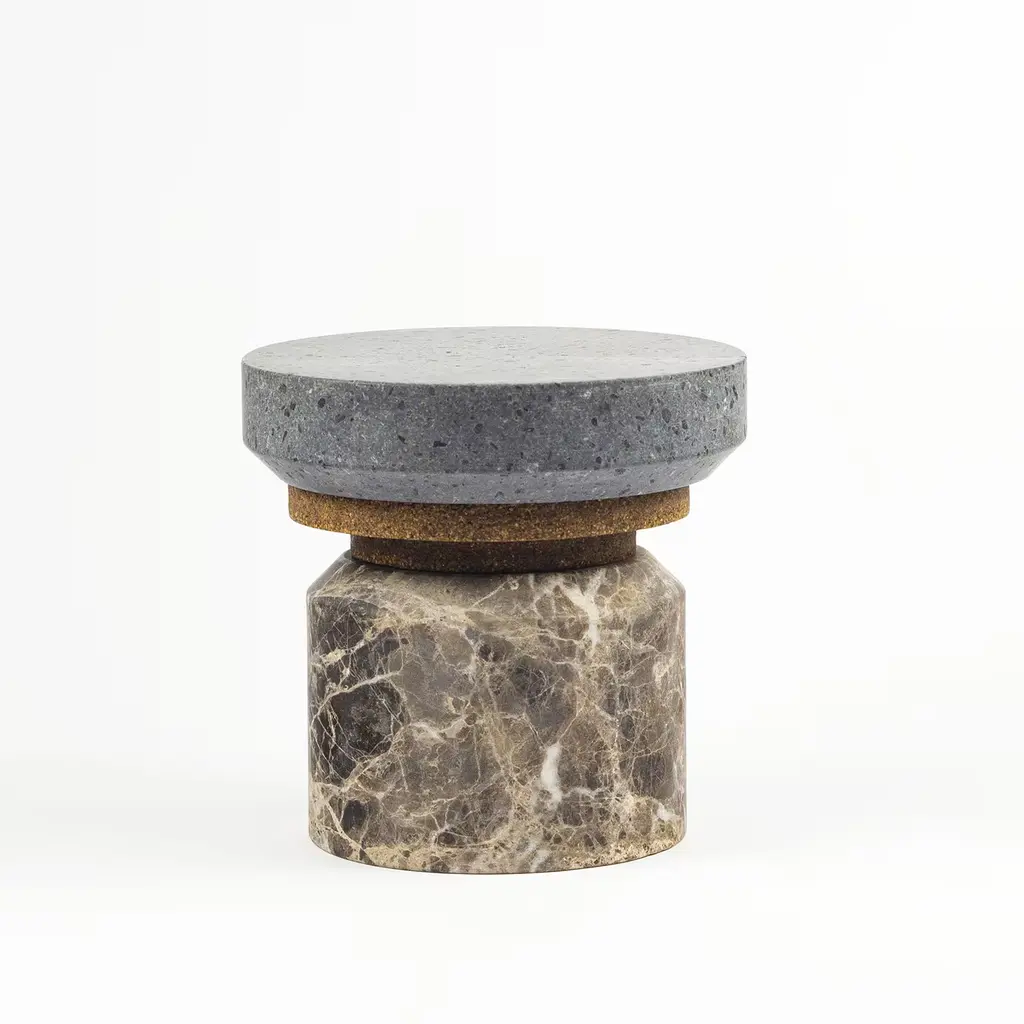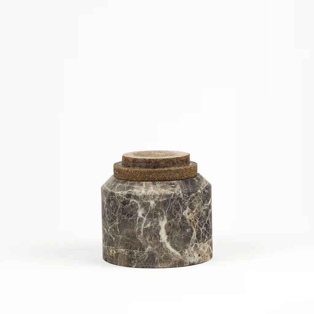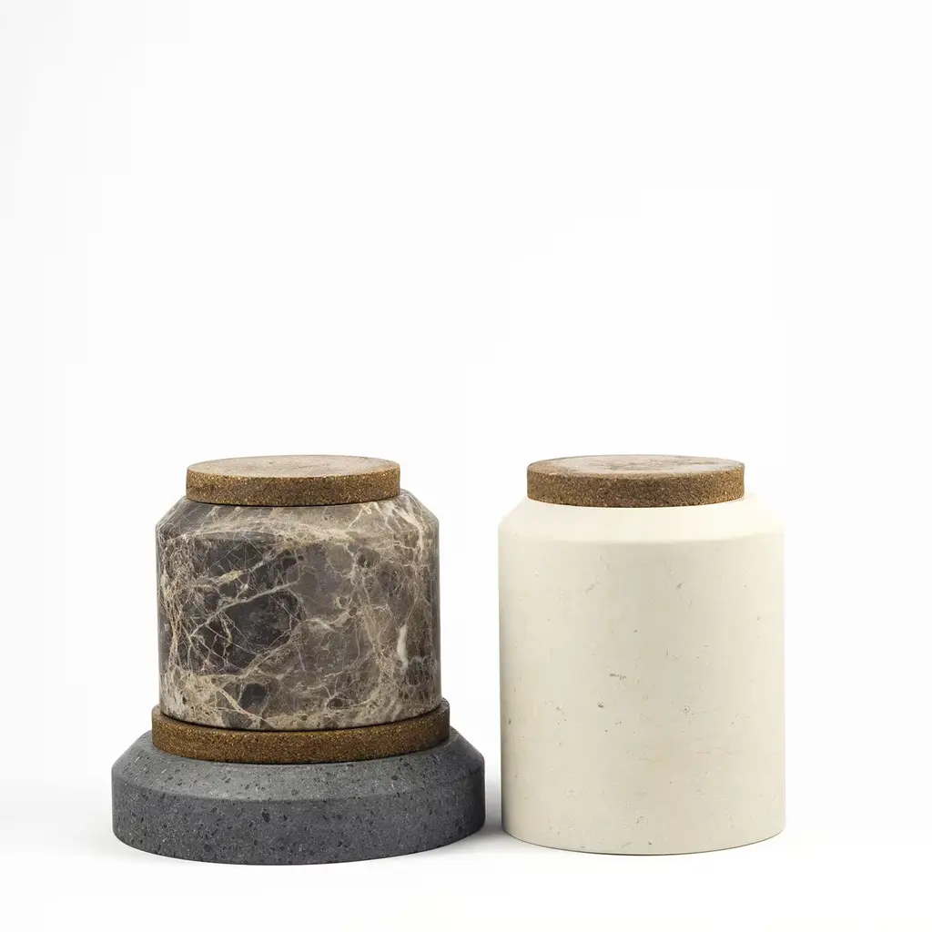 This exquisite collection is composed of three storage elements in Trani Stone, Lavic Stone and Emperador Light with a lid in Keep Life; a new composite material, ecological and malleable, made from the shells of hazelnuts, chestnuts, walnuts, almonds, pistachios and peanuts etc, free from solvents and formaldehyde. This storage elements offers character and functionality to any living space.