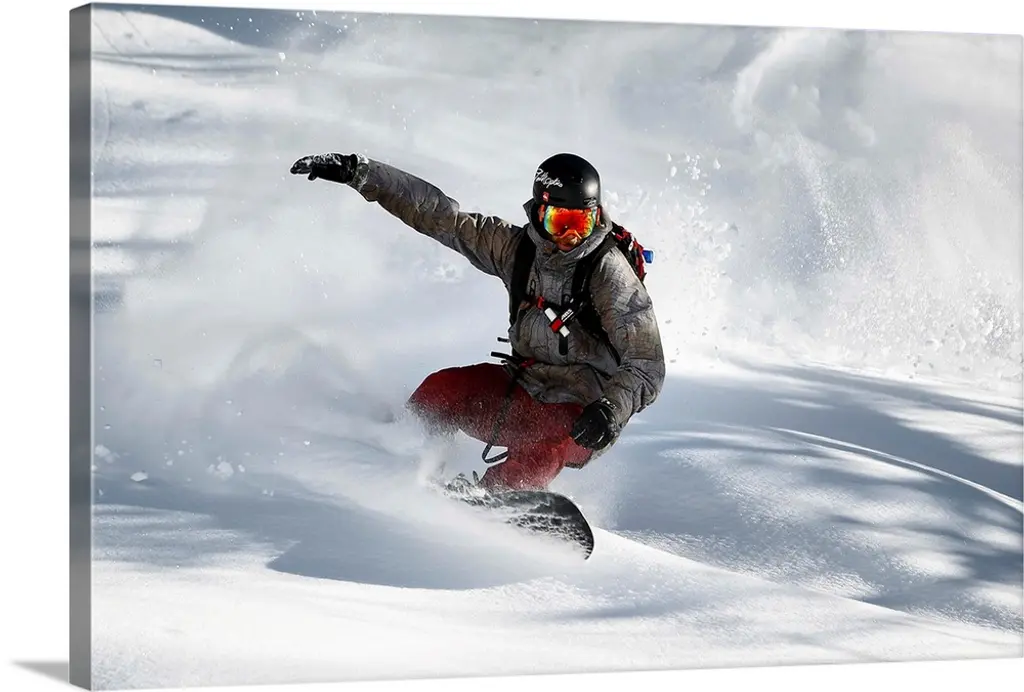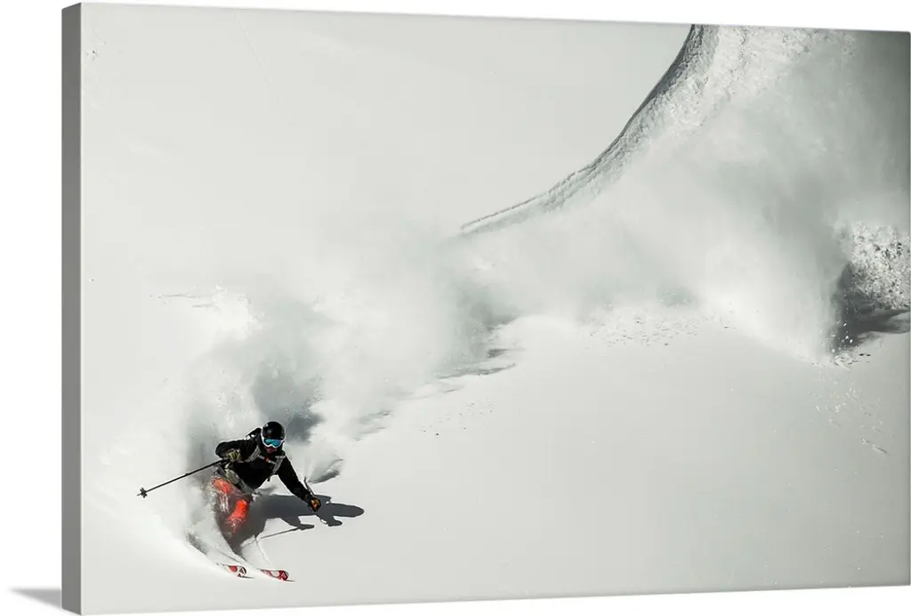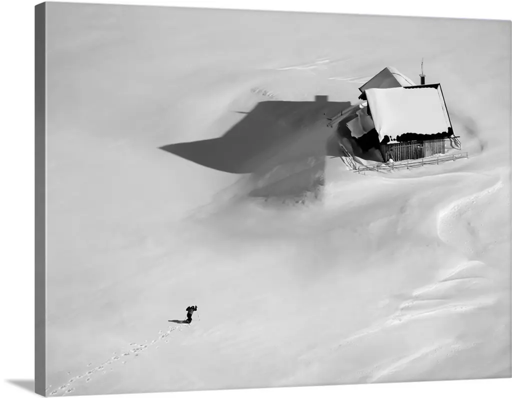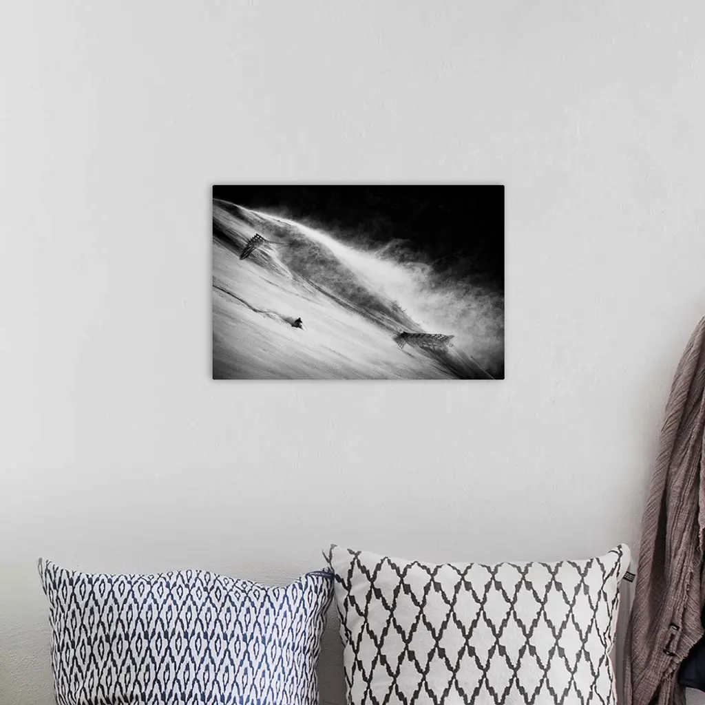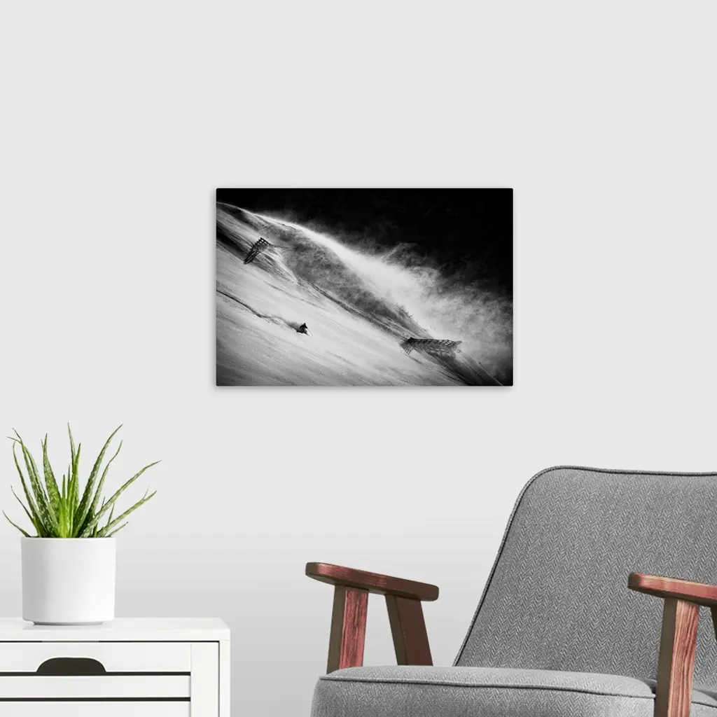 A skier heads down a slope past wooden fences, with wind blowing snow into the air.