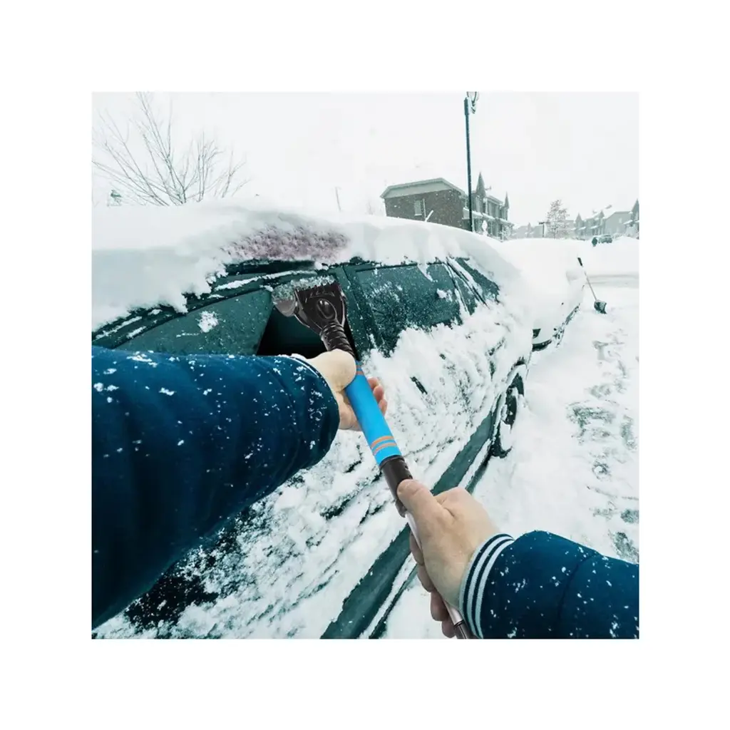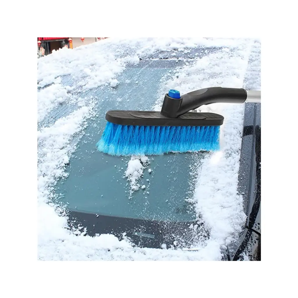 Stout & Lightweight*:Made of high-quality PVC; the brittles of the brush are durable but will not scratch your car surface. The lightweight design enables you to use it one-handed. *21.65in-27.56in Extendable Rod*:The rod extends from 21.65in to 27.56in offering your more room to operate. You can easily reach the center of the windshield or the roof without moving around. *360 Degree Pivoting Head*:Press the button in the middle of the brush to adjust the direction of the head. You can lock it in a horizontal or vertical direction for easy use. No more dead corner left. *Comfortable & Non-slip*:The foam handle feels comfortable and warm in cold winter. Long-time usage is no longer horrible. Besides; it will not slip out of your hand easily; efficient and convenient. *Space-saving*:The product comes with three separate units-brush; extendable rod and scraper; for easier storage when not in use. Easy to assemble and disassemble.