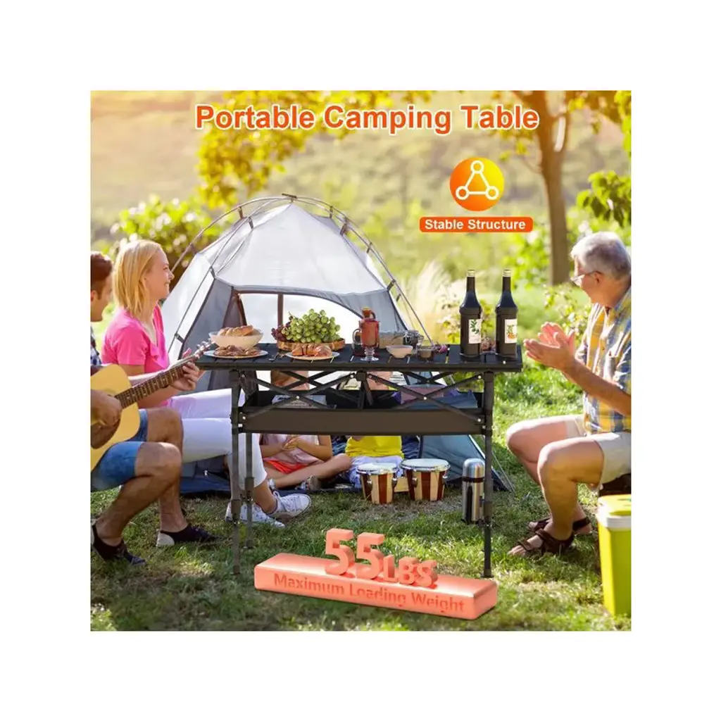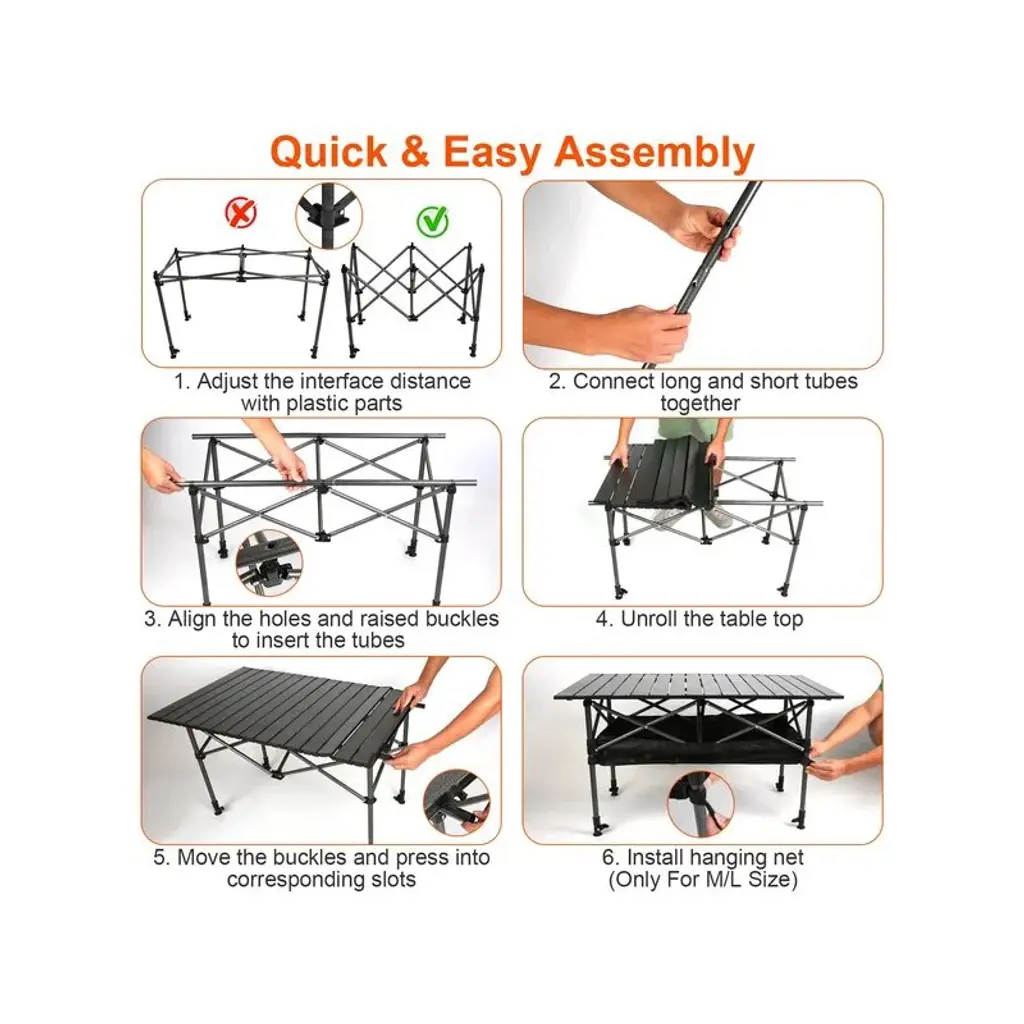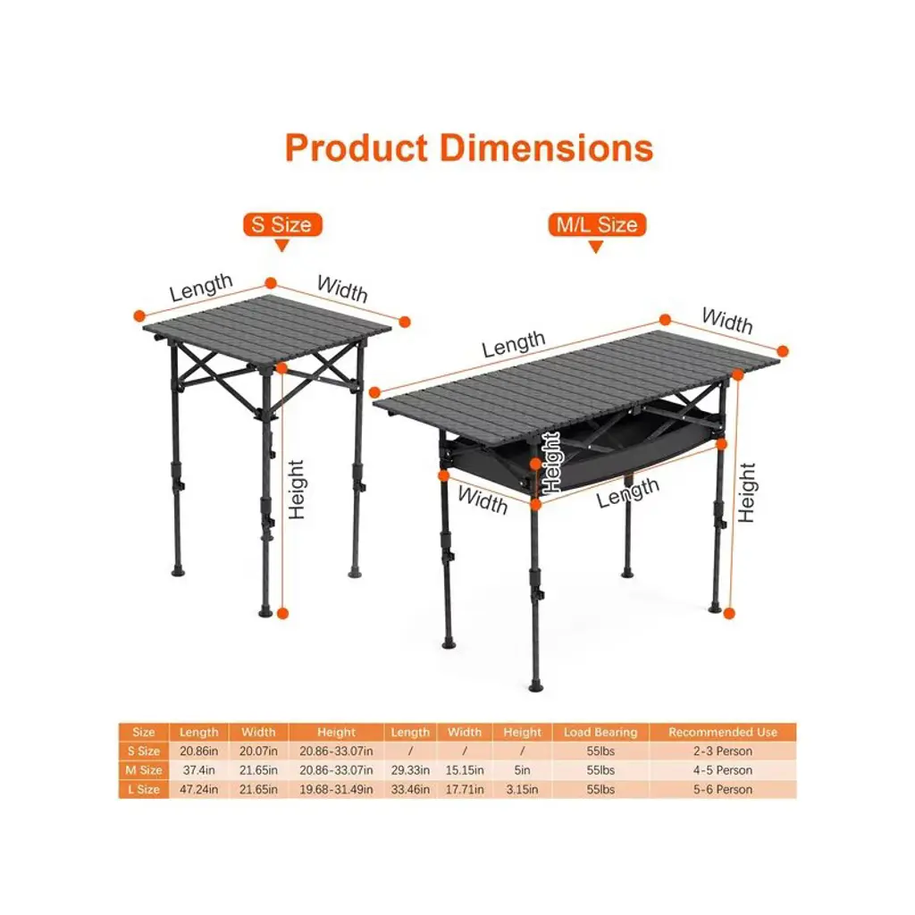 *Specifications*: ? Product Type: Foldable Camping Table Material: Carbon Steel, Oxford Cloth Color: Black Size Option: S Size(For 2-3Person)/M Size(For 4-5Person)/L Size(For 5-6Person) Load Bearing Capacity: 25kg/55lbs S-Size Adjustable Height: 53-84cm/20.86-33.07in M-Size Adjustable Height: 53-84cm/20.86-33.07in L-Size Adjustable Height: 50-80cm/19.68-31.49in M-Size Hanging Net Size: 74.5*38.5*12.7cm/29.33*15.15*5in L-Size Hanging Net Size: 85*45*8cm/33.46*17.71*3.15in S-Size Table Size: 51*53*53-84cm/20.07*20.86*20.86-33.07in S-Size Table Weight: 2193g/4.83lbs M-Size Table Size: 95*55*53-84cm/37.4*21.65*20.86-33.07in M-Size Table Weight: 3.75kg/8.26lbs L-Size Table Size: 120*55*50-80cm/47.24*21.65*19.68-31.49in L-Size Table Weight: 3.85kg/8.48lbs S-Size Package Size: 16*15*55cm/6.29*5.91*21.65in S-Size Package Weight: 2555g/5.63lbs M-Size Package Size: 60*23*16cm/23.62*9.05*6.29in M-Size Package Weight: 4059g/8.94lbs L-Size Package Size: 68*23*18cm/24.8*9.05*7.08in L-Size Package Weight: 4833g/10.65lbs