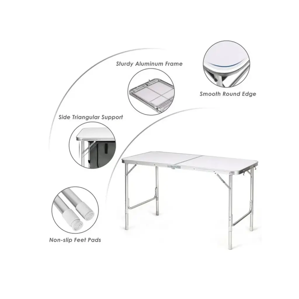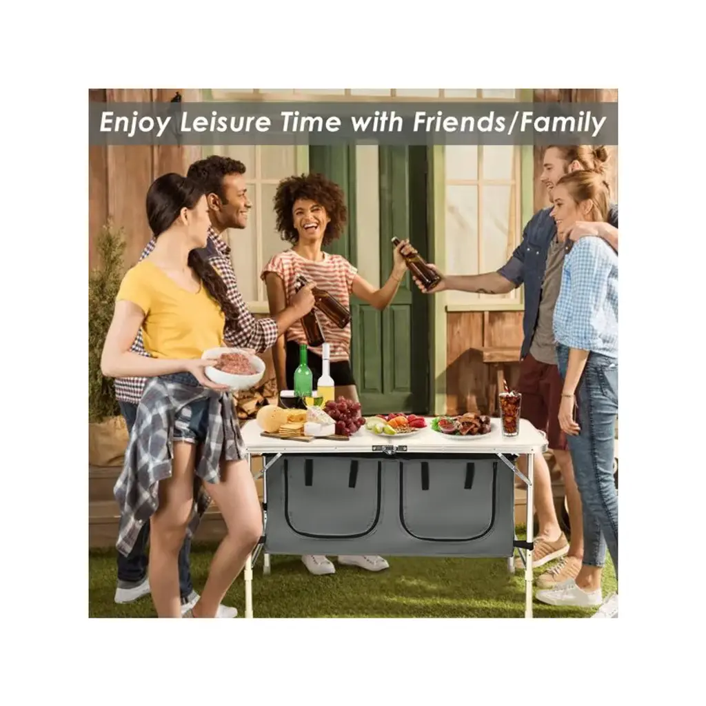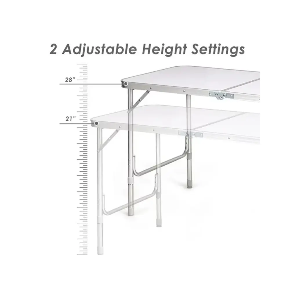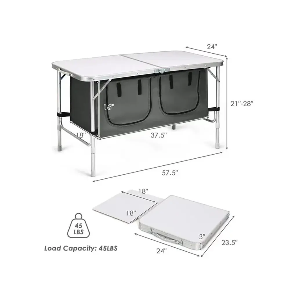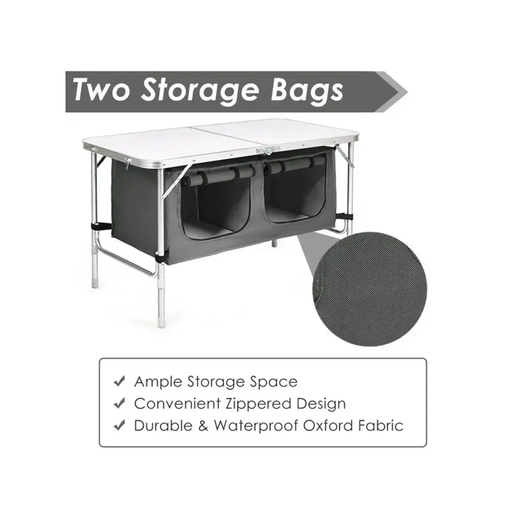 Overview The foldable design and compact size make the tables very easy to carry and transport. If you are looking for a table like that, don't hesitate to buy it. Foldable design simplifies the installation process 2 different heights are available Light weight and compact size make it easy to carry and store Triangular structure and reinforced beams enhance the load-bearing capacity Premium aluminum and wear-resistant Oxford cloth to extend the service life Large capacity lockers can be used to store large quantities of food, tableware, etc Premium aluminum and strong structure enable it to bear up to 45lbs Waterproof surface simplifies the cleaning process Multi-purpose table for picnic, barbecue, party, camping