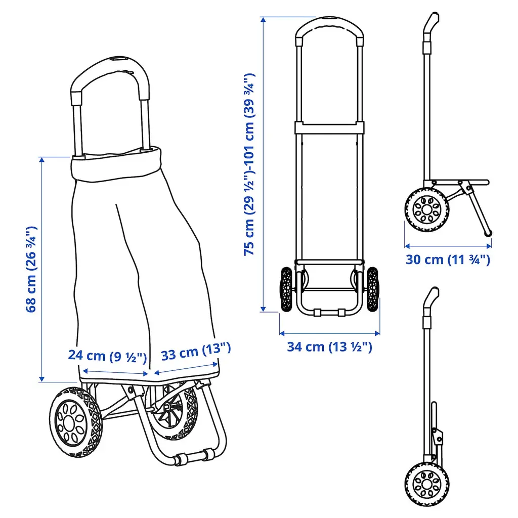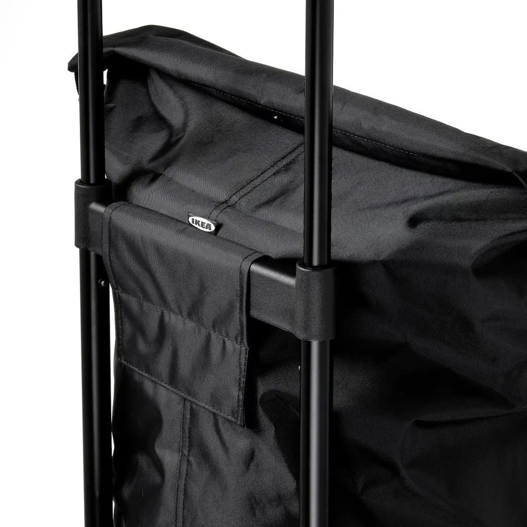 RADARBULLE Shopping bag with wheels - black 13x9 ½x26 ¾ "/1285 oz. The handle has two adjustable positions. You can adjust the closure according to how much you fill the bag, and the two buttons hold the contents in place. Sit securely because there is a support at the bottom.