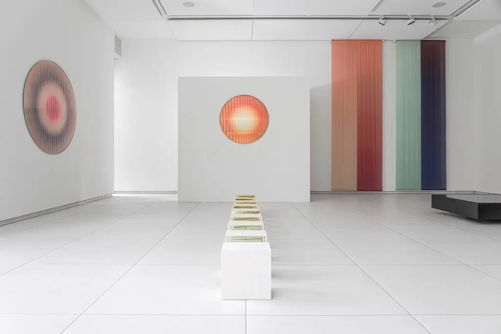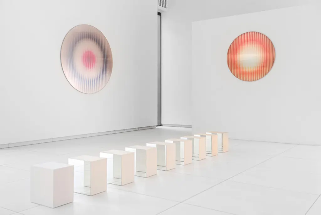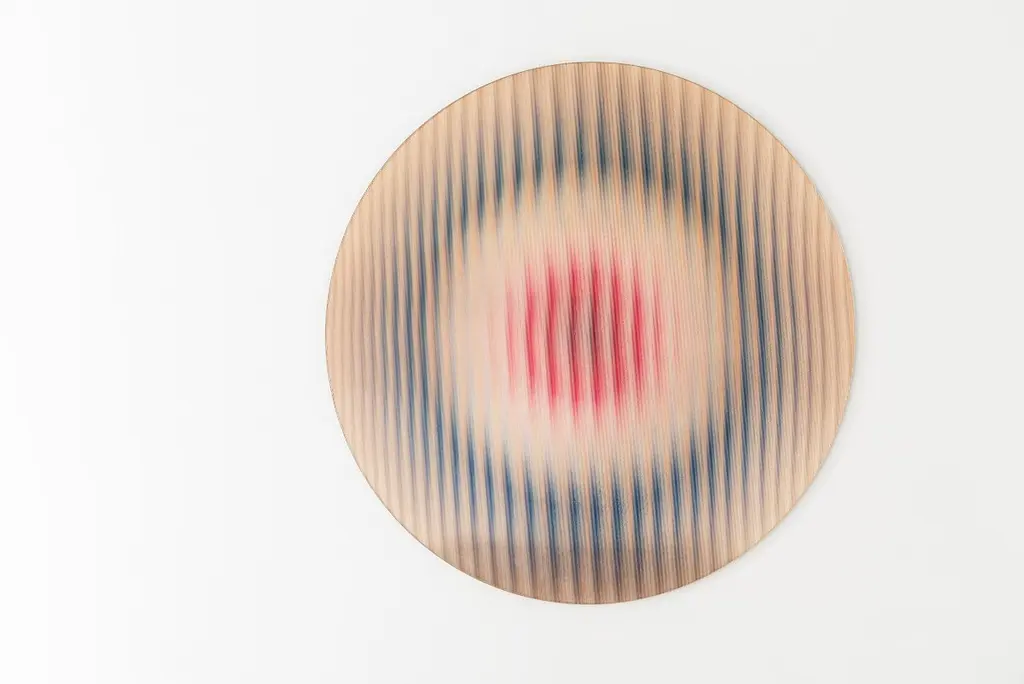 Through its highly detailed structured glass surface, the panel absorbs and emits light, changing its color it through an intricately detailed colored layer under the glass surface.The structure of the glass in combination with the mirror backing make that the radiance panels absorb and then redistribute light as if it was light emitting. Normal reflections are not visible in the panel, however light travels and bounces, recoloured and redirected by the panel.The quartz panel contains a variety of soft nude tones with accents of vivid fuchsia in the middle.Item is typically shipped in a custom wooden art crate which will be quoted separately with the shipping cost.